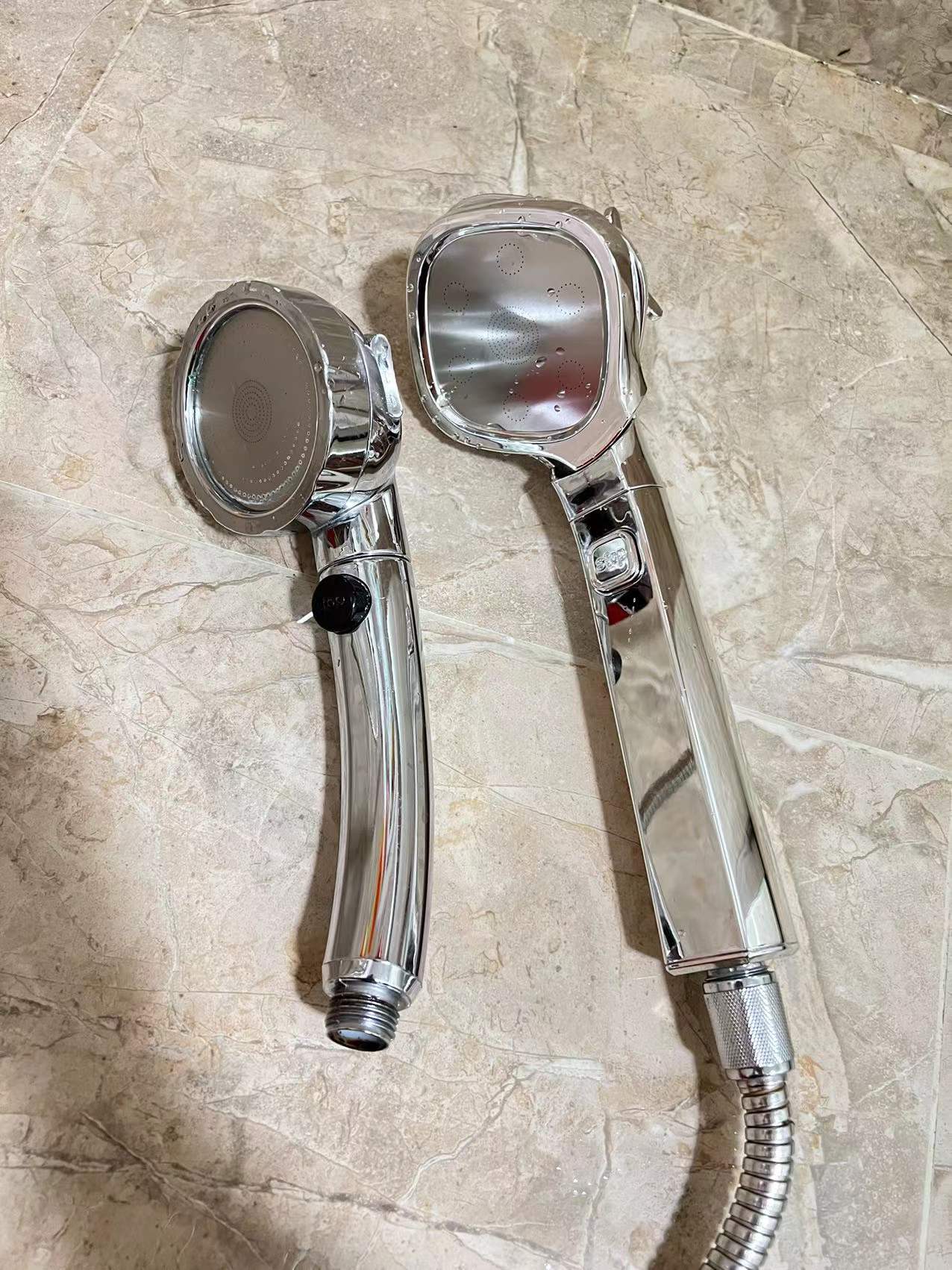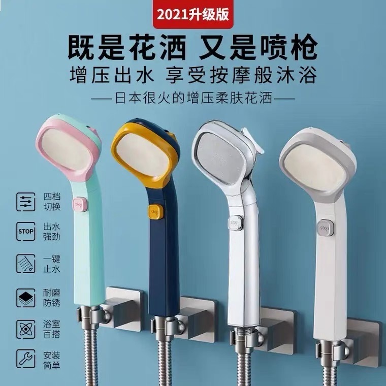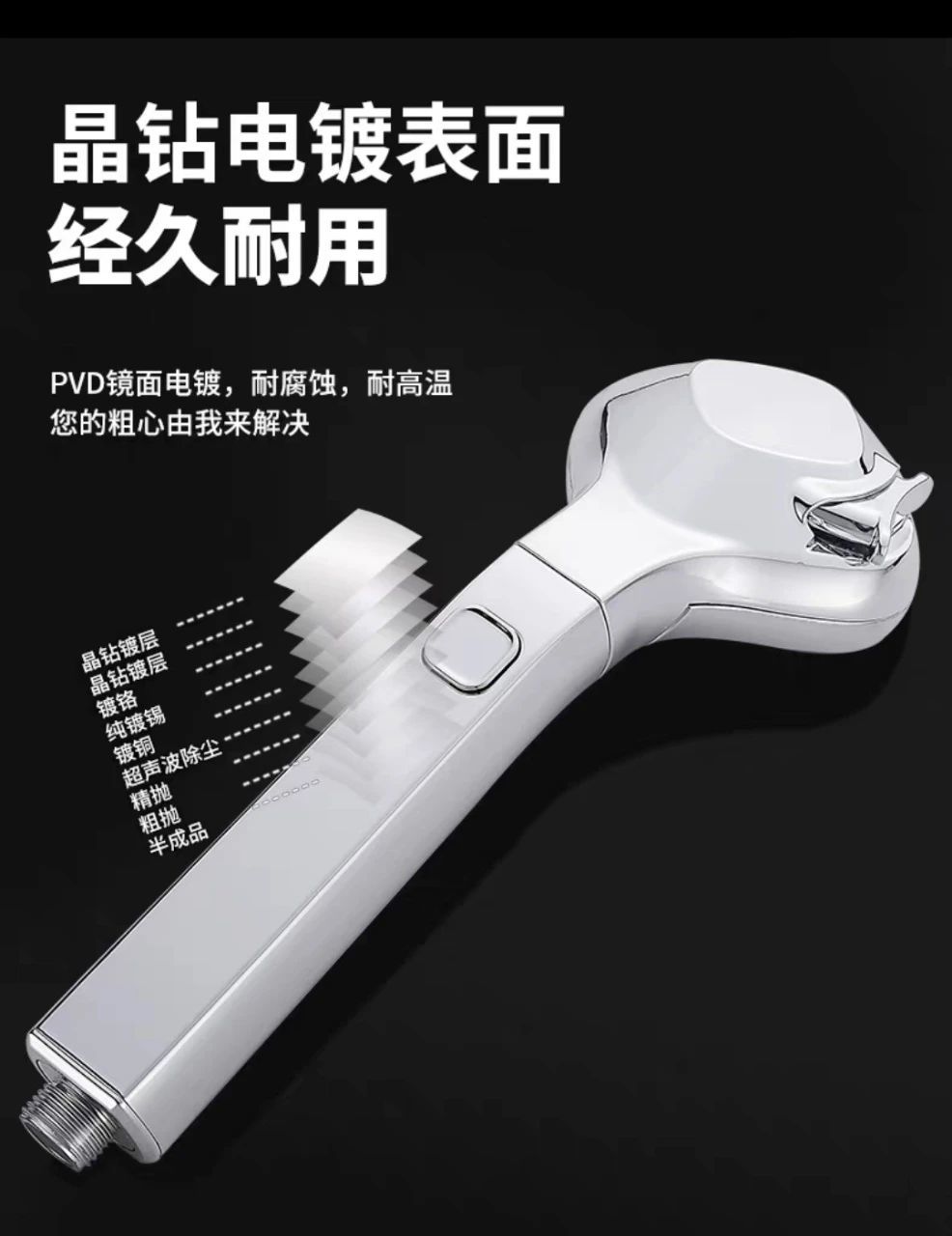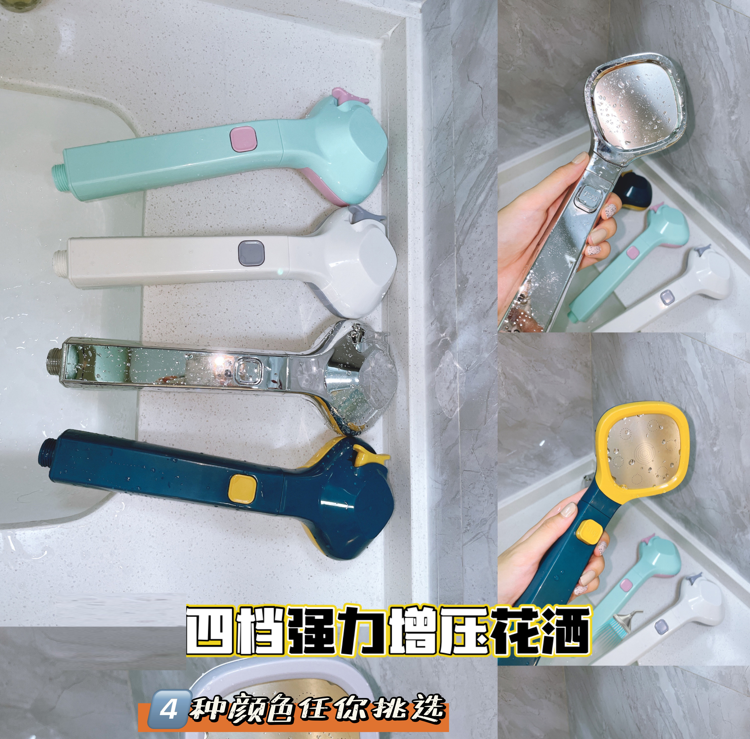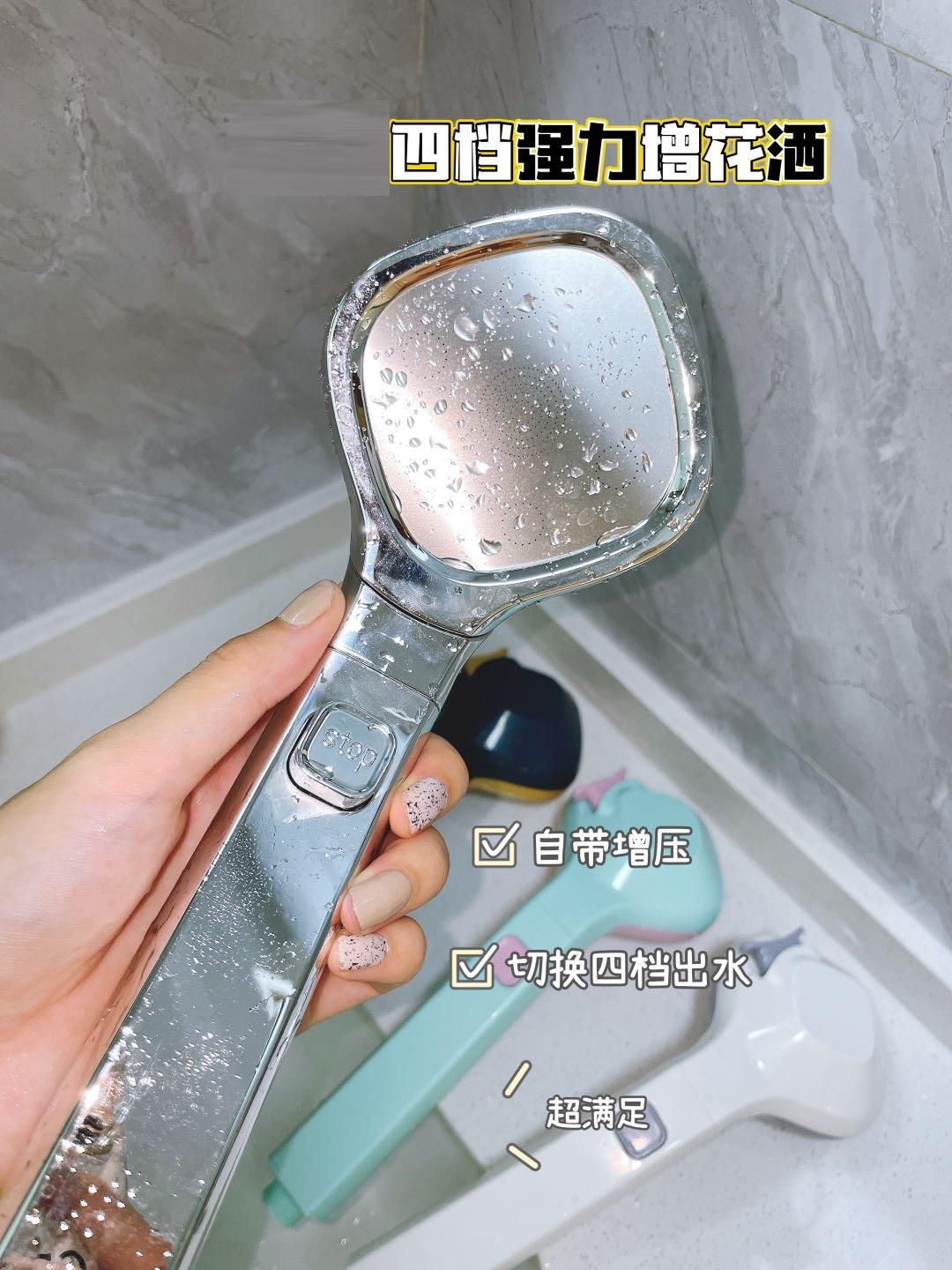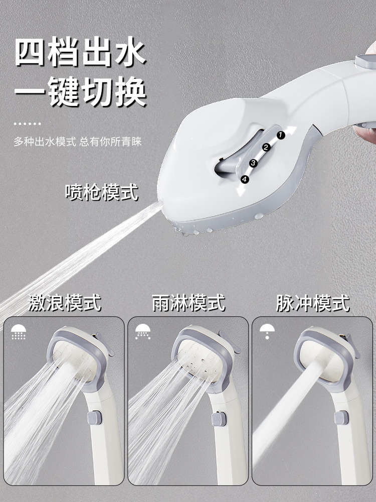 3+1档设计,一键切换,秒变喷枪模式,角落去污神器!自带止水开关,方便实用。强力增压,再也不怕水压低了。电镀表面,光亮如镜。体验不一样的淋浴感受!