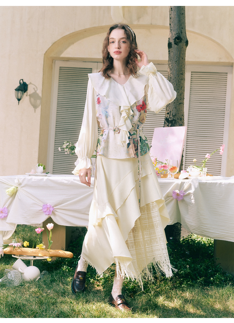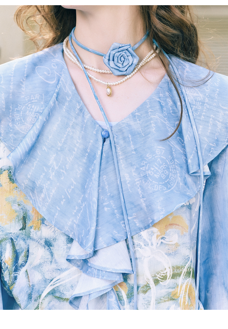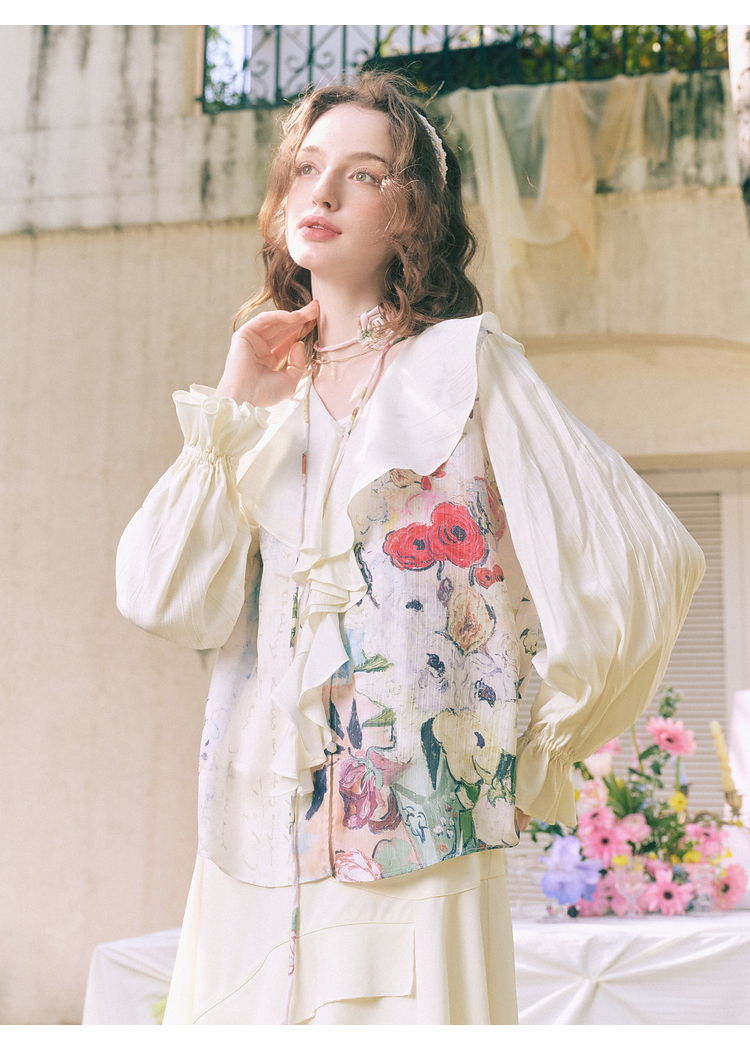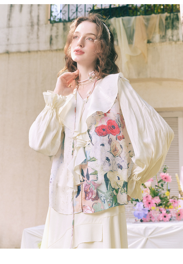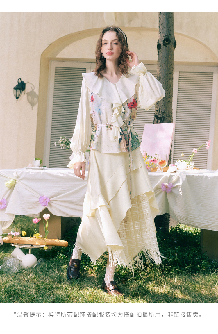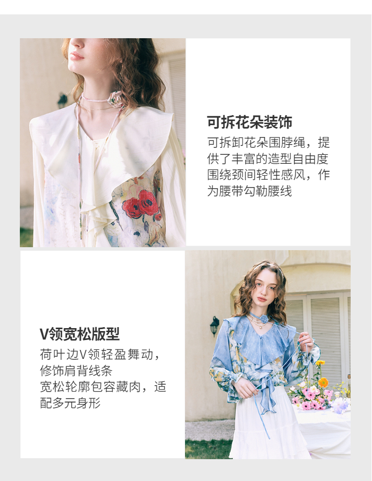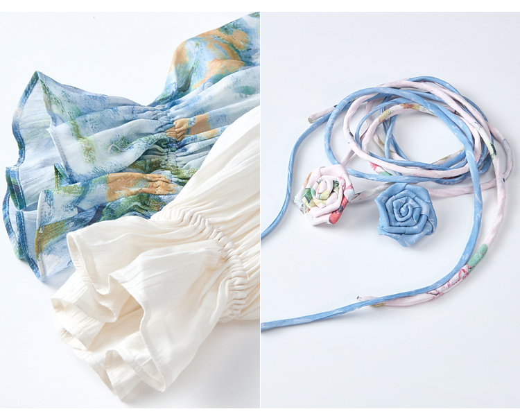 两三事临风明夏2026春新款荷叶边领立体花腰绳绑带两件套雪纺衫女