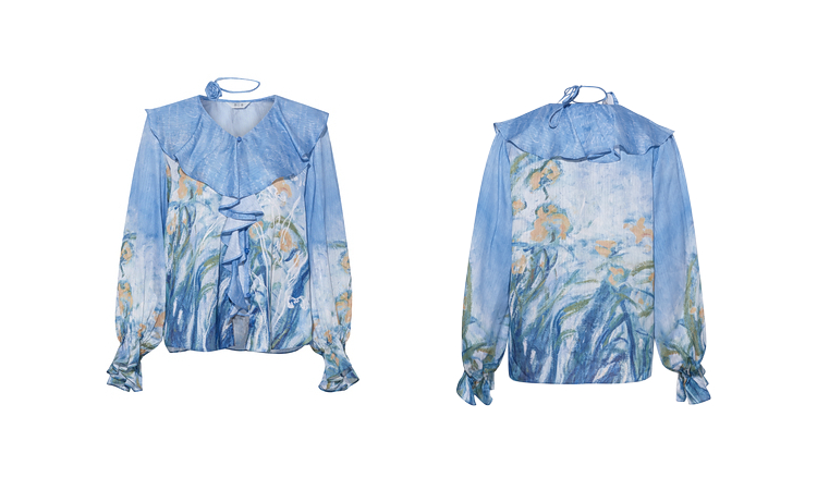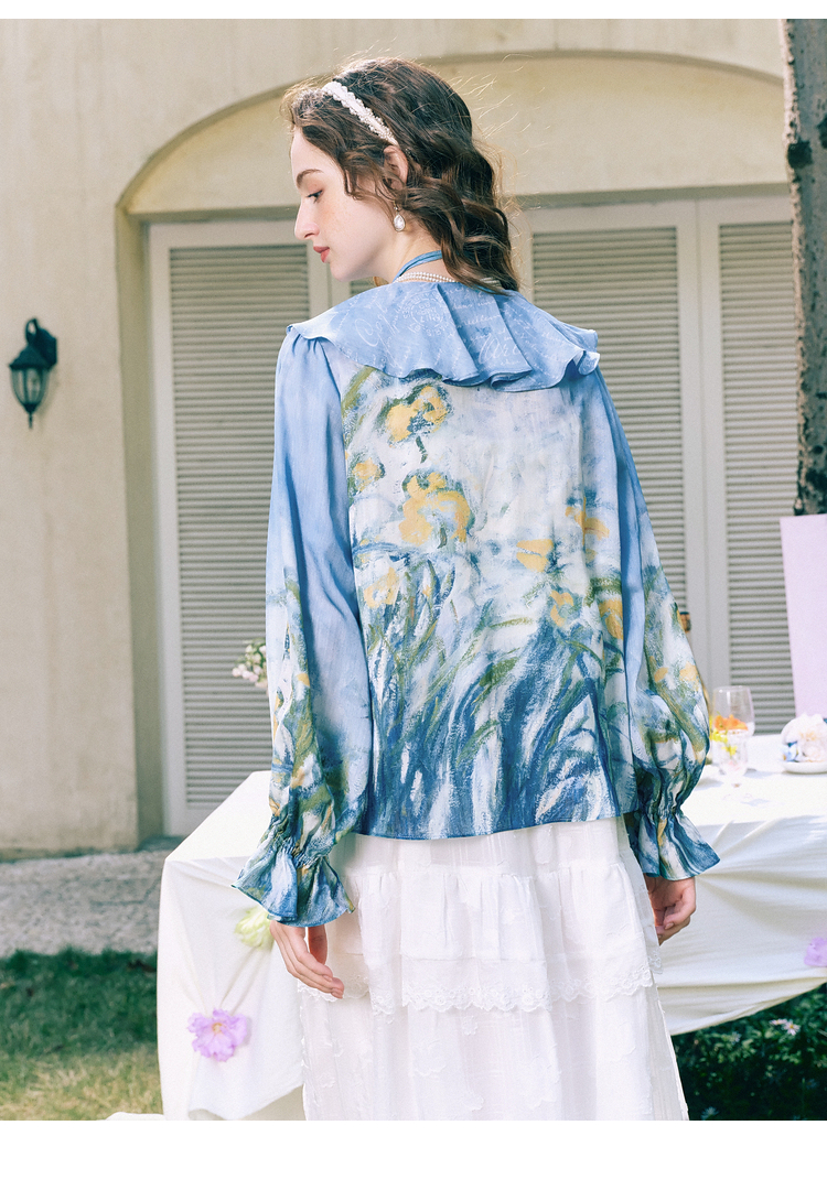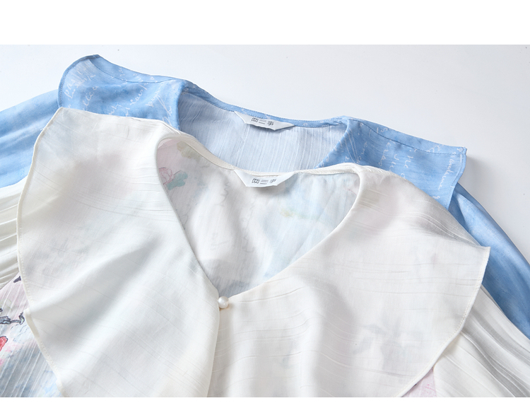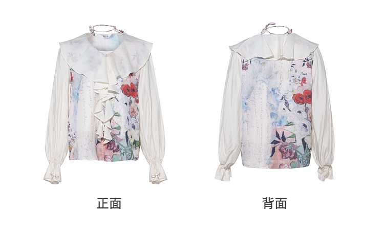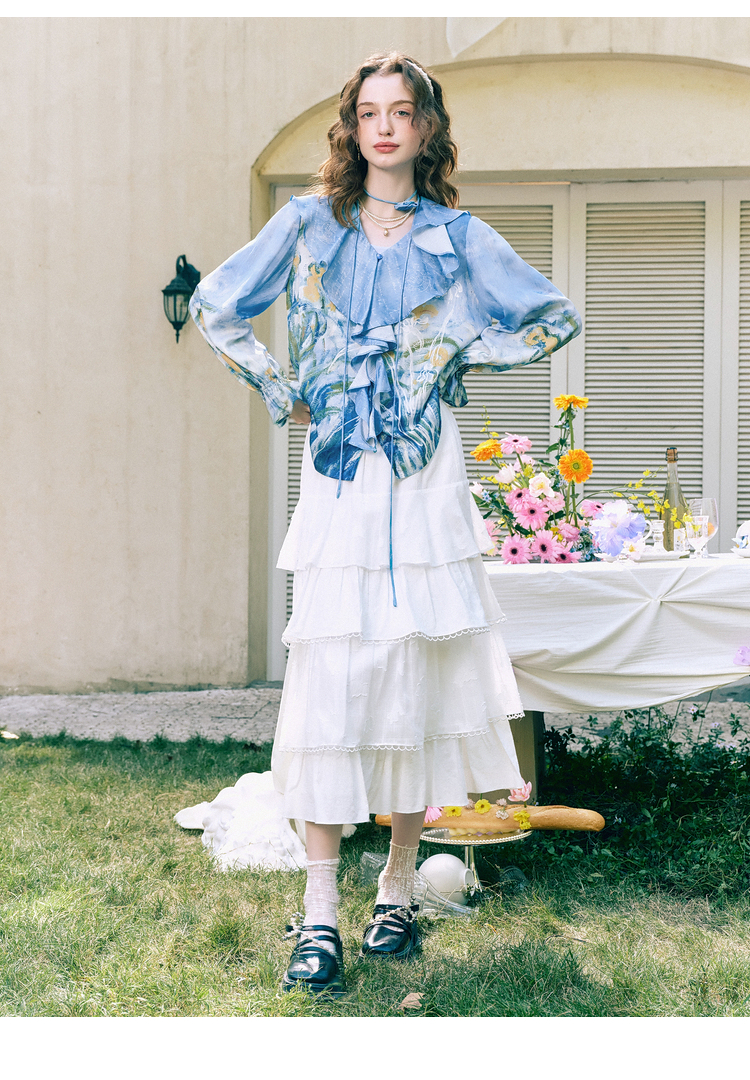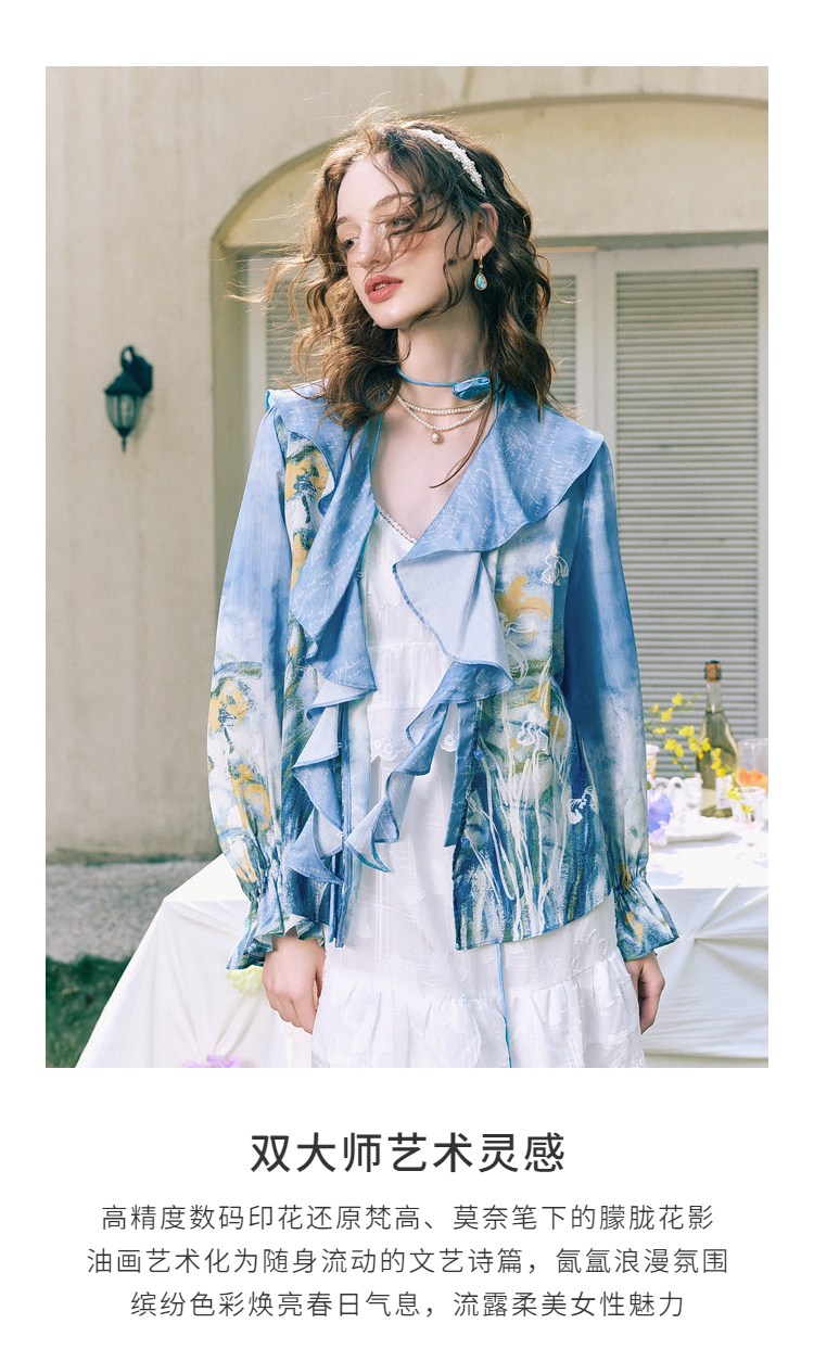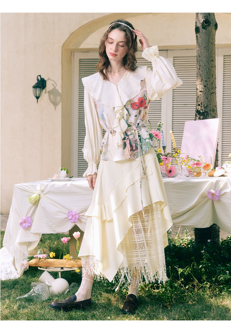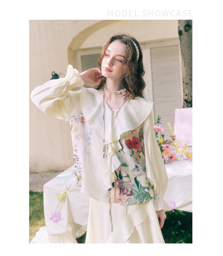 两三事临风明夏2026春新款荷叶边领立体花腰绳绑带两件套雪纺衫女
