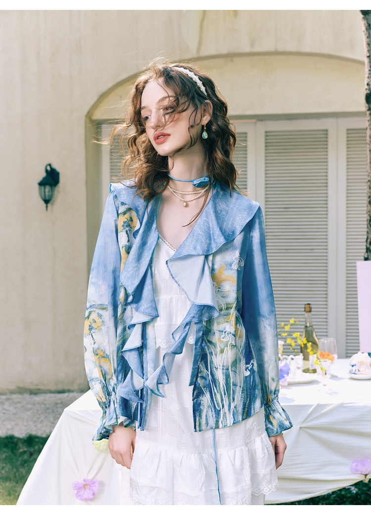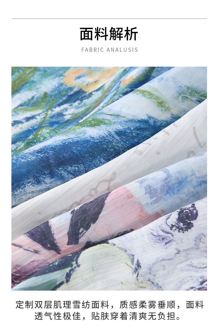 两三事梵高艺术荷以清凉夏季田园风泡泡袖印花绑带连衣裙