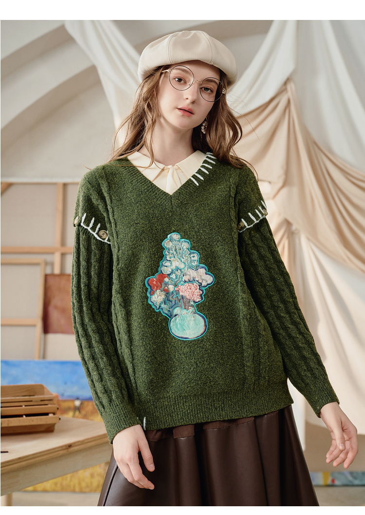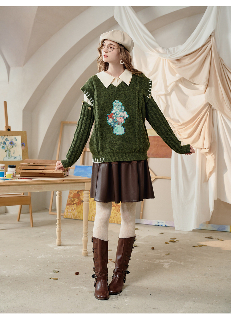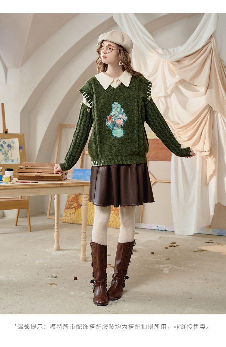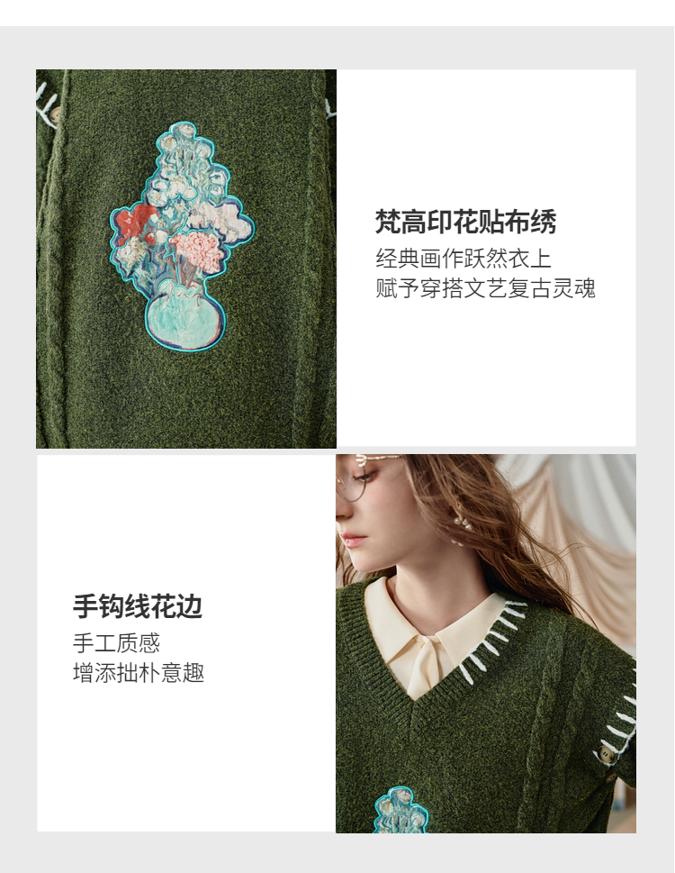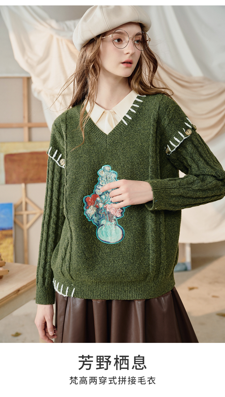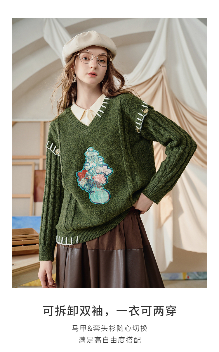 两三事梵高文艺芳野栖息2025冬季新款印花贴布绣串线可拆袖毛衣女