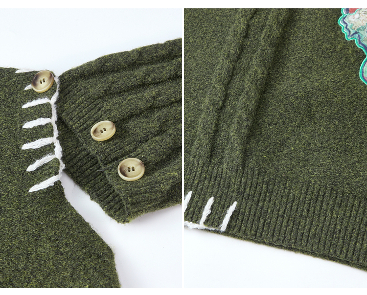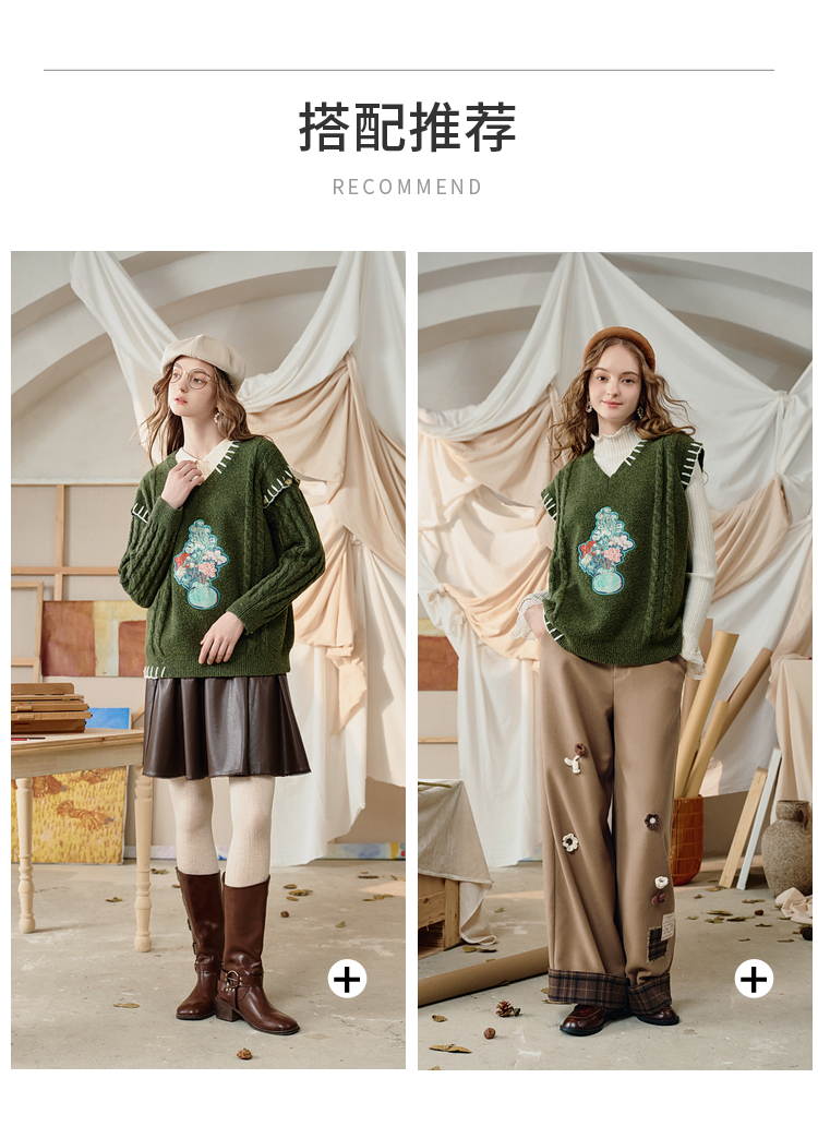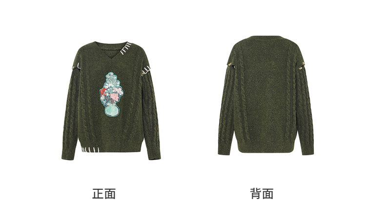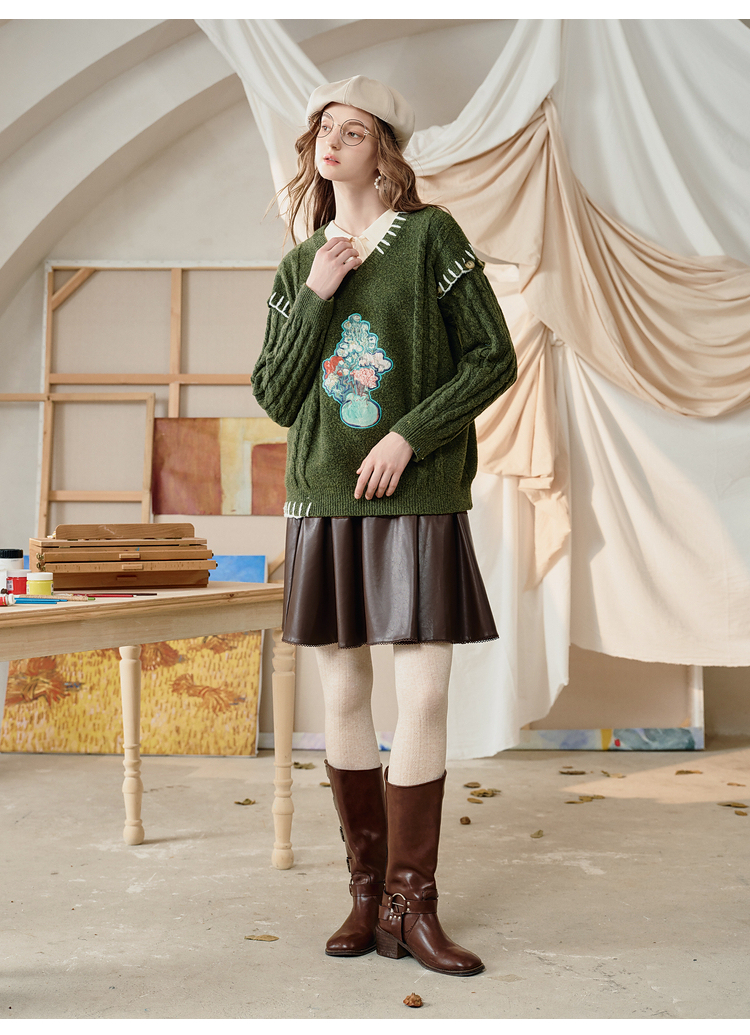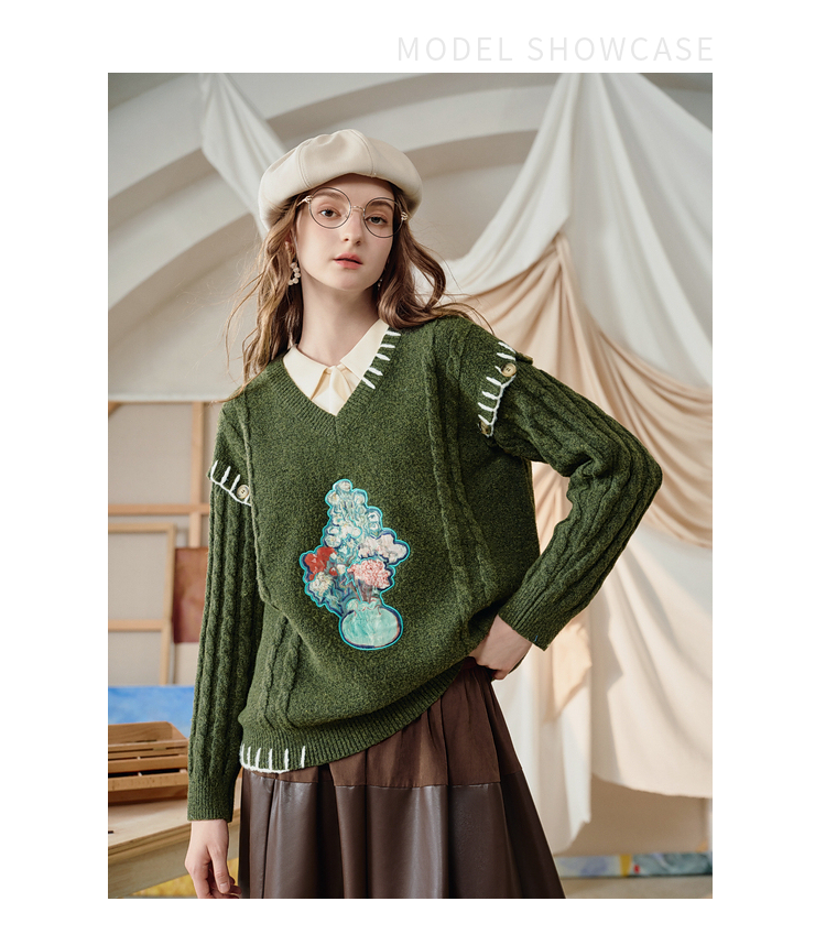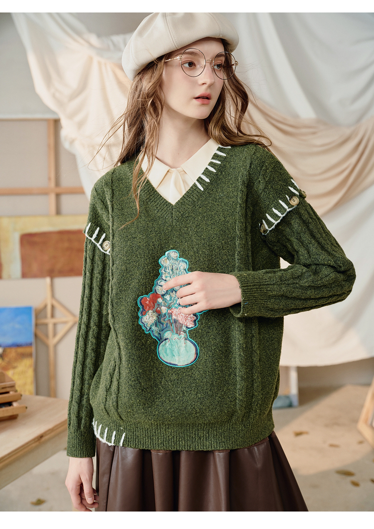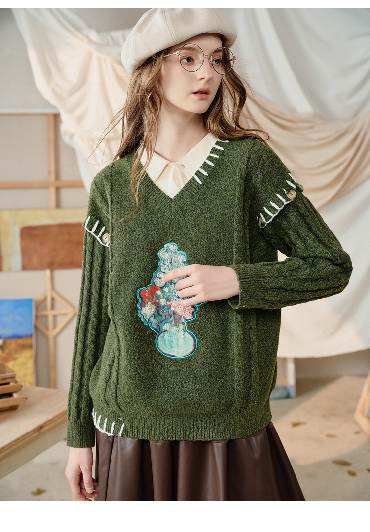 两三事梵高文艺芳野栖息2025冬季新款印花贴布绣串线可拆袖毛衣女