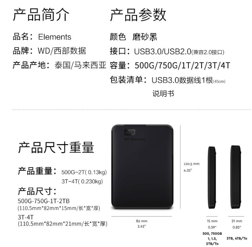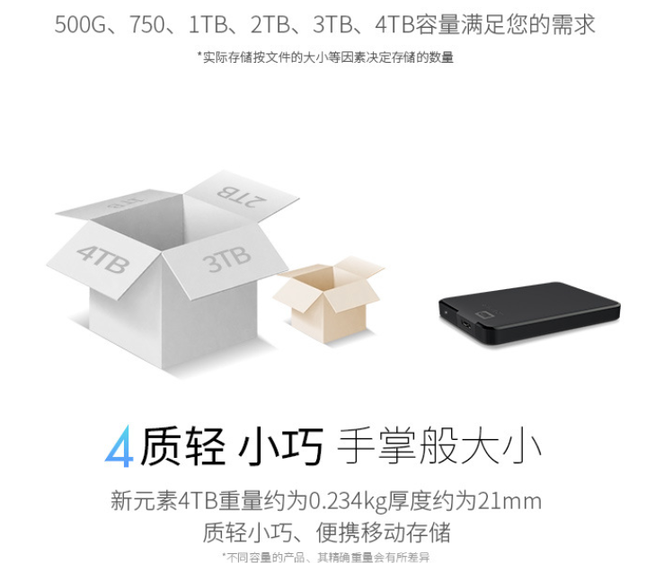 【移动硬盘】西数移动硬盘500G 新元素1TB硬盘 大容量U盘 usb3.0