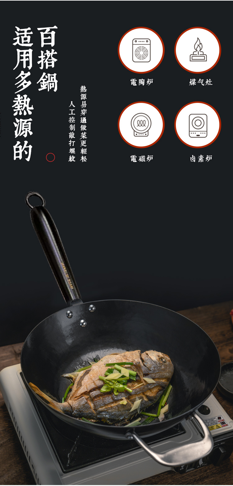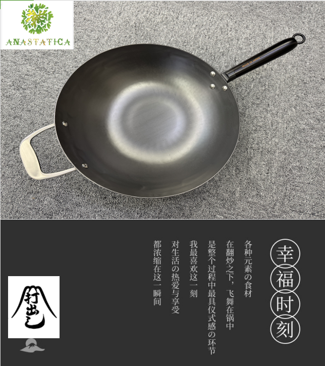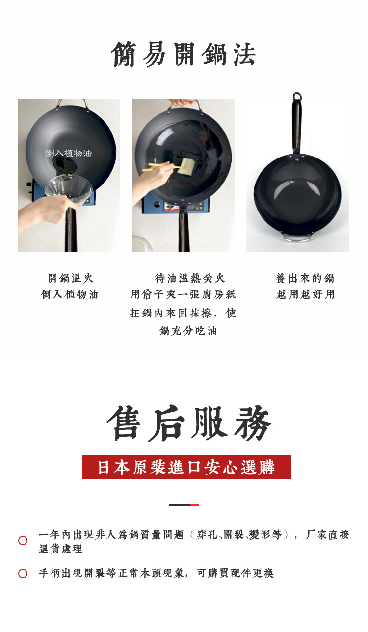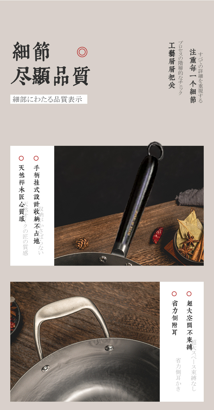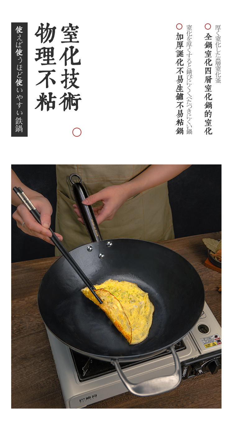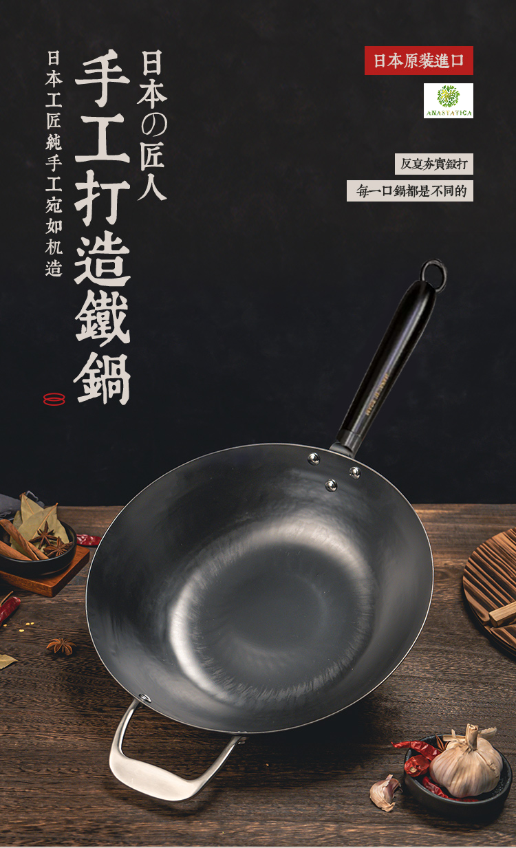 日本原装进口手工铁制木柄炒锅手打铁锅健康无涂层-YHD