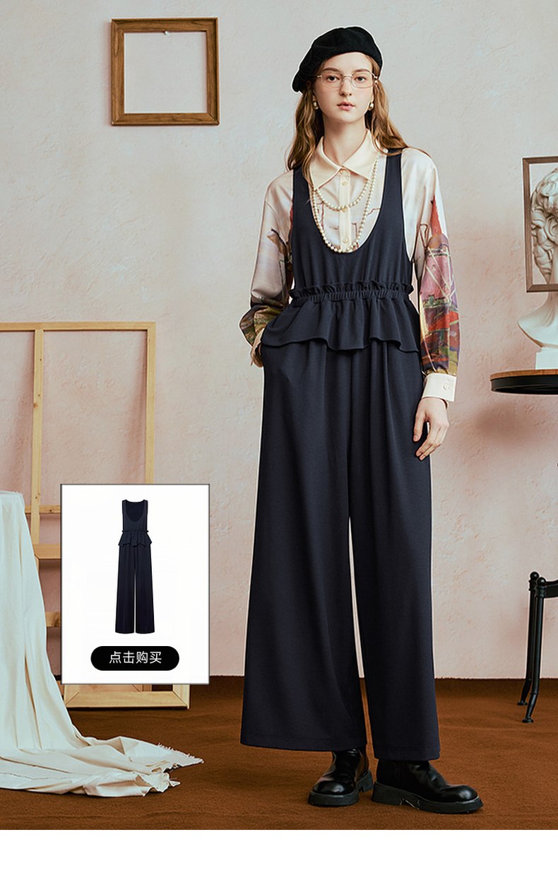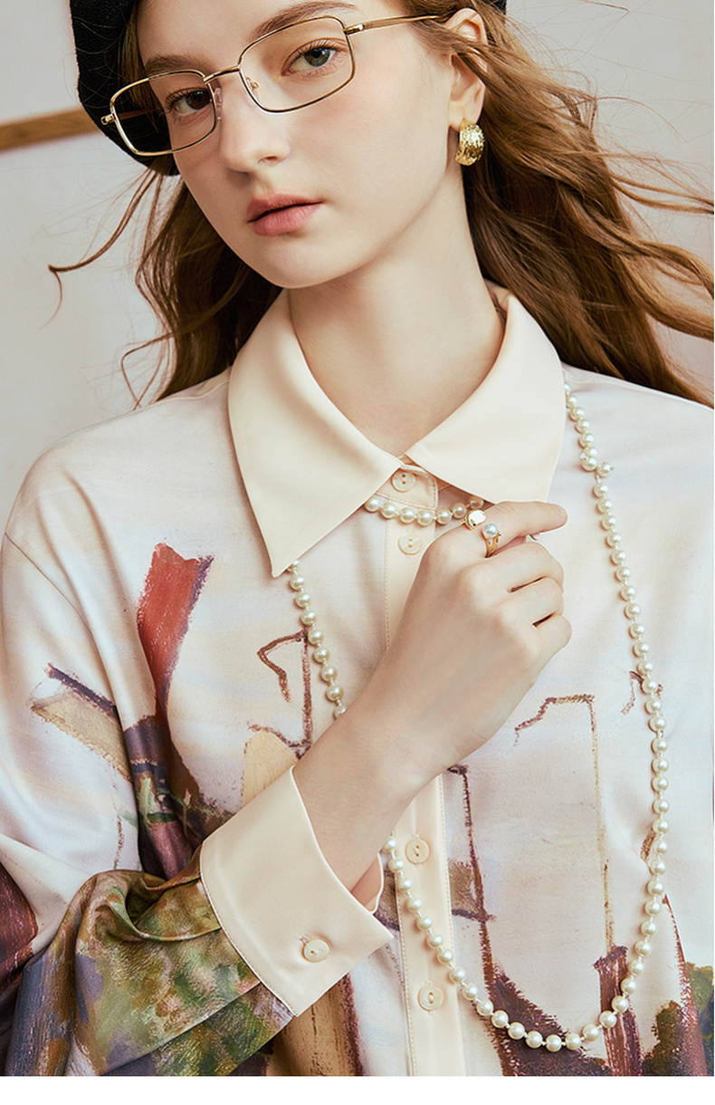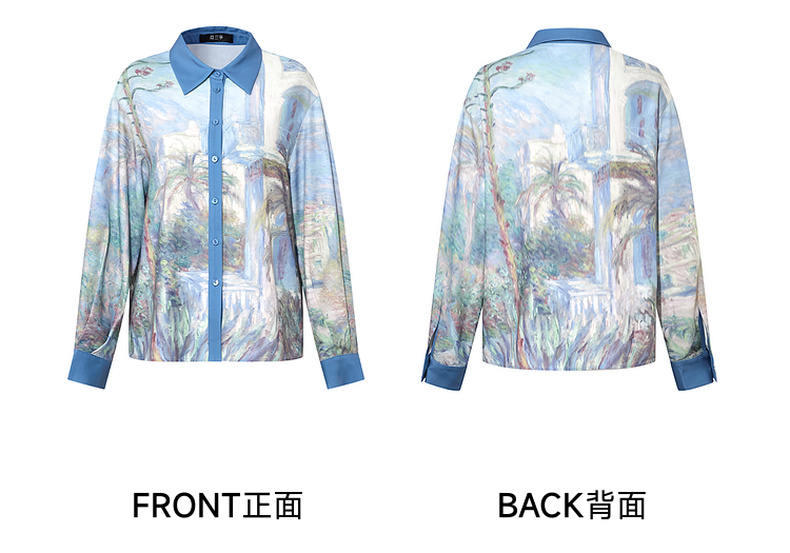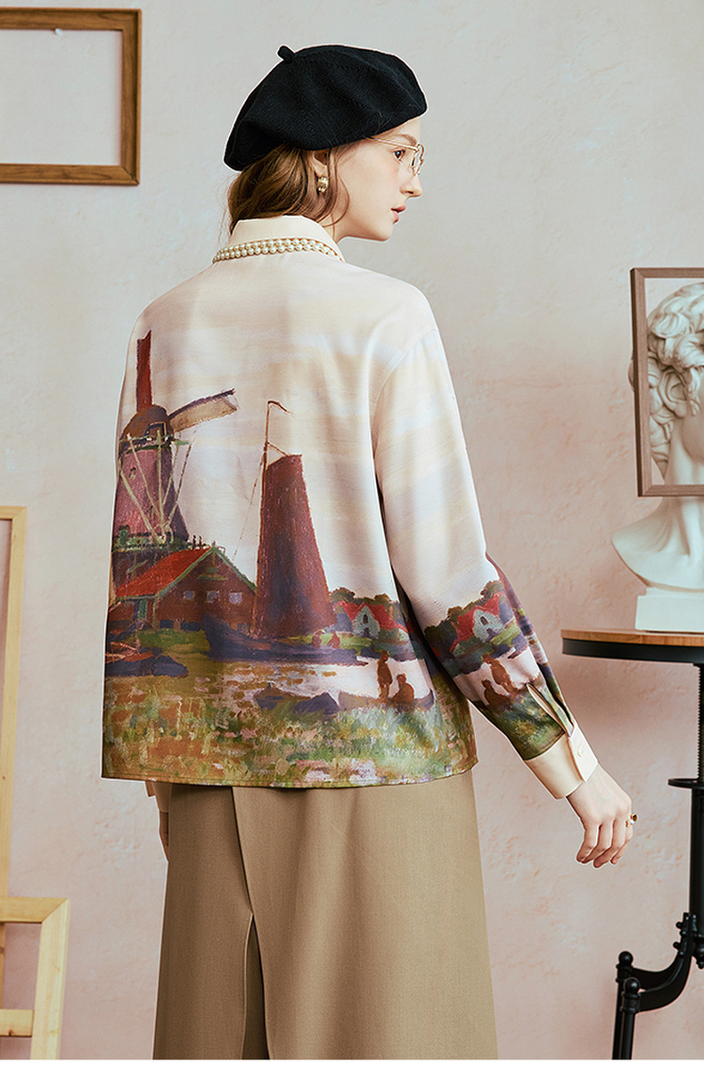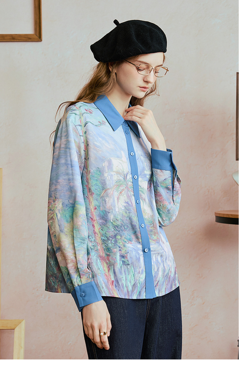 两三事 未央海雾 2025秋季新款文艺风印花拼色长袖衬衫女宽松