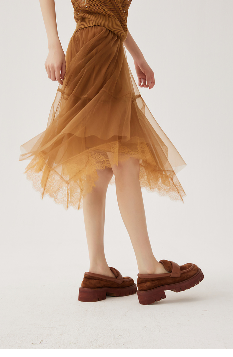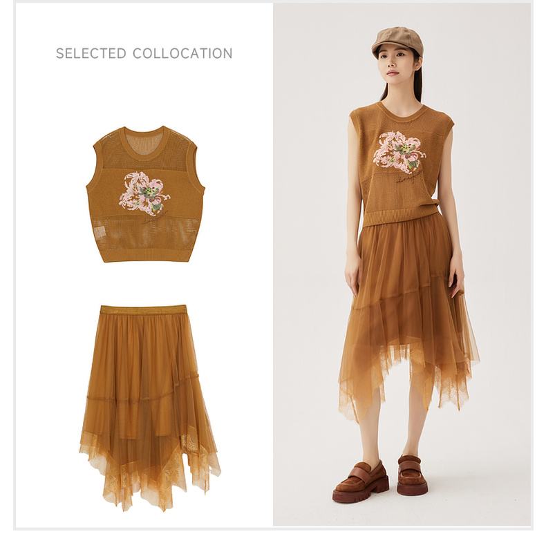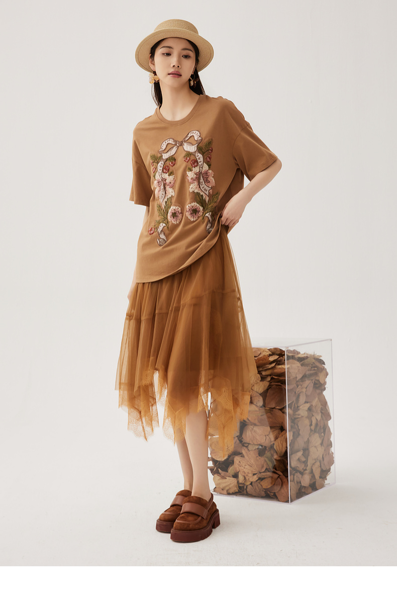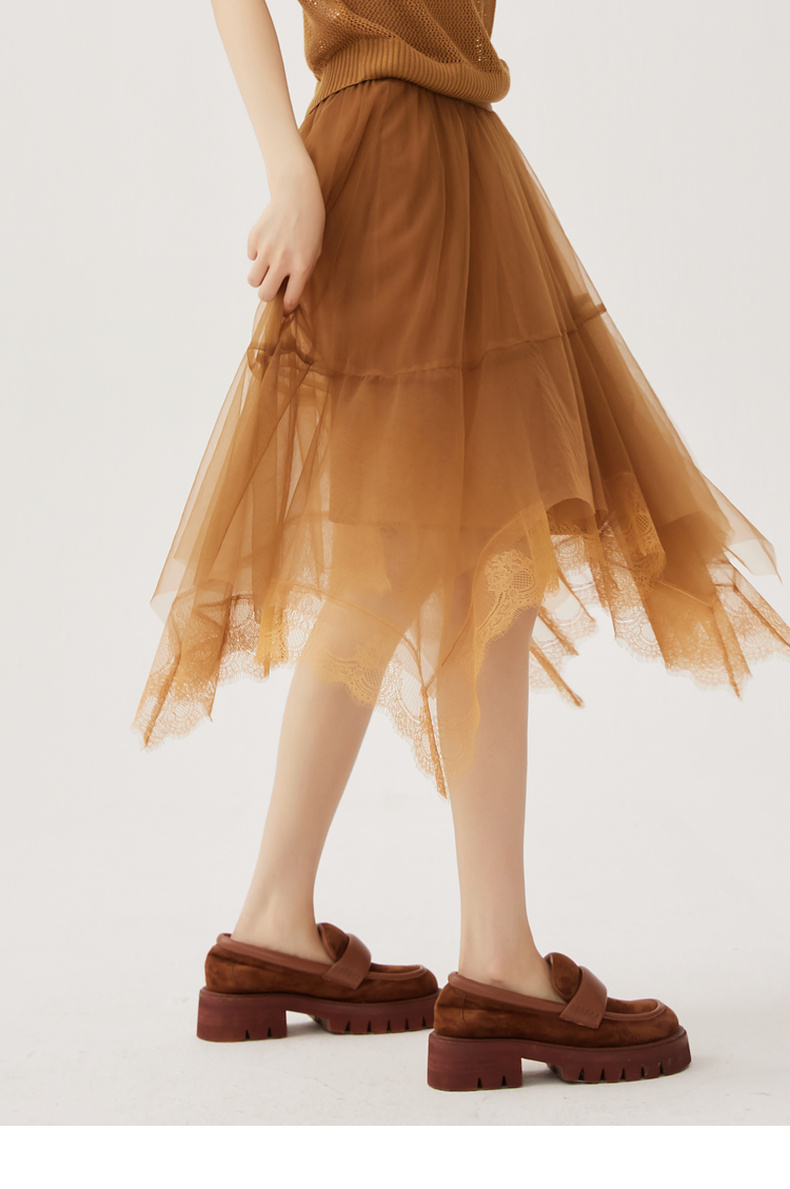 谜底网纱半身裙2024秋季新品优雅浪漫不规则下摆中长裙243MB1116