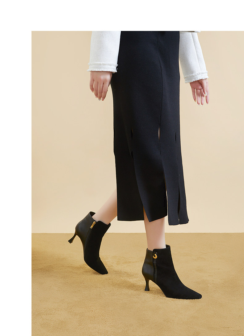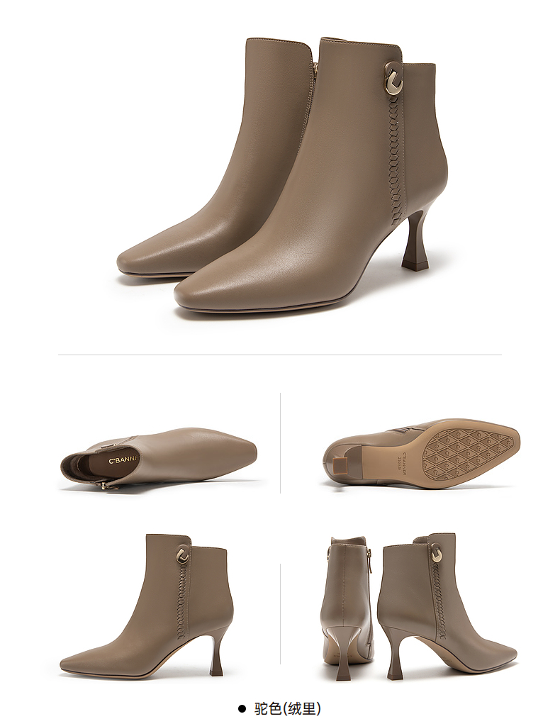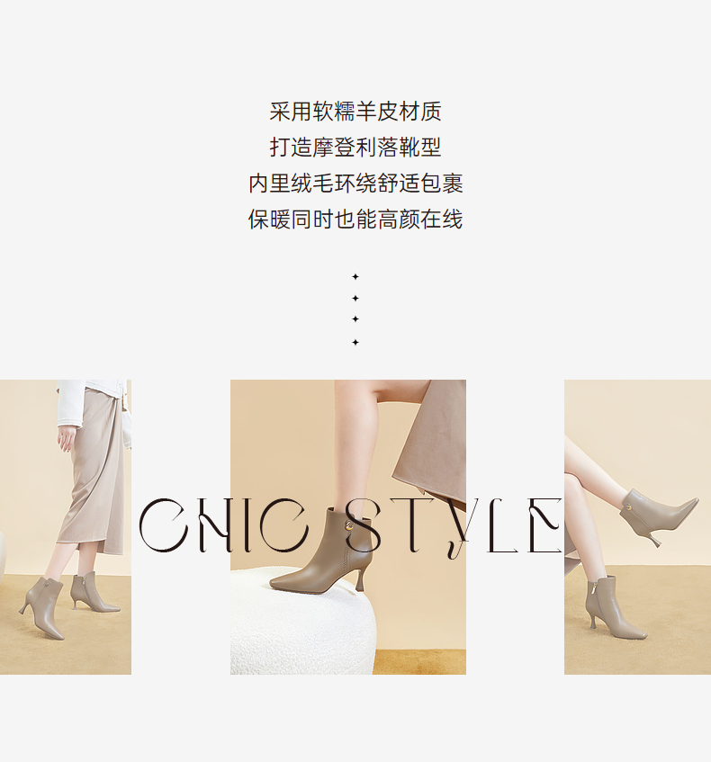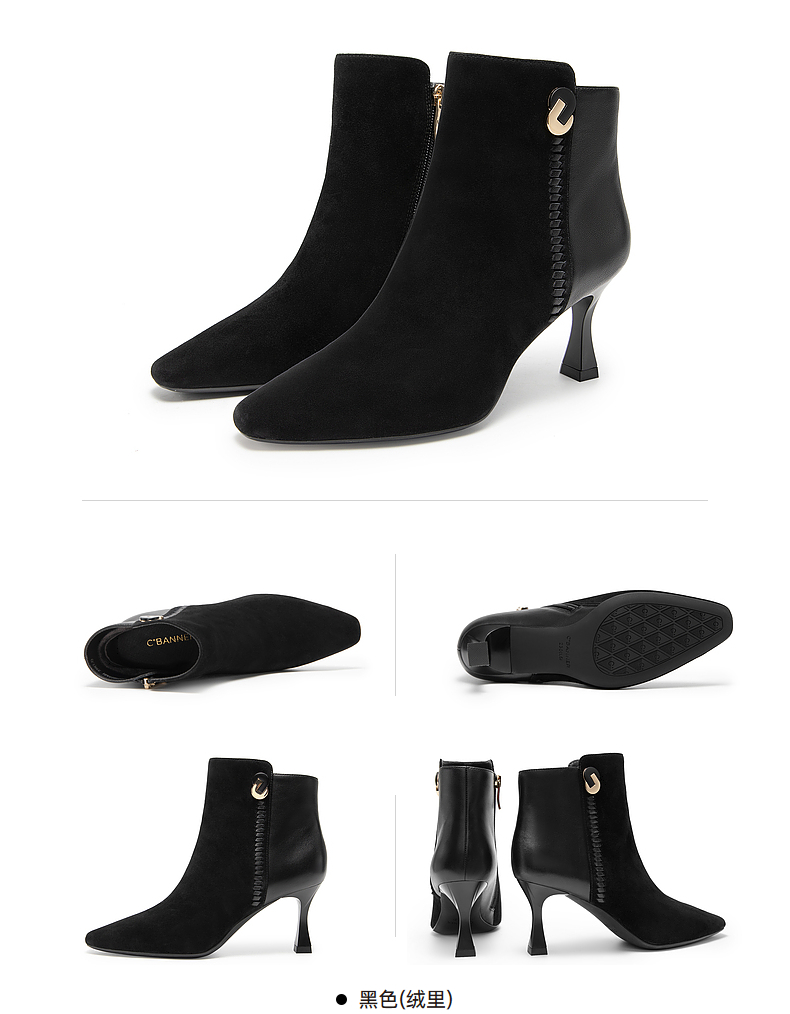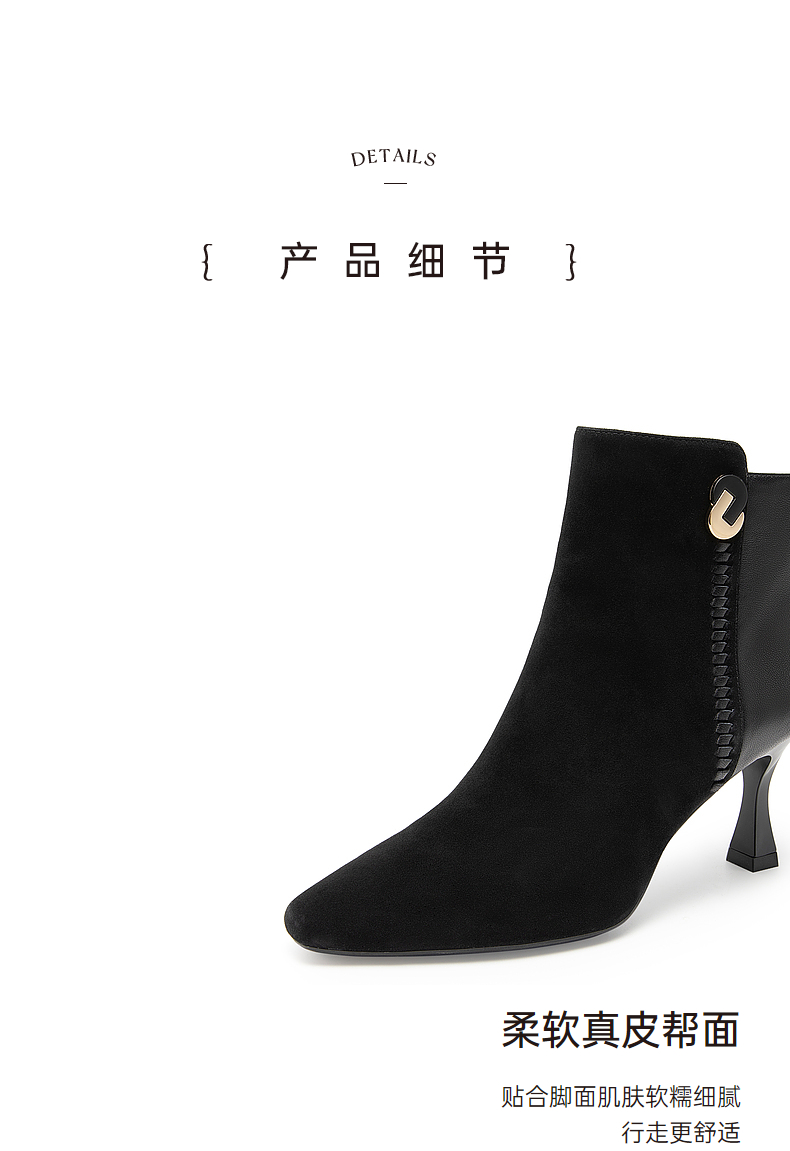千百度羊皮时装靴秋冬细高跟短靴子女鞋真皮显瘦气质保暖A23577227