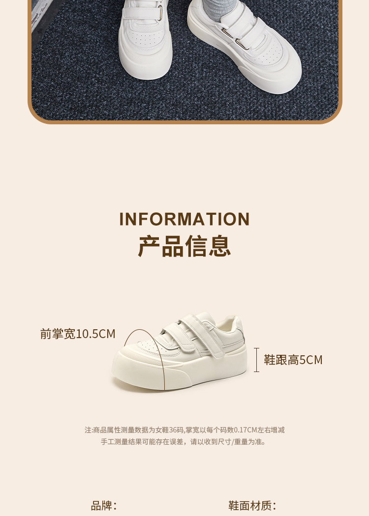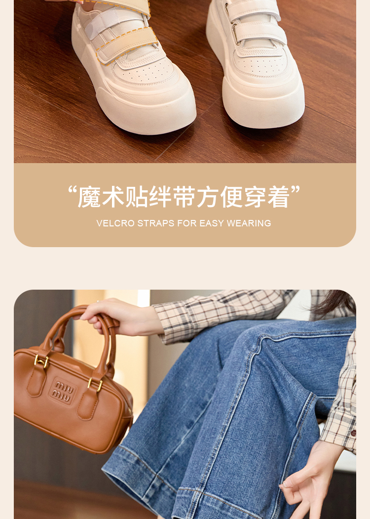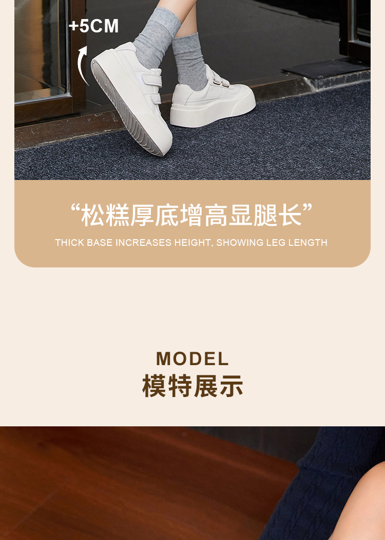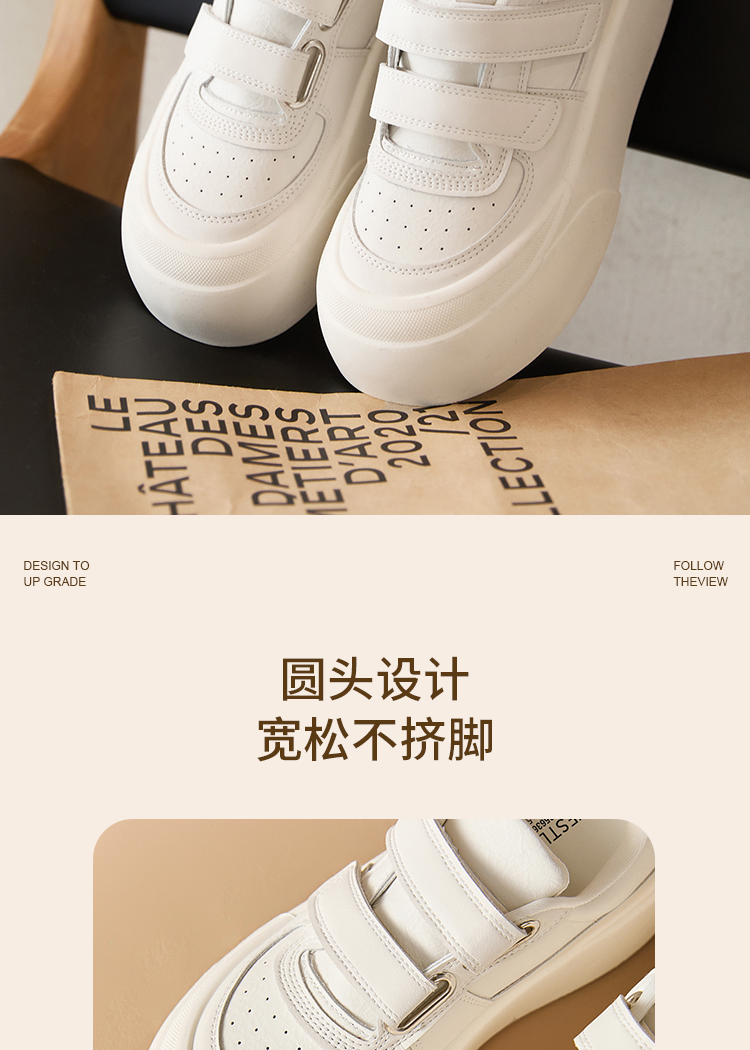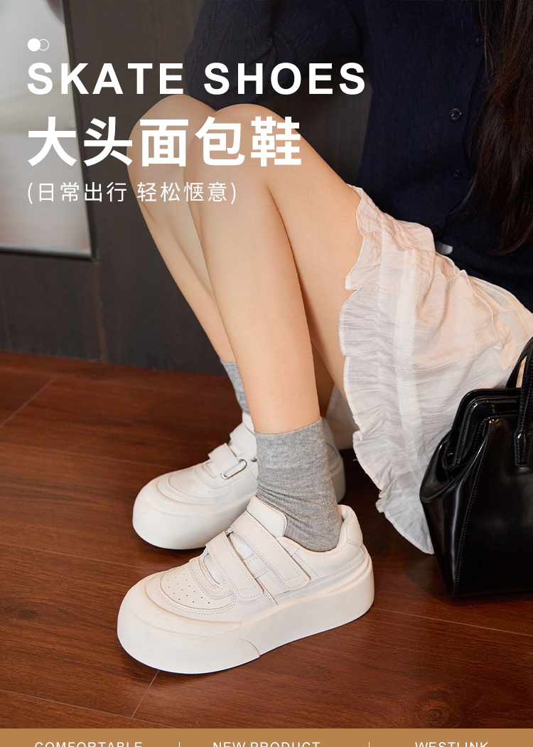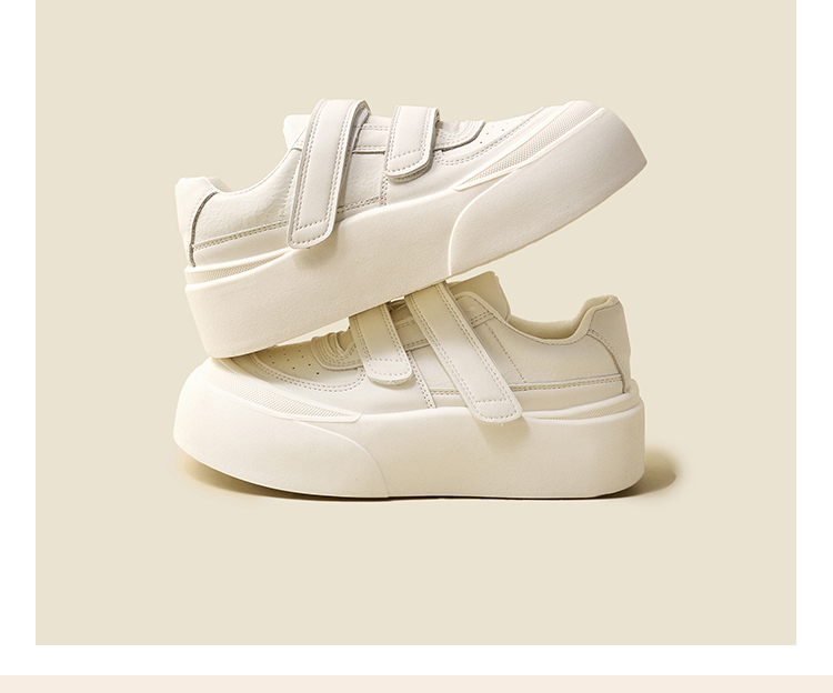 西遇厚底小白鞋女新款魔术贴百搭大头面包鞋白色增高板鞋V0356365