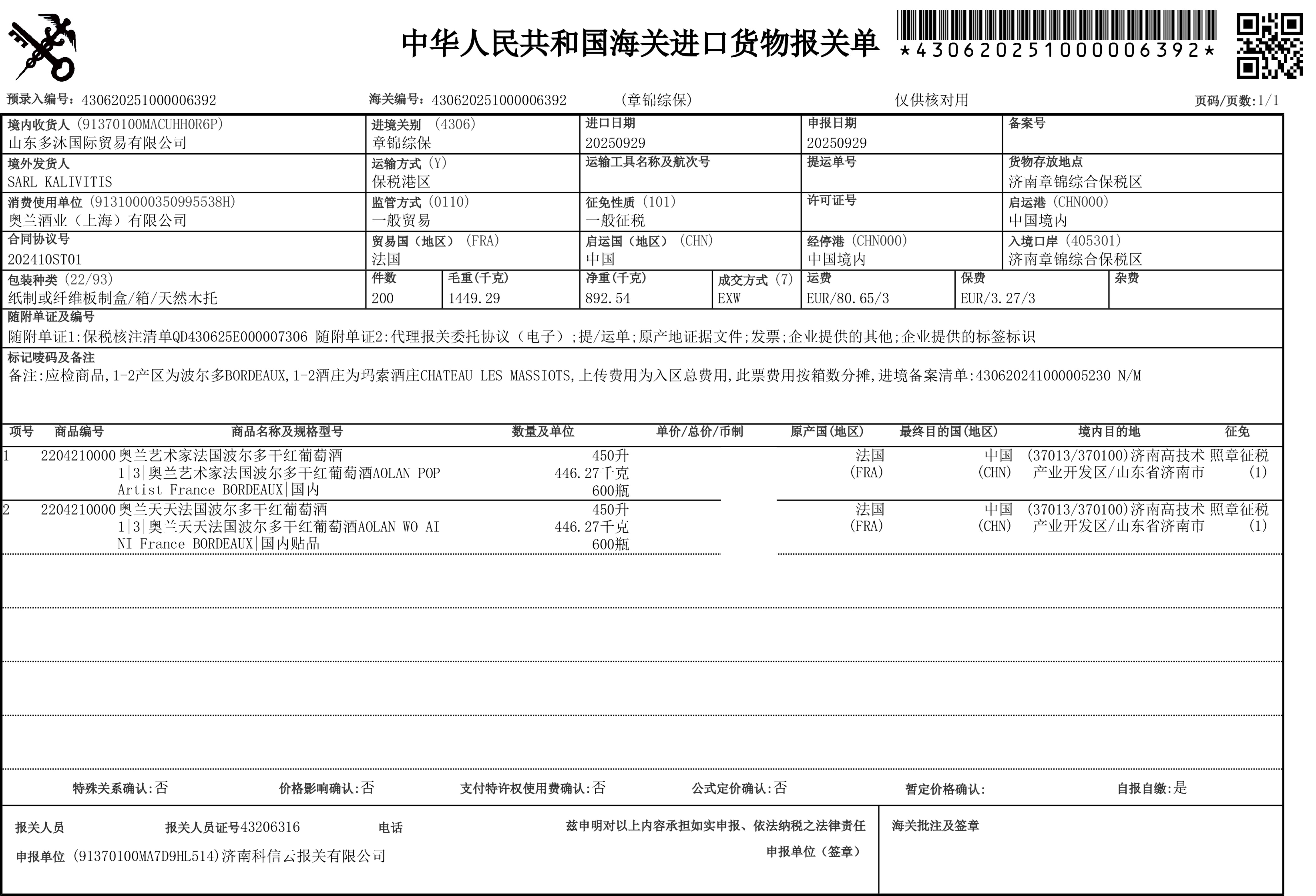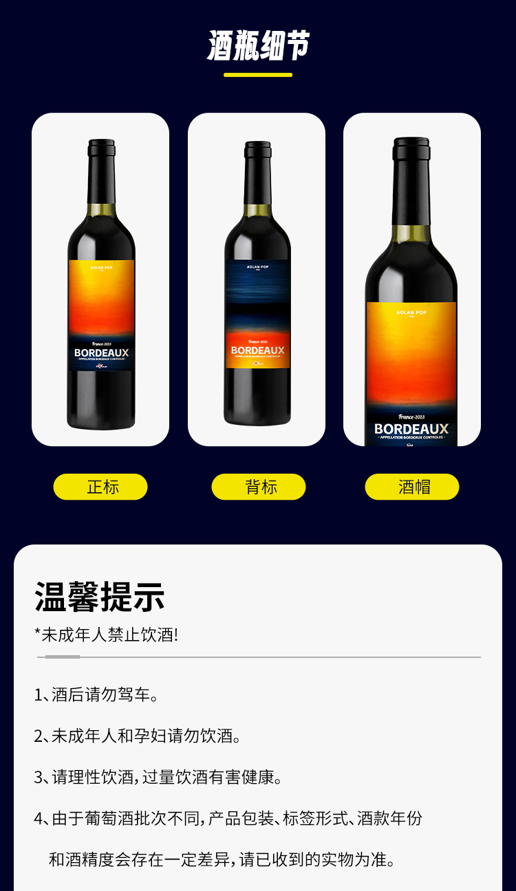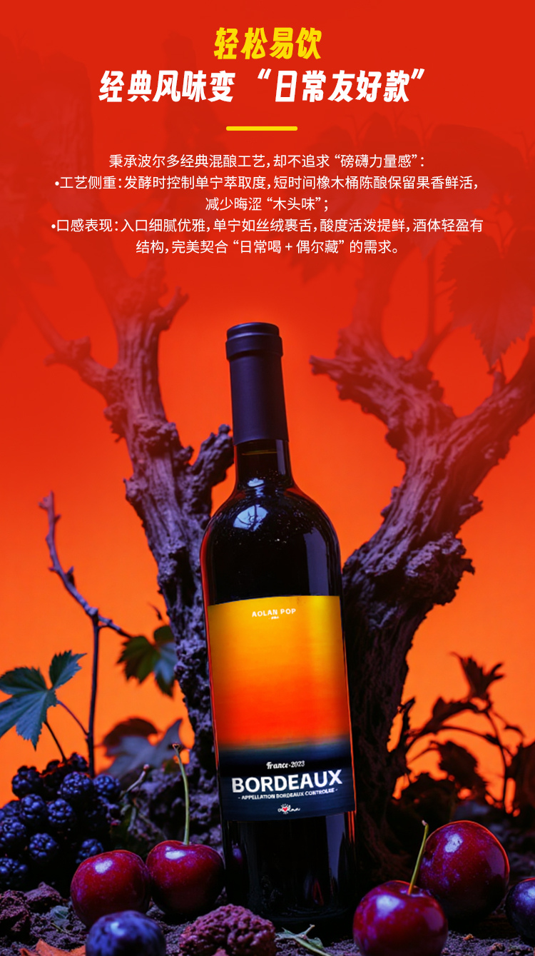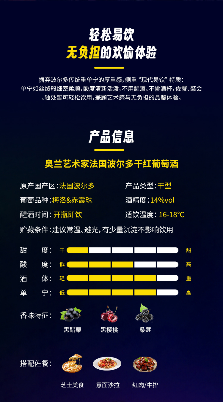 【新品】奥兰艺术家法国波尔多干红葡萄酒14°750ml 法国原瓶进口A.O.C.级红酒