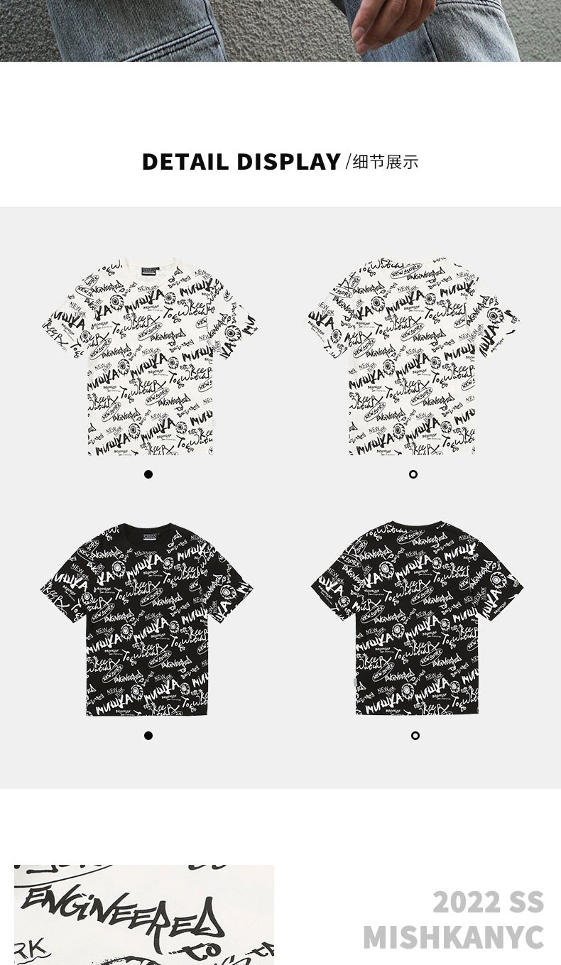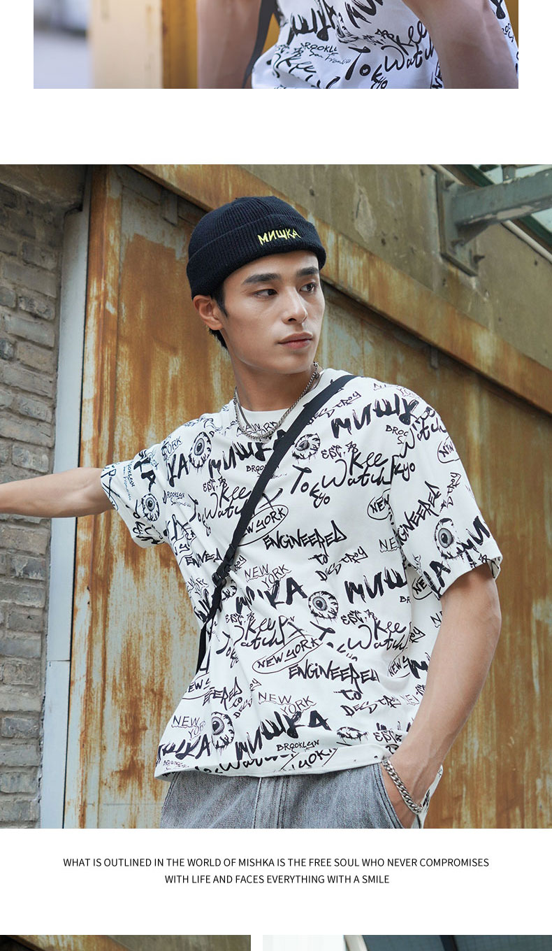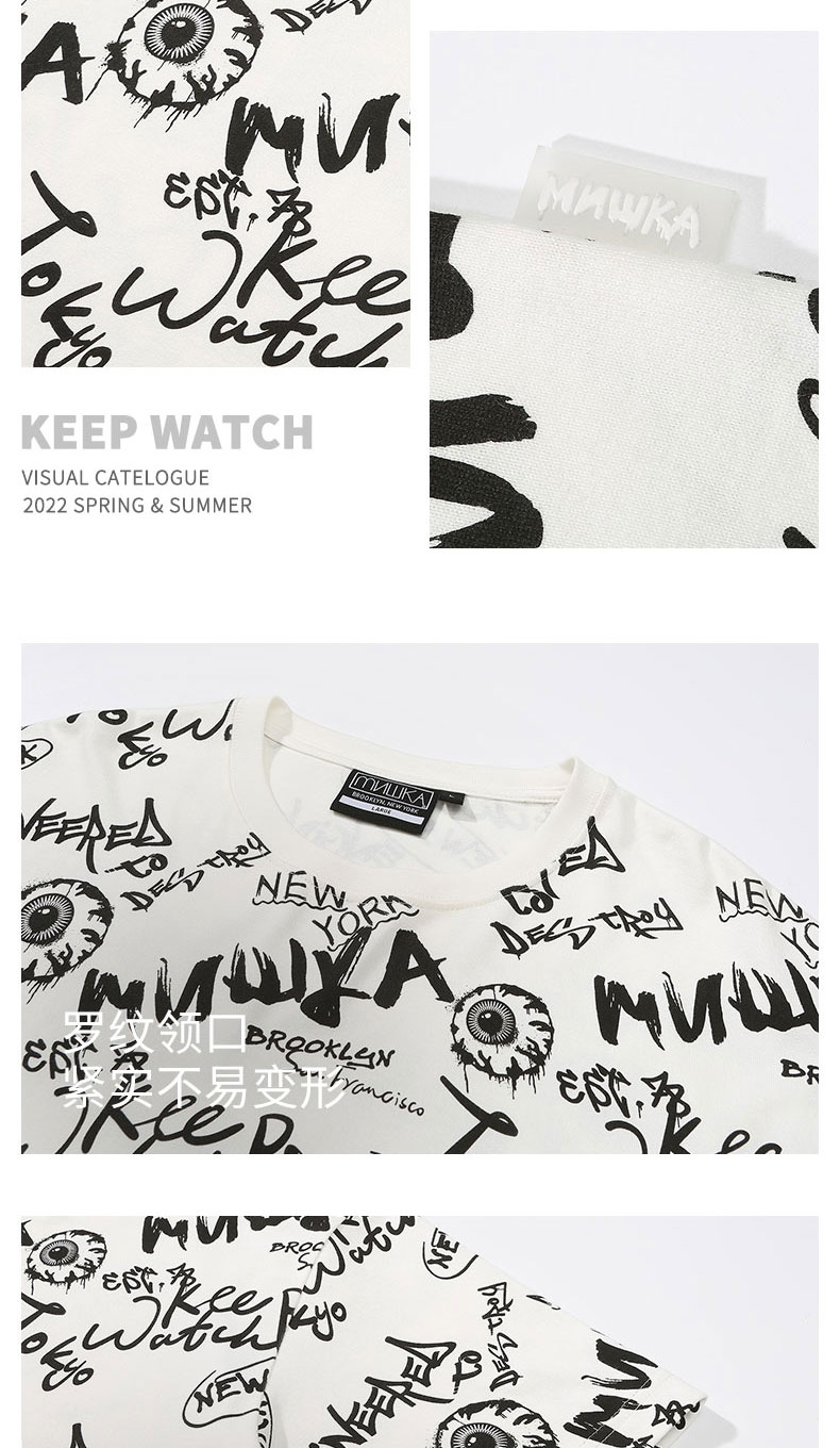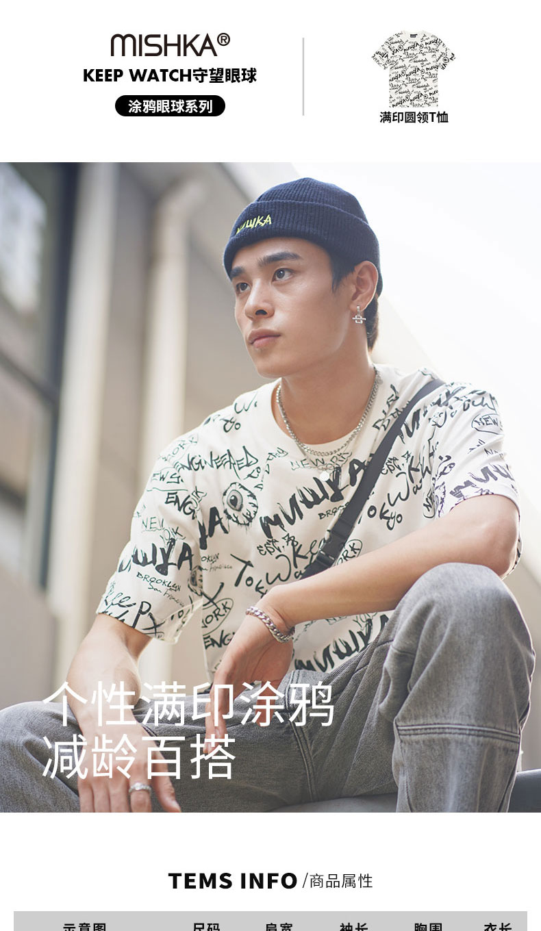 MISHKA大眼球潮牌2022春夏新品 满印涂鸦眼球印花圆领短袖T恤男女M21100039M