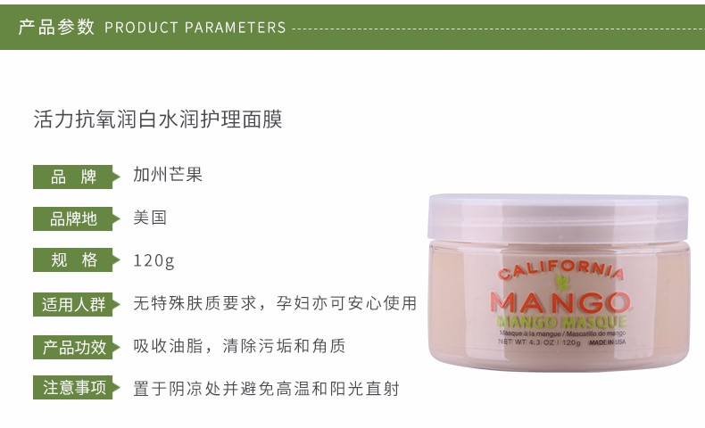 CALIFORNIA MANGO加州芒果 活力抗氧润白水润护理面膜 120G 美国