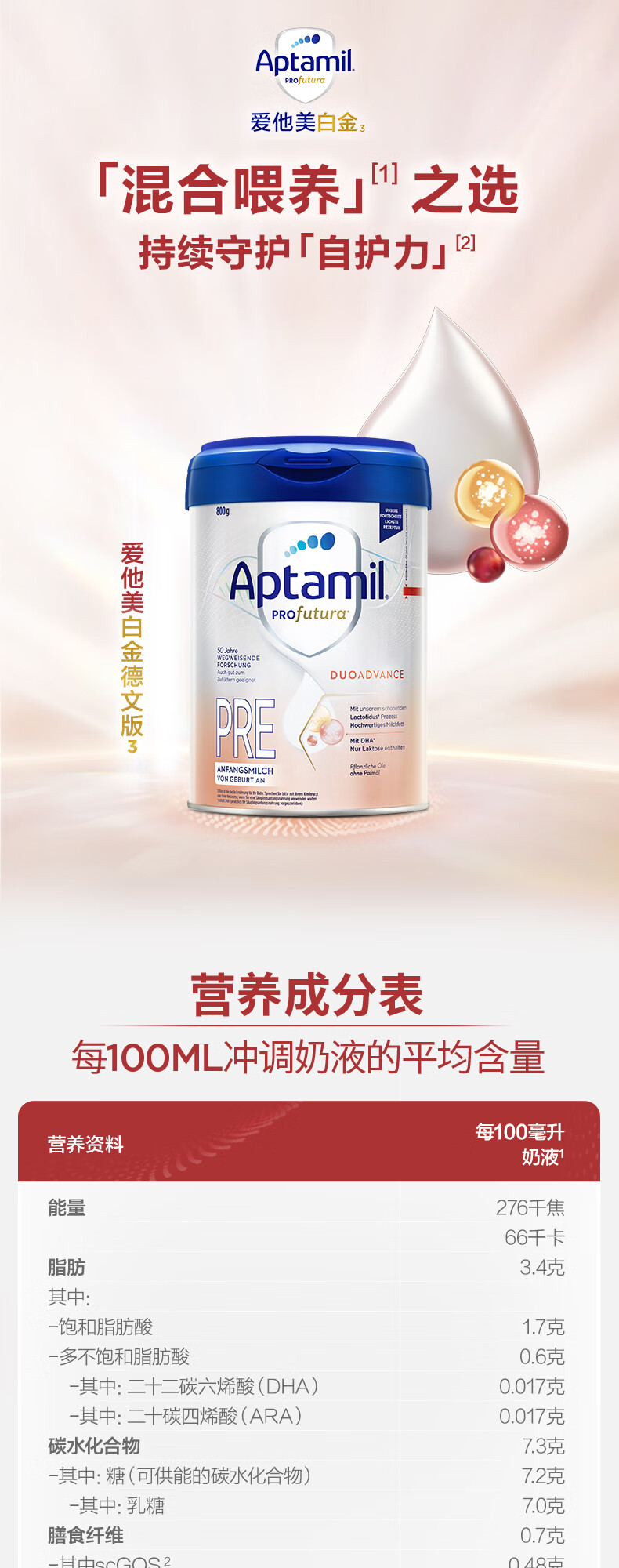 品名:德国爱他美(Aptamil)白金版婴儿配方奶粉pre段800g(新包装)