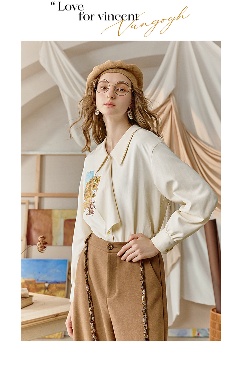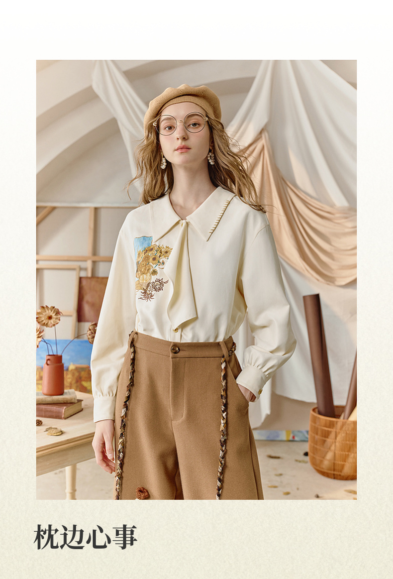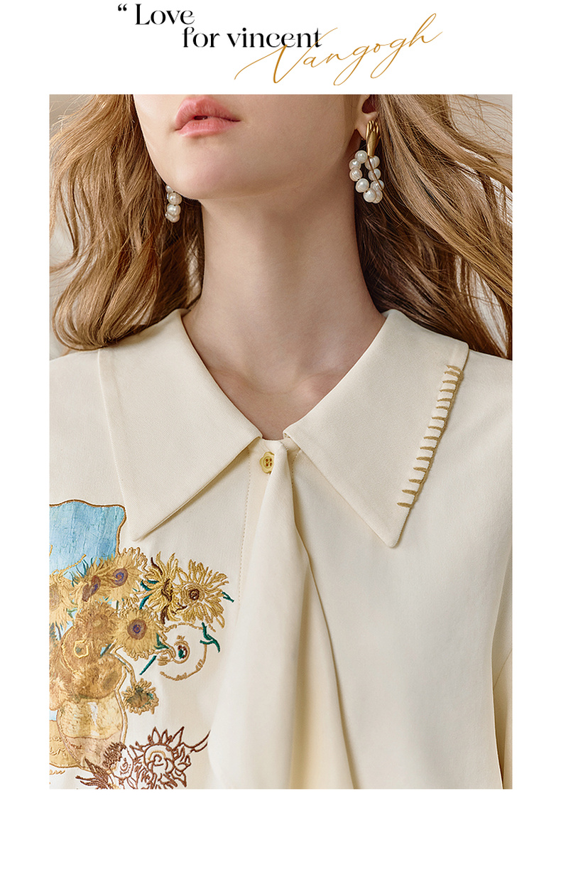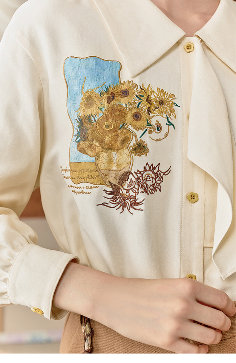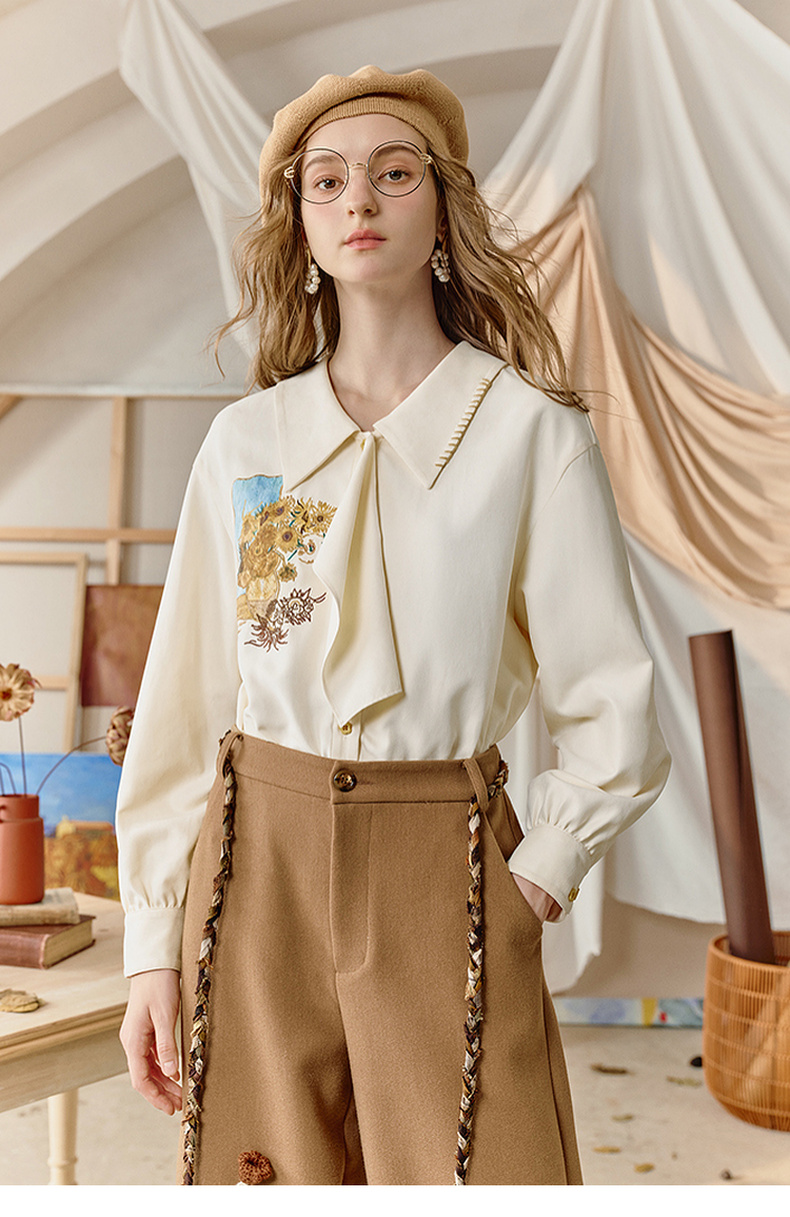 两三事梵高文艺 枕边心事 2025秋季新款印花贴布绣领带装饰衬衫女