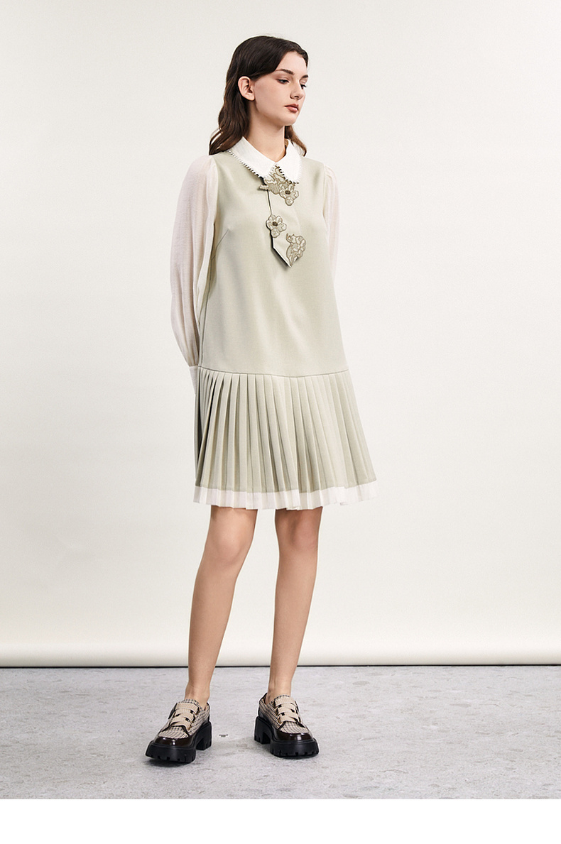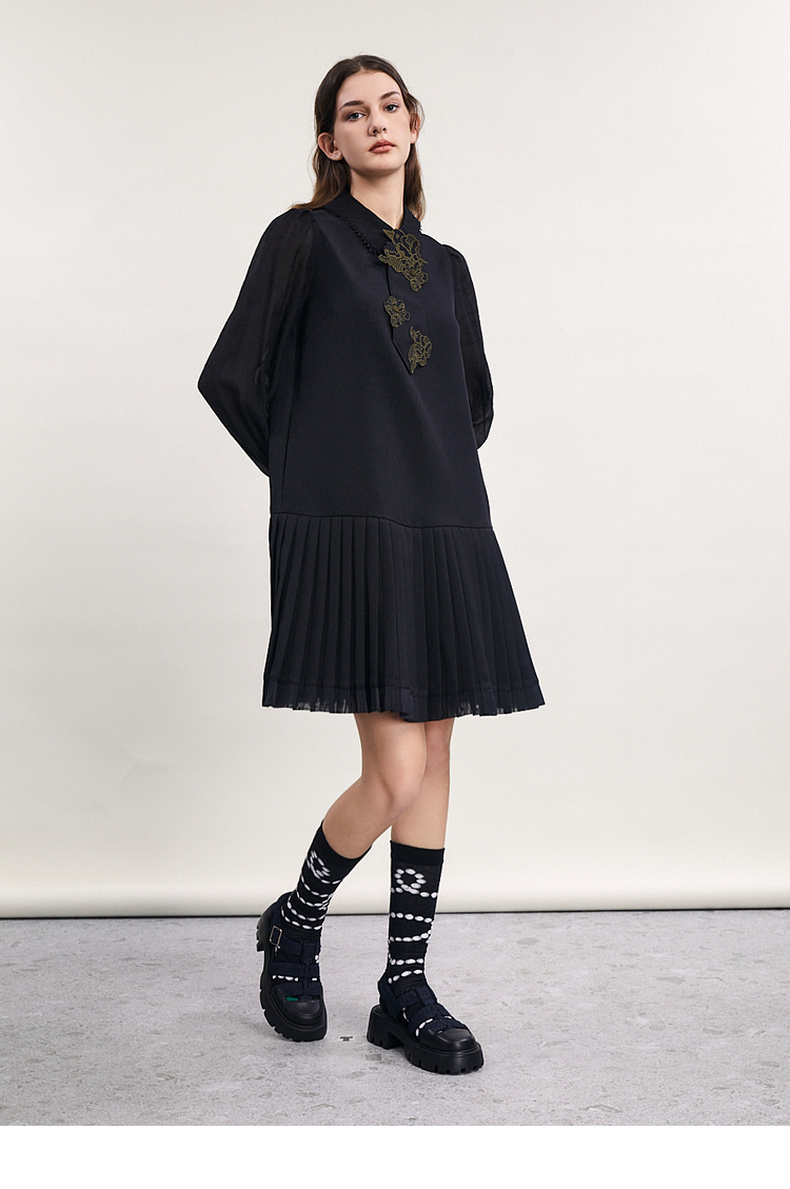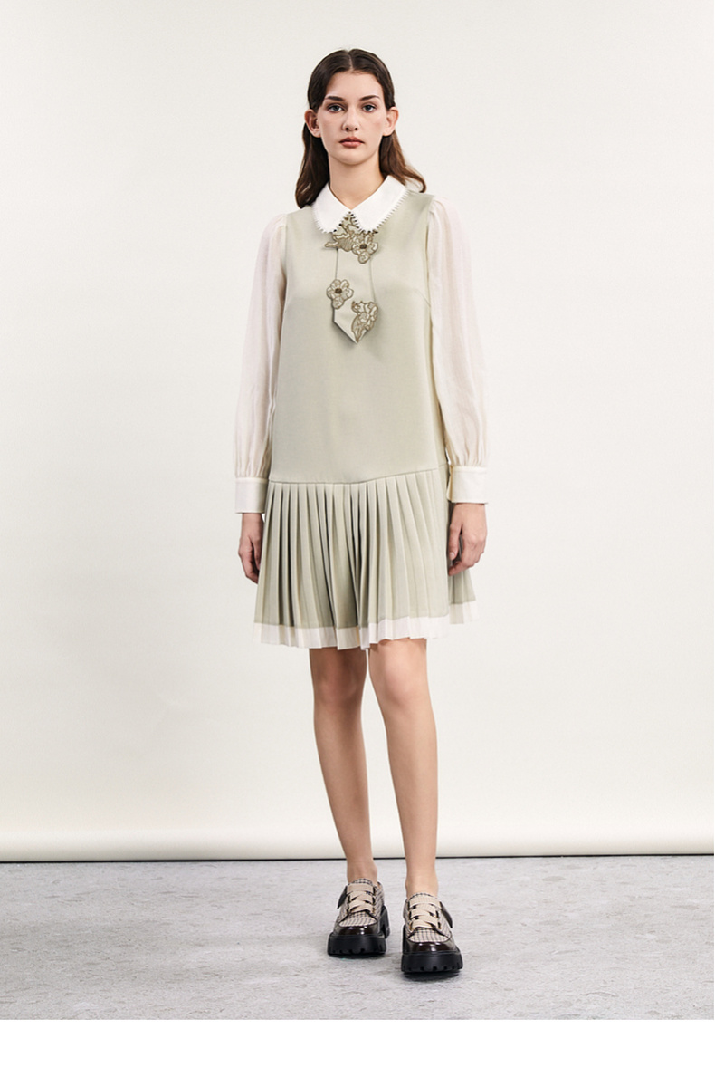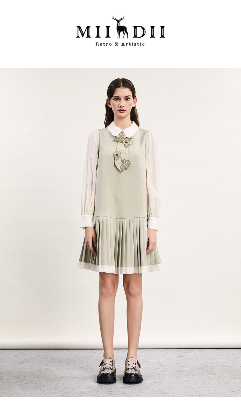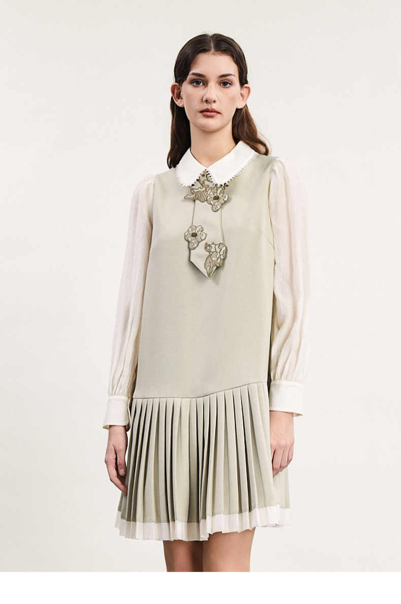 谜底百褶连衣裙长袖女2024春款学院风设计感拼接中长裙241ML0101