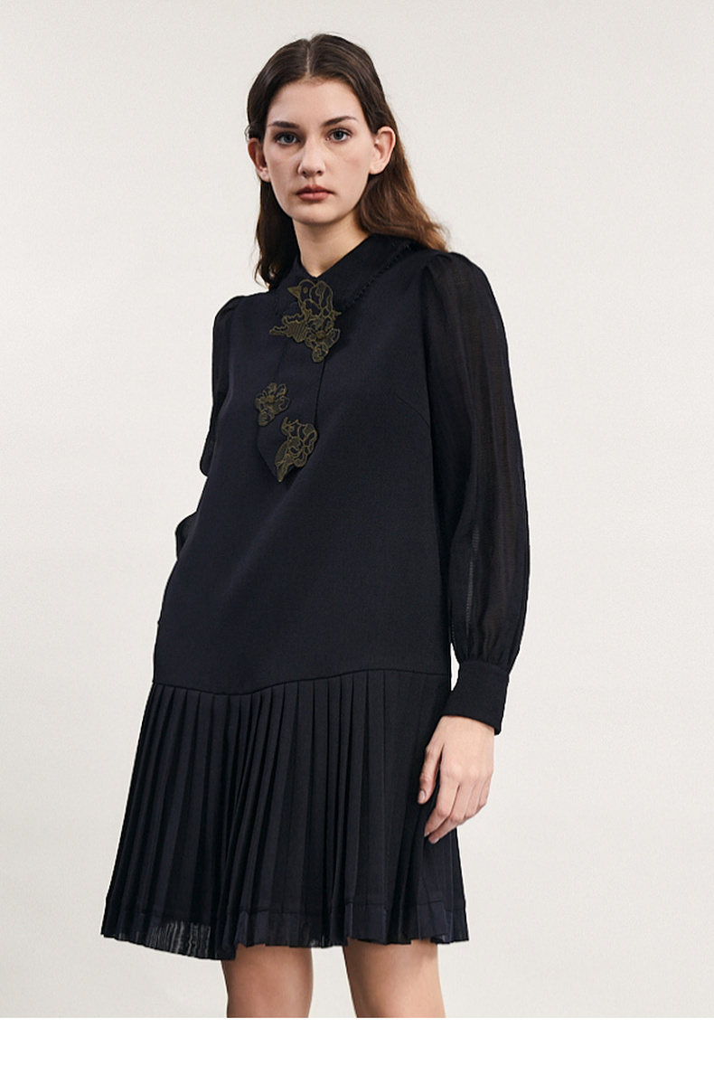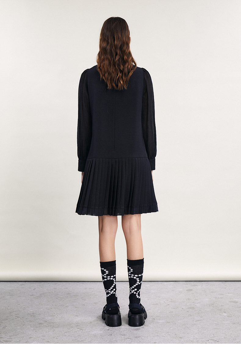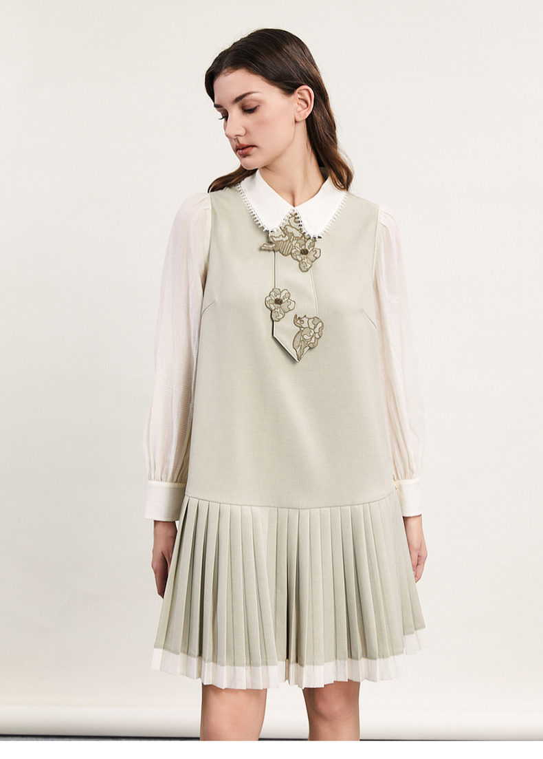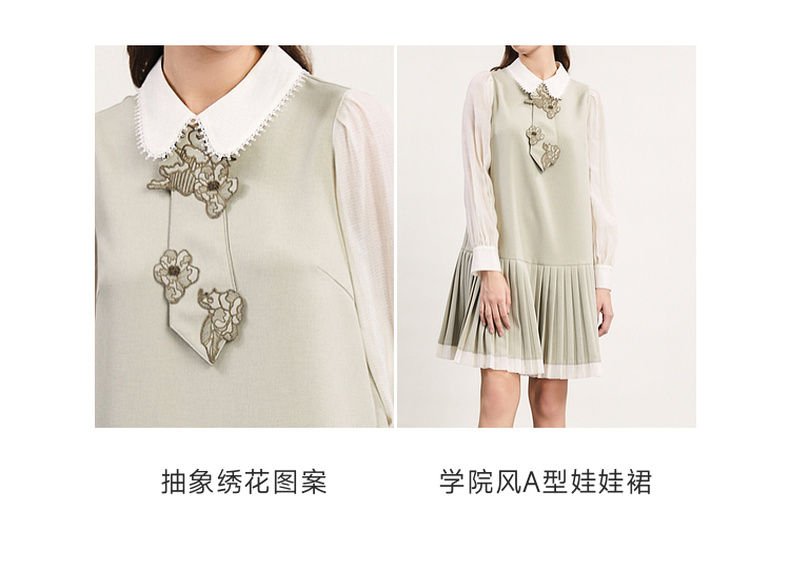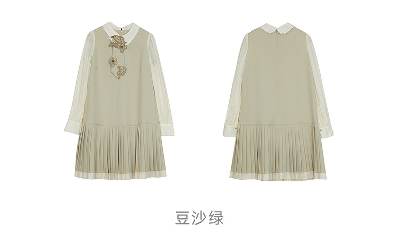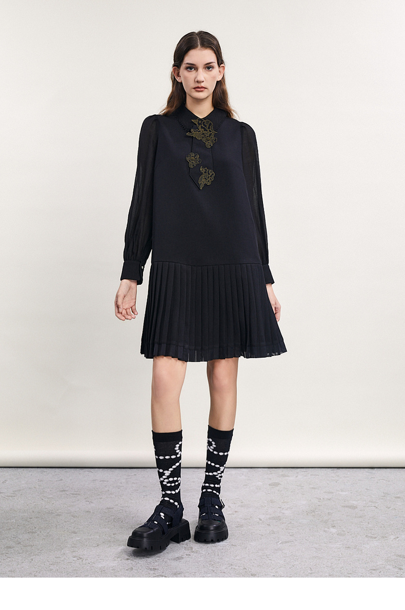 谜底百褶连衣裙长袖女2024春款学院风设计感拼接中长裙241ML0101