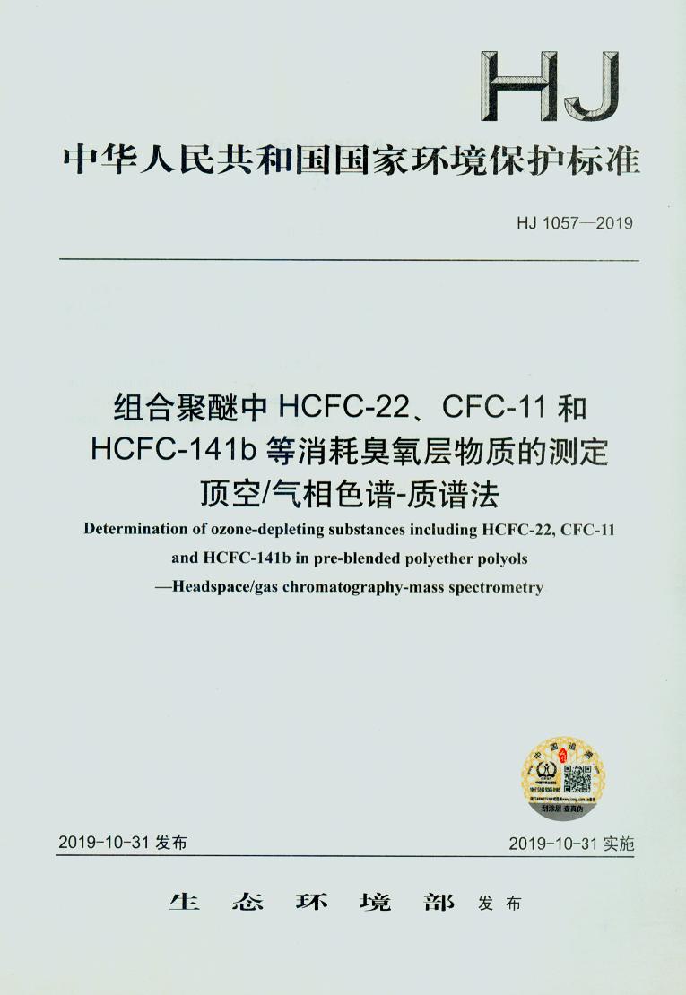 HJ 1057-2019 组合聚醚中HCFC-22、CFC-11和HCFC-141b等消耗臭氧层物质的测定 顶空/气相色谱-质谱法