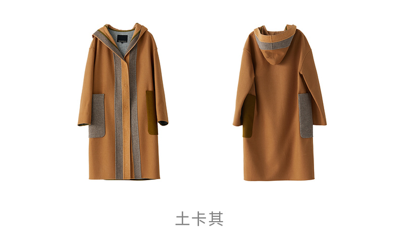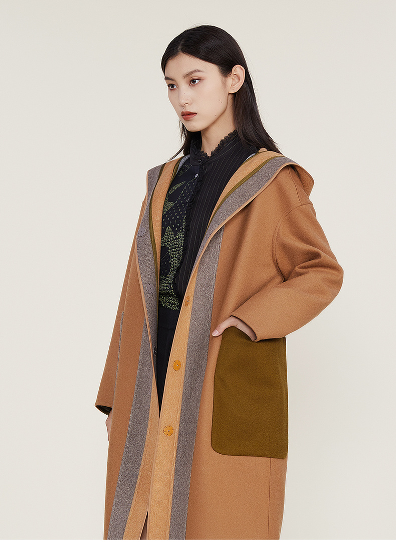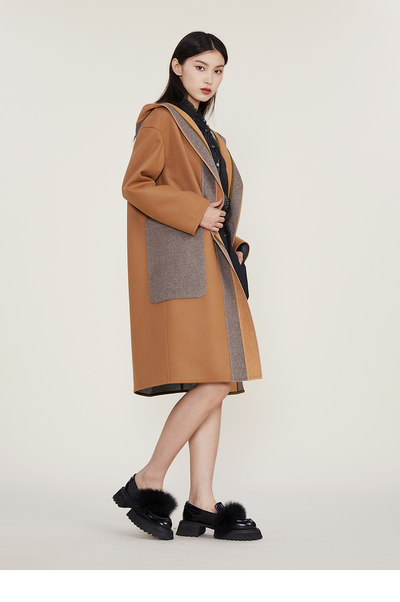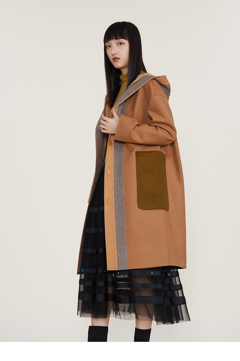 谜底2022冬季新款连帽毛呢大衣女宽松休闲拼接式长呢子224MD1701