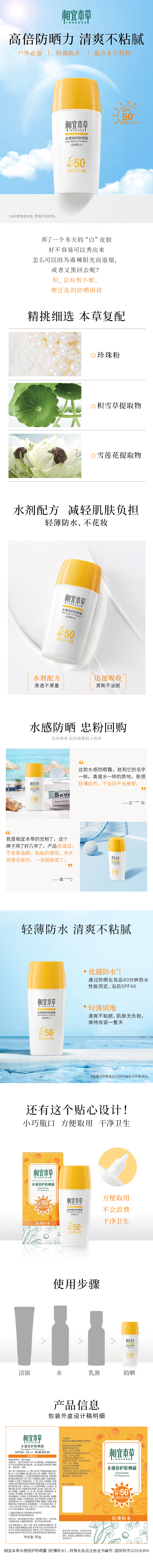 【热门防晒】相宜本草水感倍护防晒露SPF50+*50g 轻薄防水 高倍防晒力 清爽不粘腻
