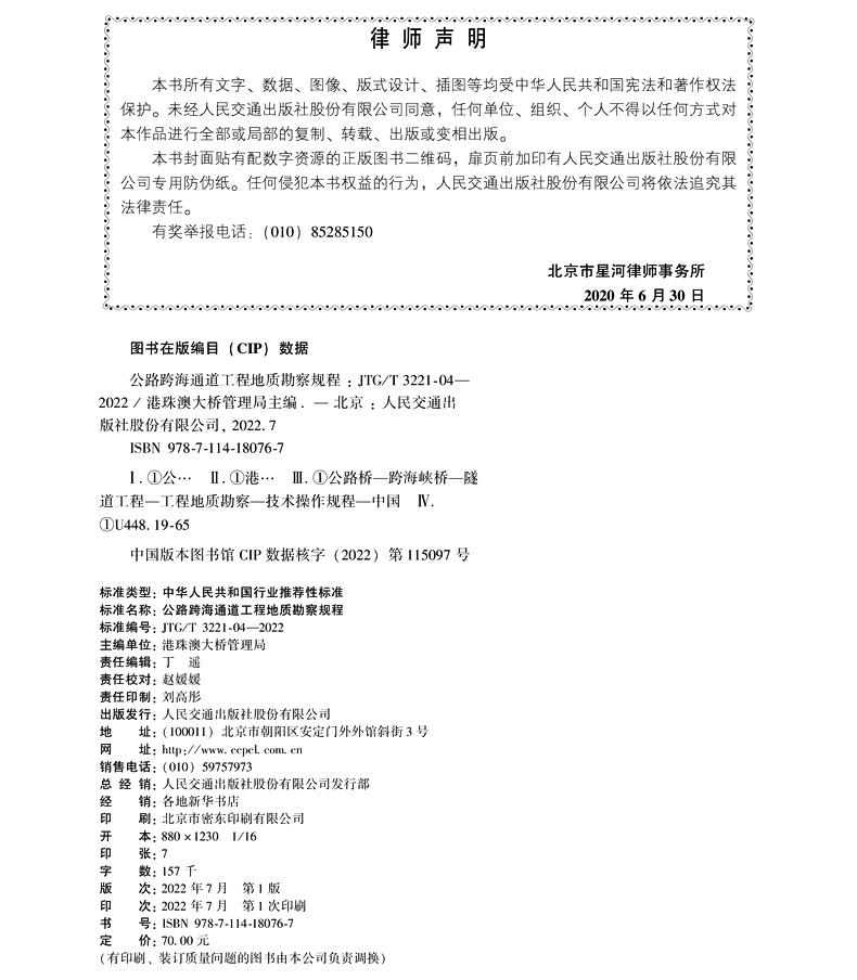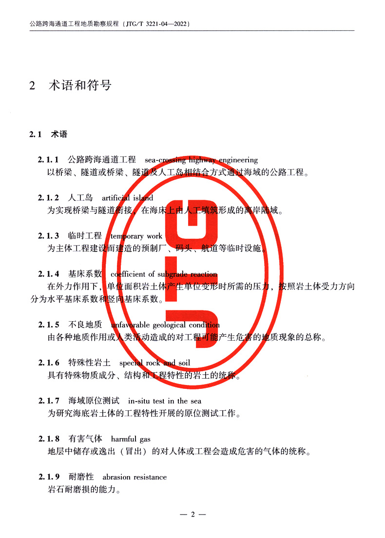书名:公路跨海通道工程地质勘察规程(JTG/T 3221-04—2022)