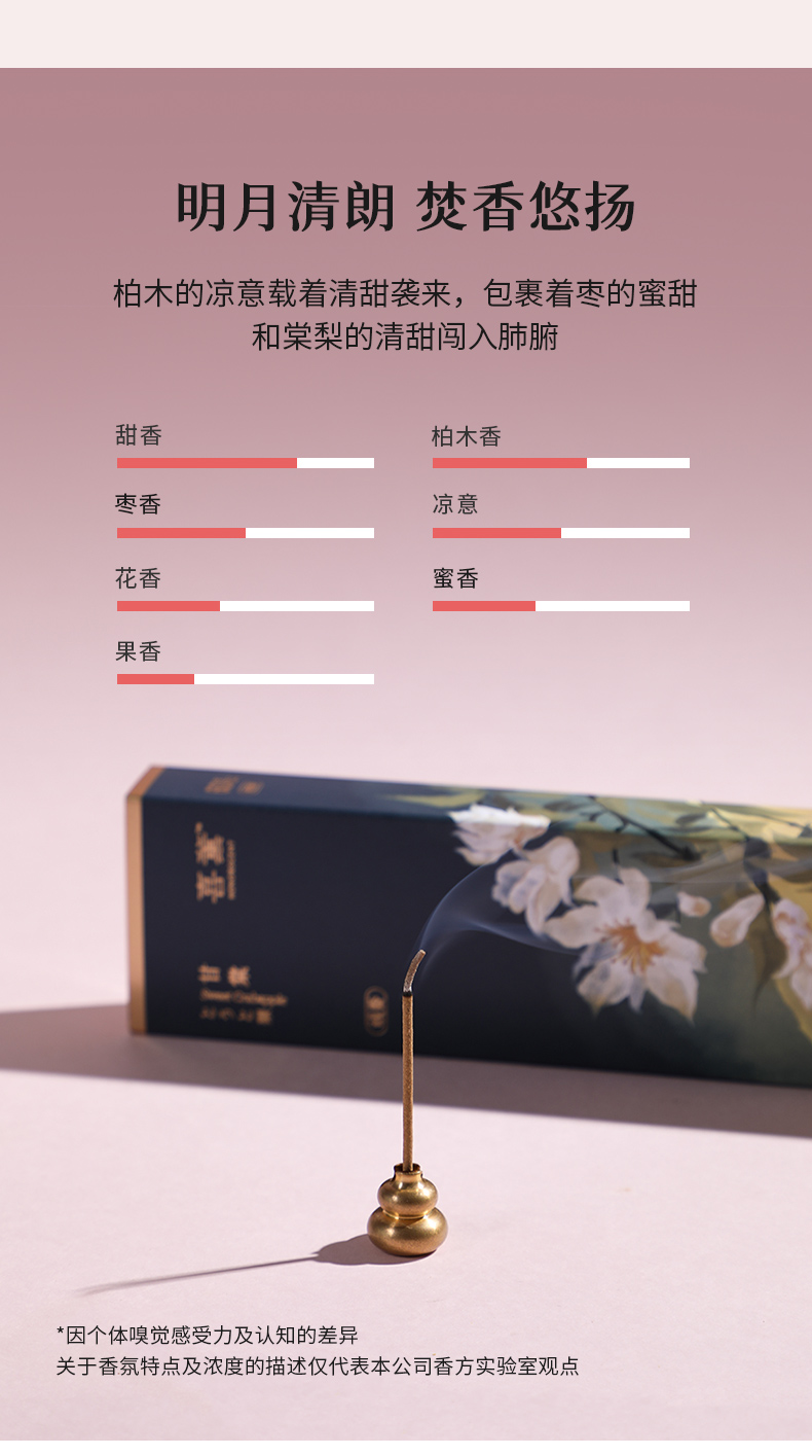 甘棠,古韵新调的新中式合香,以柏木为主料,以甘草、红枣等复构调和出清甜枣香调,营造女伴三两,浅语低吟的温柔香氛。