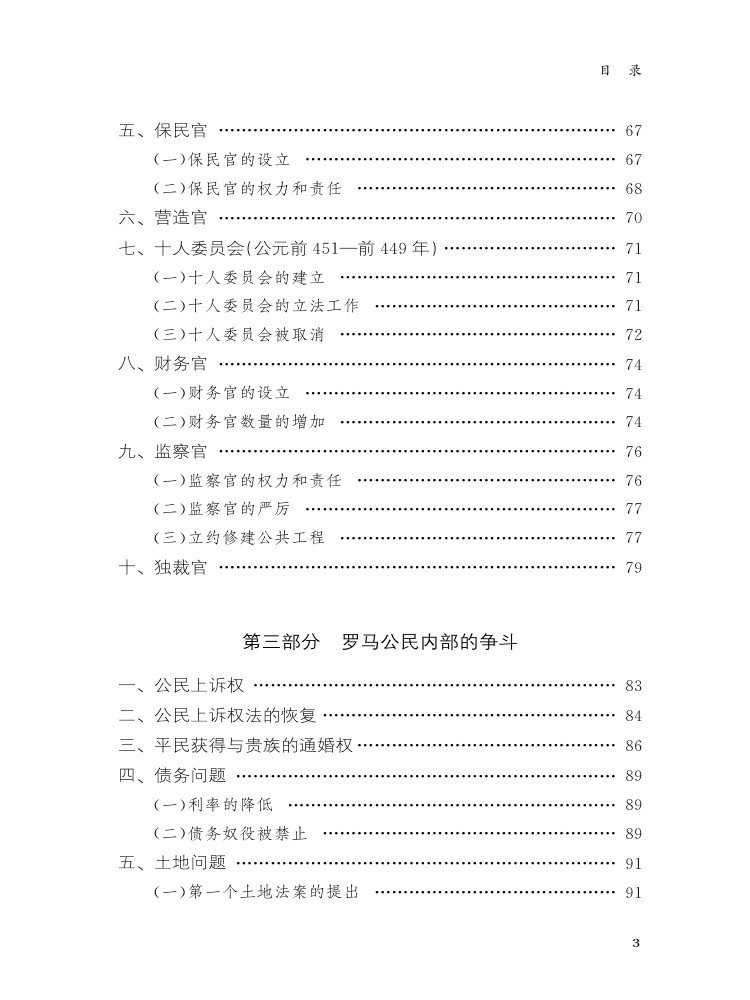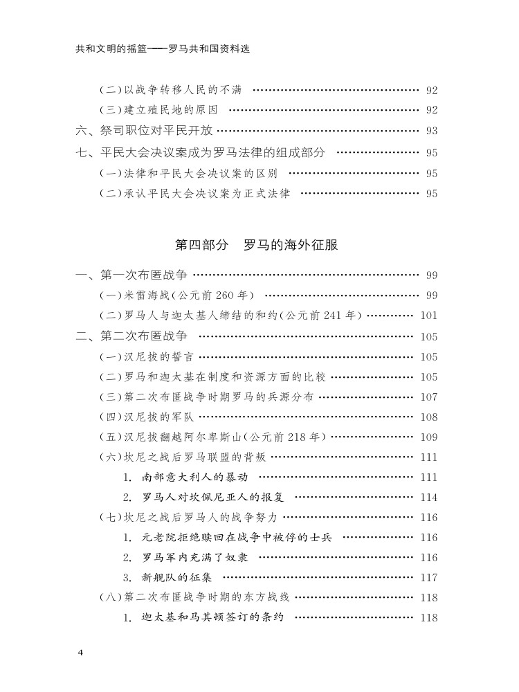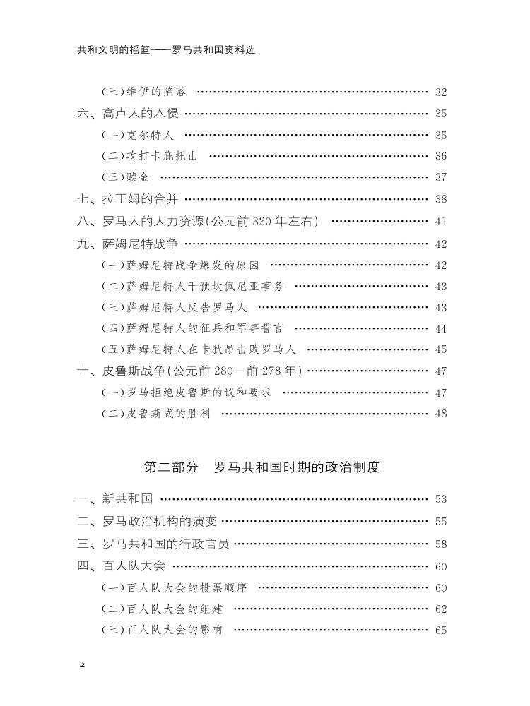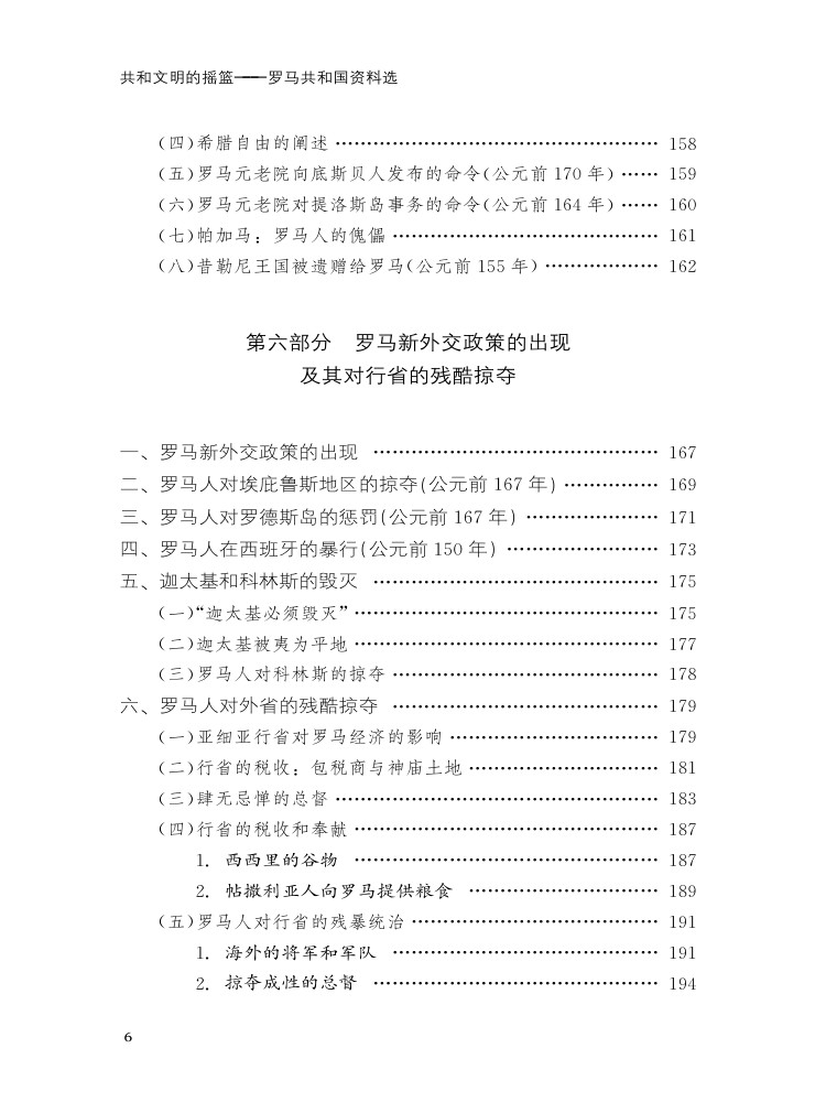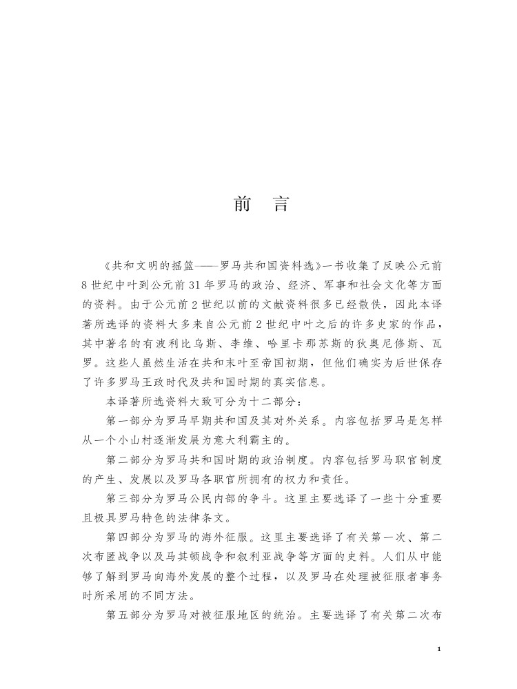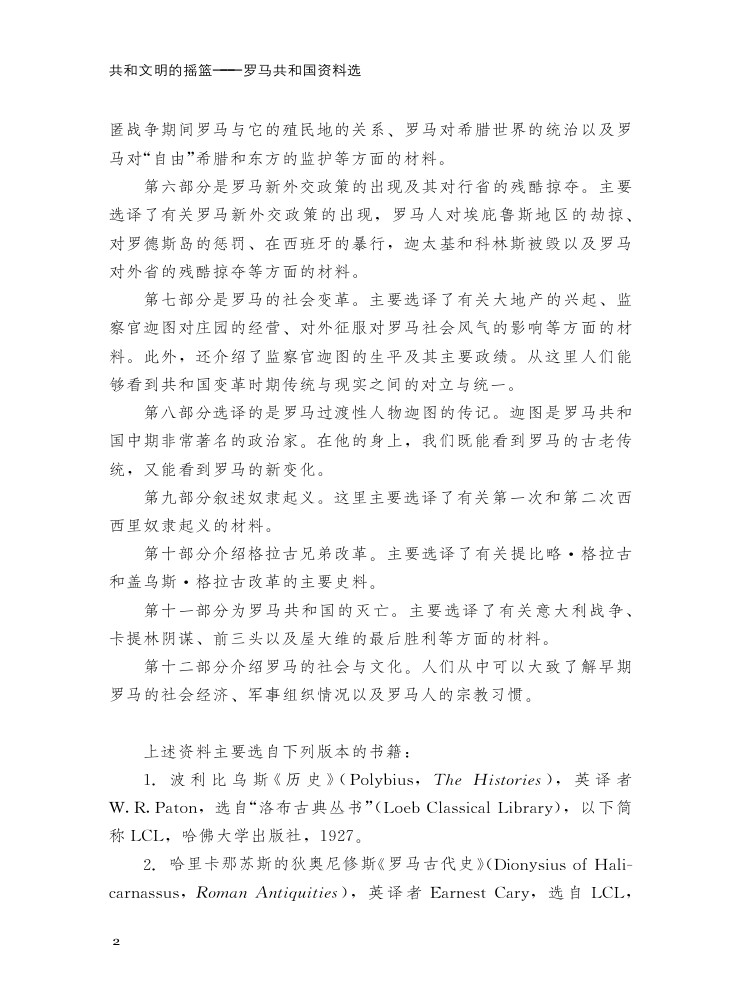 《共和文明的摇篮——罗马共和国资料选》一书收集了反映公元前 8世纪中叶到公元前 31年罗马的政治、经济、军事和社会文化等方面的资料,主要集中在以下若干方面:罗马早期共和国及其对外关系;罗马共和国时期的政治制度;罗马公民内部的争斗;罗马的海外征服;罗马对被征服地区的统治;罗马新外交政策的出现及其对行省的残酷掠夺;罗马的社会变革;监察官迦图;奴隶起义;格拉古兄弟改革;罗马共和国的灭亡;罗马的社会与文化。