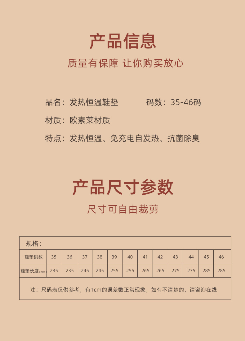 脚部保暖做好了,全身都会跟着暖起来,纳米发热除臭鞋垫,能够持续恒温一整天,让你从早暖到晚,一双鞋垫就能解决你一整个冬天的困扰。