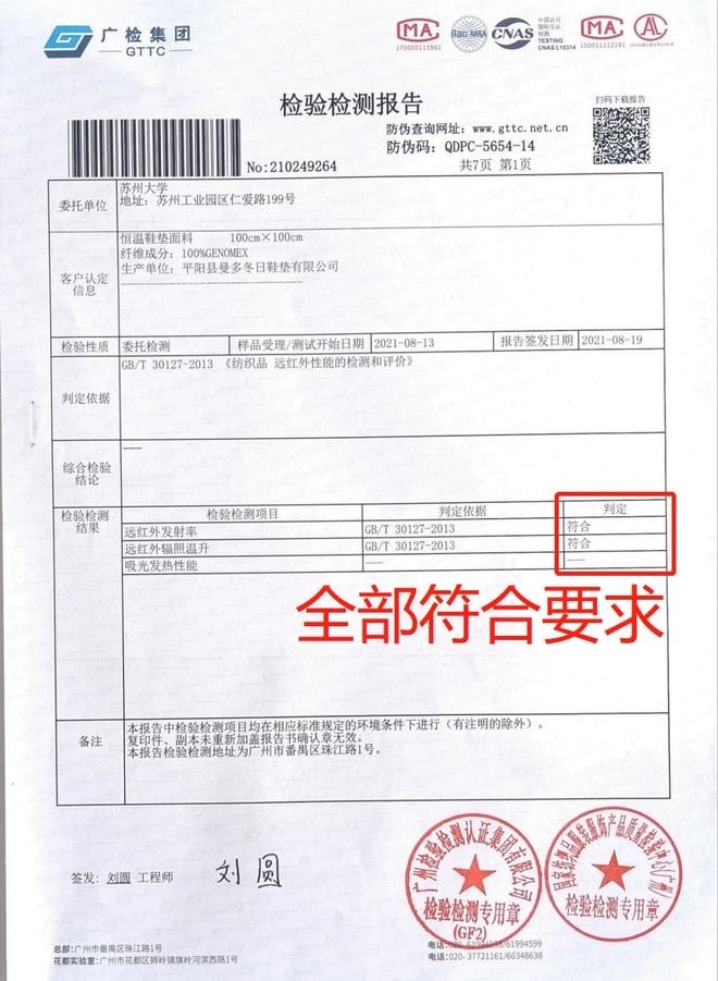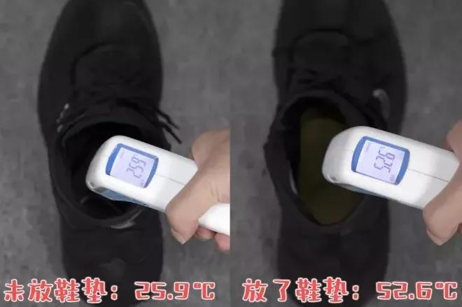 拿到样品后,我们也进行了测试,用体温枪测试用了纳米鞋垫前后的温度对比,温度数值和实验室数据相近。