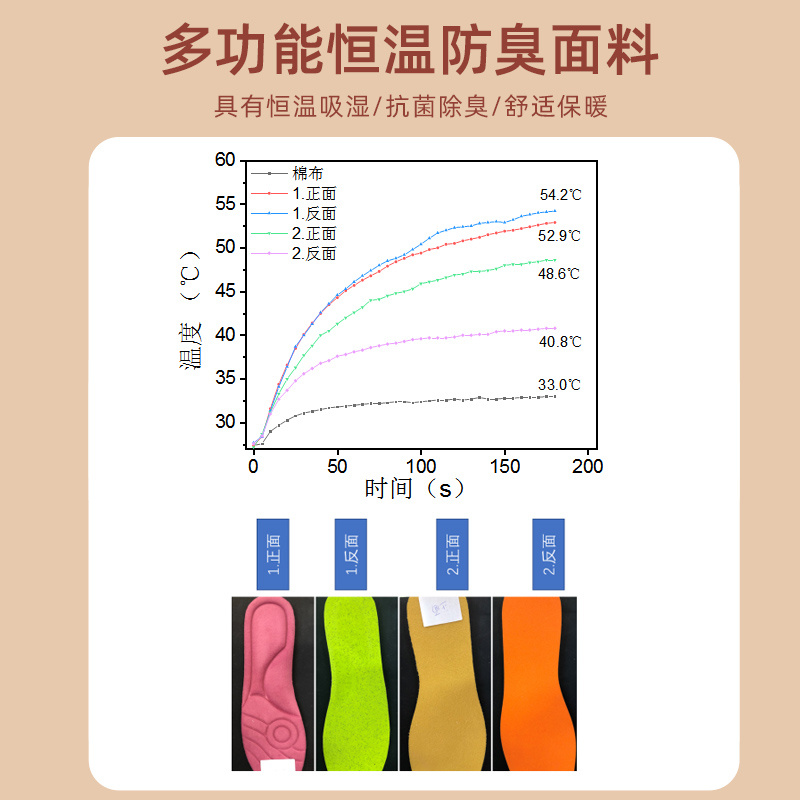 从苏州大学研究室给的实验数据来看,将棉布和纳米鞋垫同时放在鞋底,3分钟后可以明显看到,纳米鞋垫正面的温度基本都达到50℃以上,而棉布仅有33℃,最大相差了21℃!