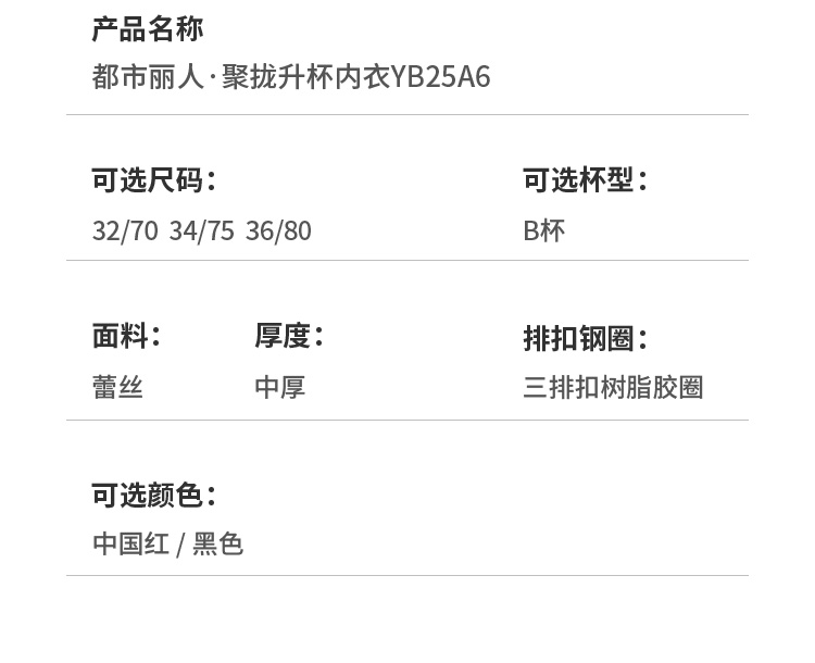 都市丽人聚拢升杯聚拢杯B杯常规内衣蕾丝中厚3/4杯文胸三排扣无钢圈YB25A6