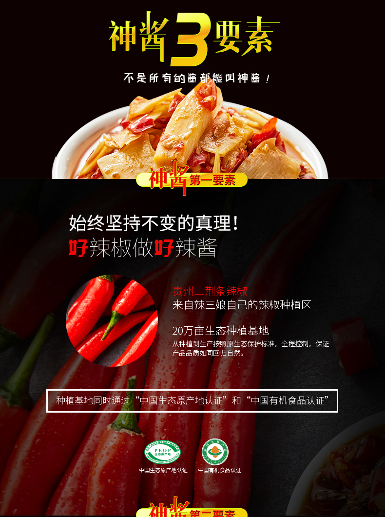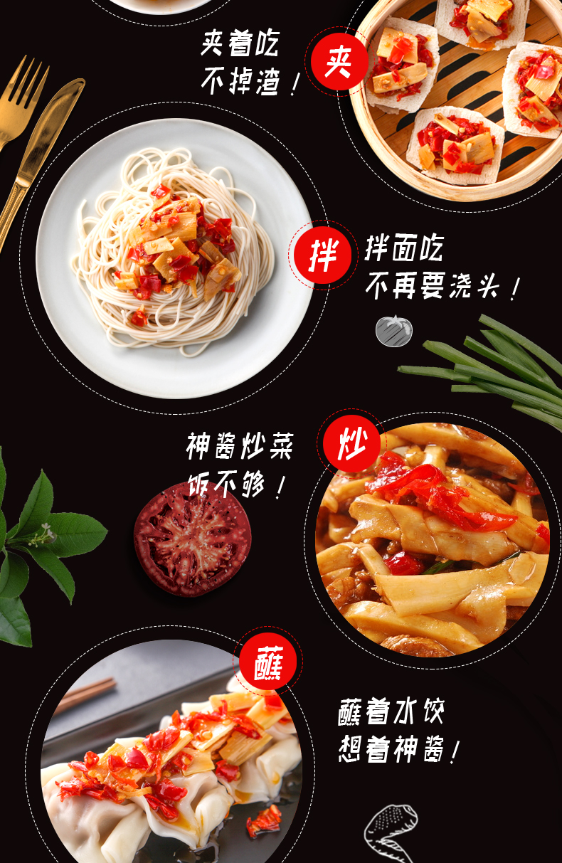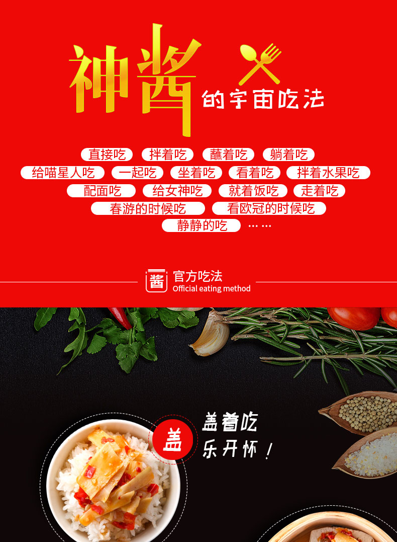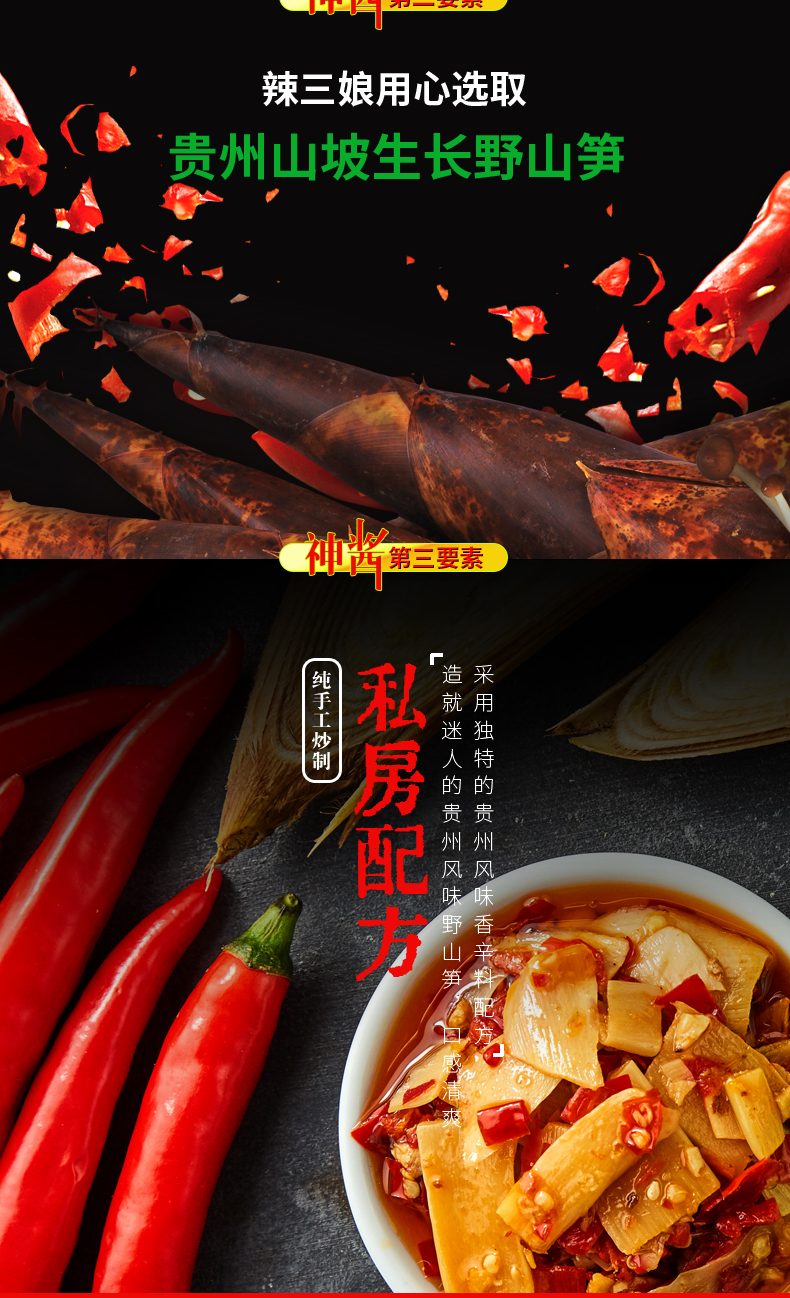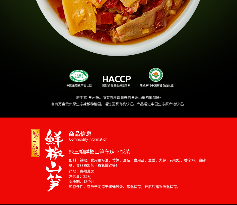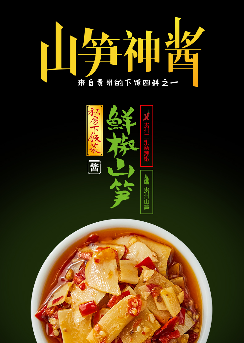 精选高原山笋及鲜椒等佐料制作而成,油香四溢,味厚鲜美,适用于拌饭,炒菜,煲汤