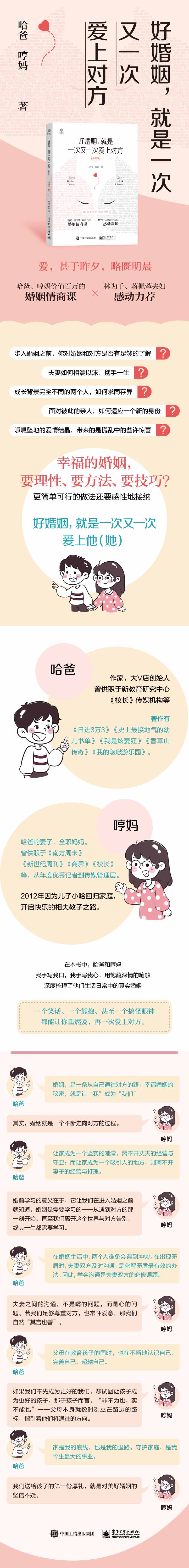 哈爸和哼妈从经营亲密关系出发,深度梳理二人的真实经历,通过夫妻对谈的形式,联手为读者打造了一堂亲密关系及家庭幸福成长课。本书涵盖了夫妻关系、家庭关系、亲子关系等一系列人生中的重要关系,针对在这些关系中如何成为更好的自己,以及如何给自己的家庭和伴侣带去幸福这些当下人们关注的痛点,给读者带来启发。 婚姻是需要经营的,经营婚姻需要方法和技巧。读完本书,每个人都可以从中领悟到如何在亲密关系中成为更好的自己,以及如何给自己的家庭和伴侣带去幸福。