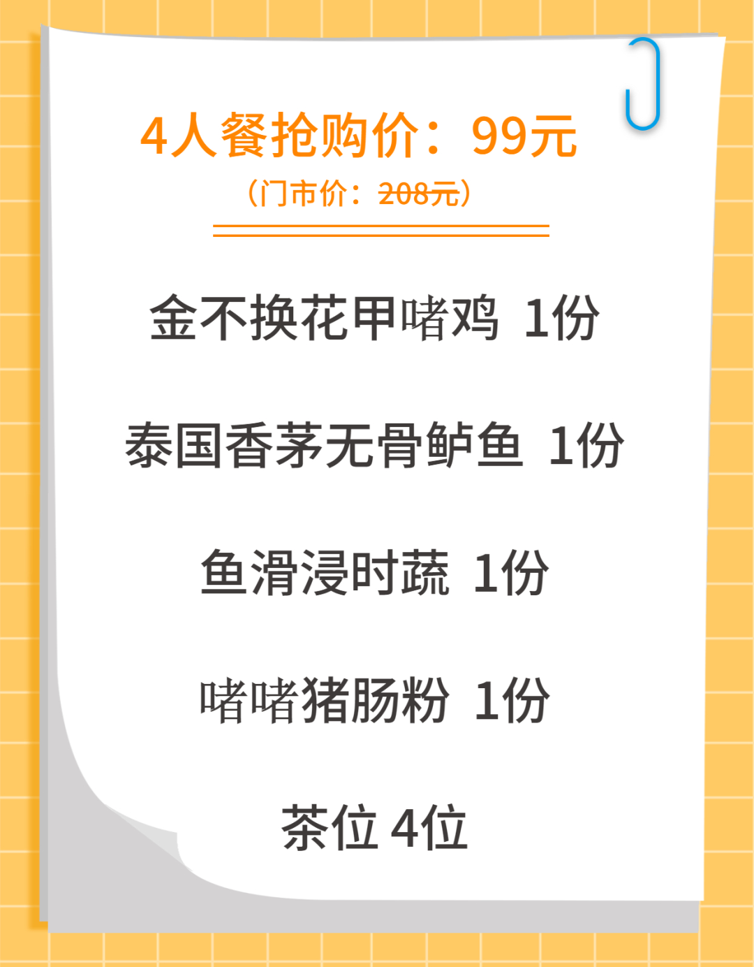 4人套餐抢购价:99元(门市价:208元)
