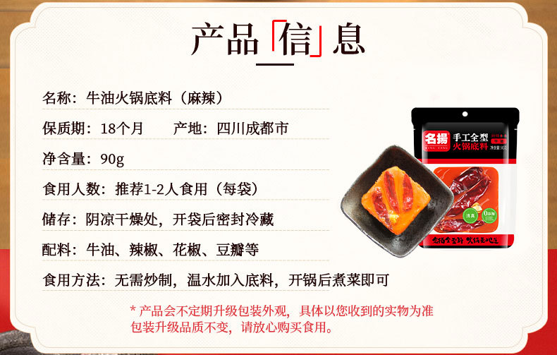 名扬小块火锅底料90g 小包装一人份微辣正宗重庆四川火锅料一人食