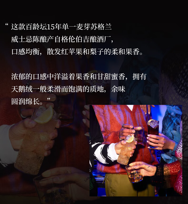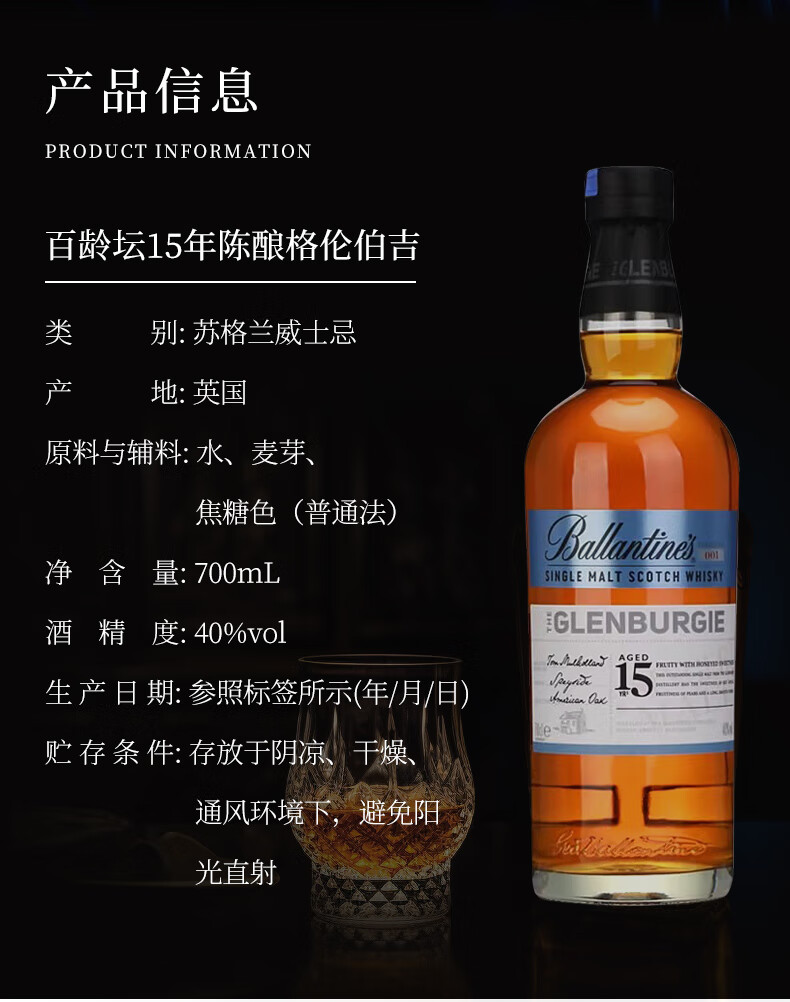 百龄坛15年格伦伯吉系列 苏格兰单一麦芽威士忌 进口洋酒 700ml