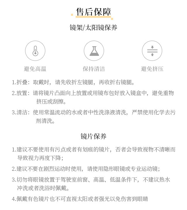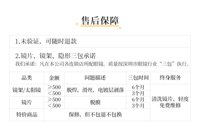 7、镜片属于加工定制商品,凡已核销,不支持退、换服务(如商品存在质量问题,则由门店根据售后服务条款处理,敬请谅解)。