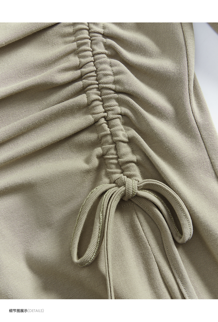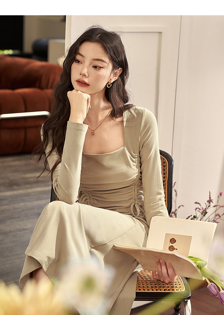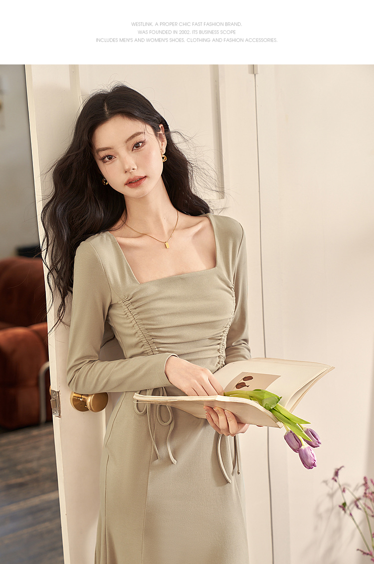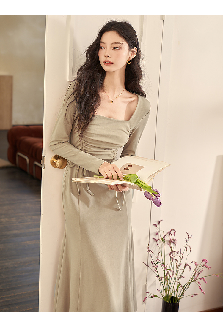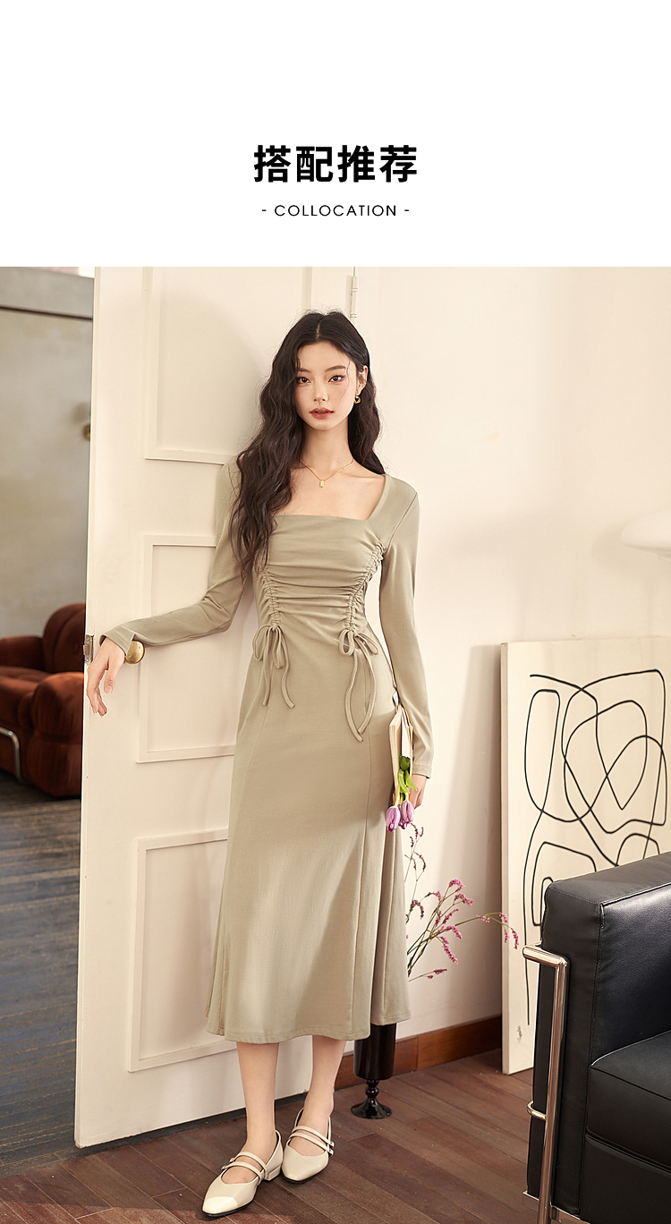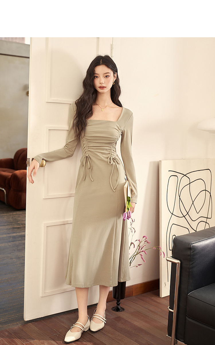 法式方领纯色长袖a字连衣裙秋季新款气质抽褶显瘦长款裙子V1831974