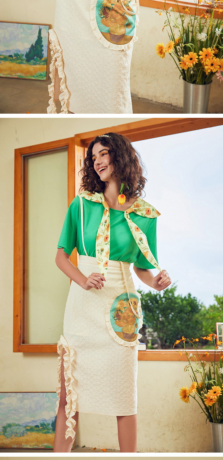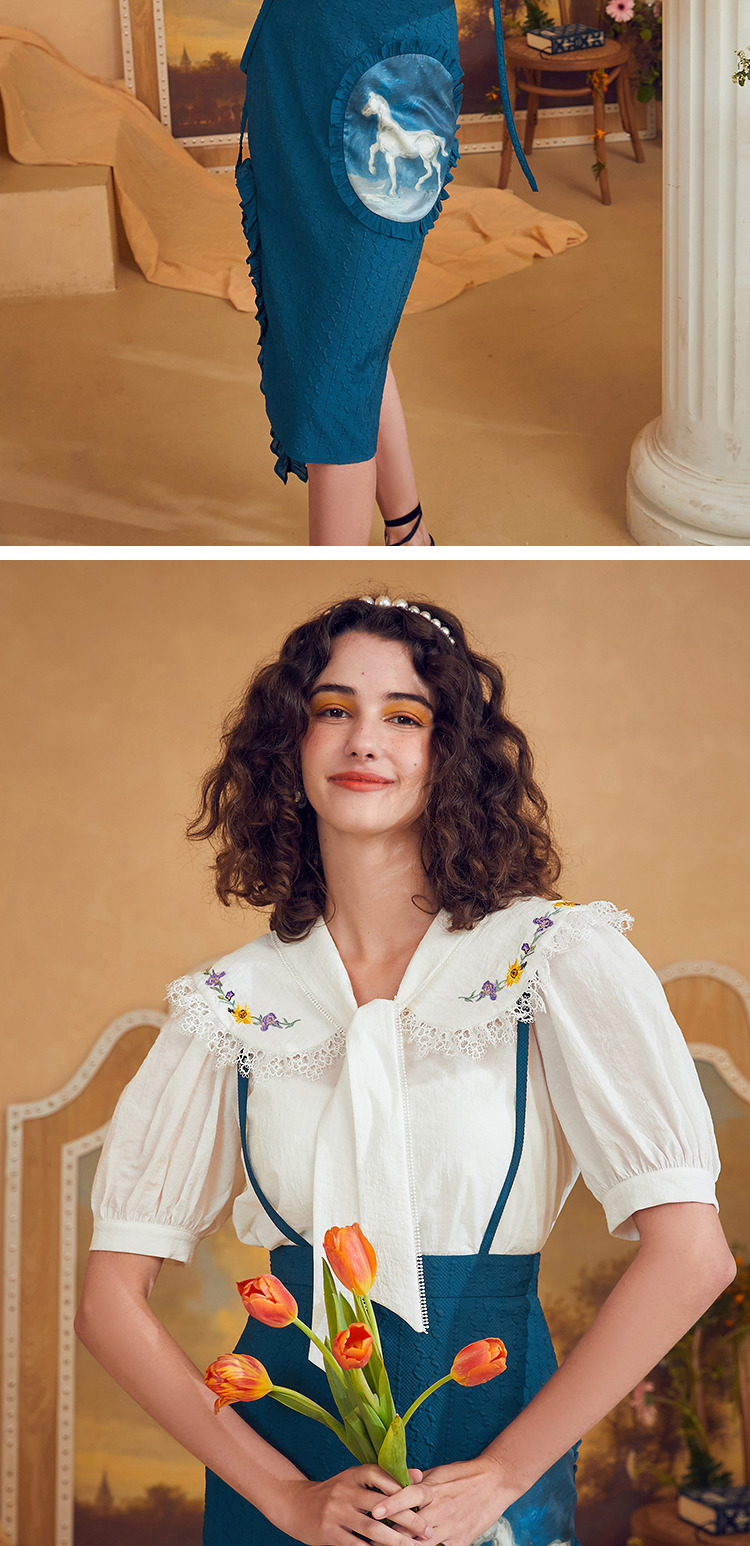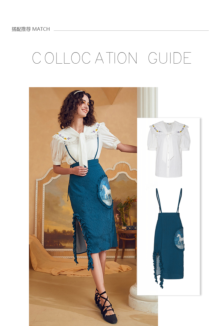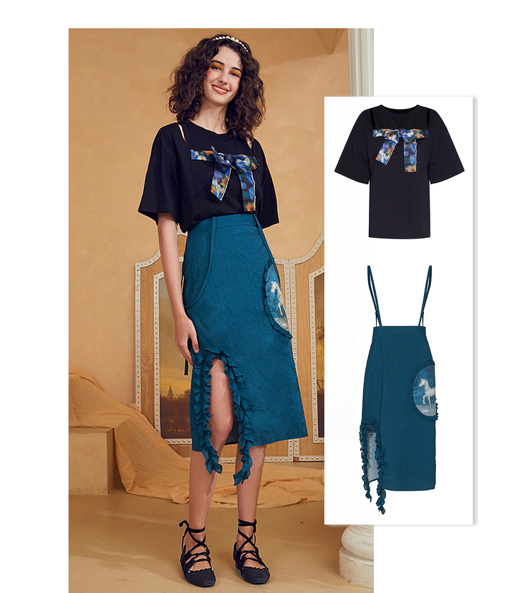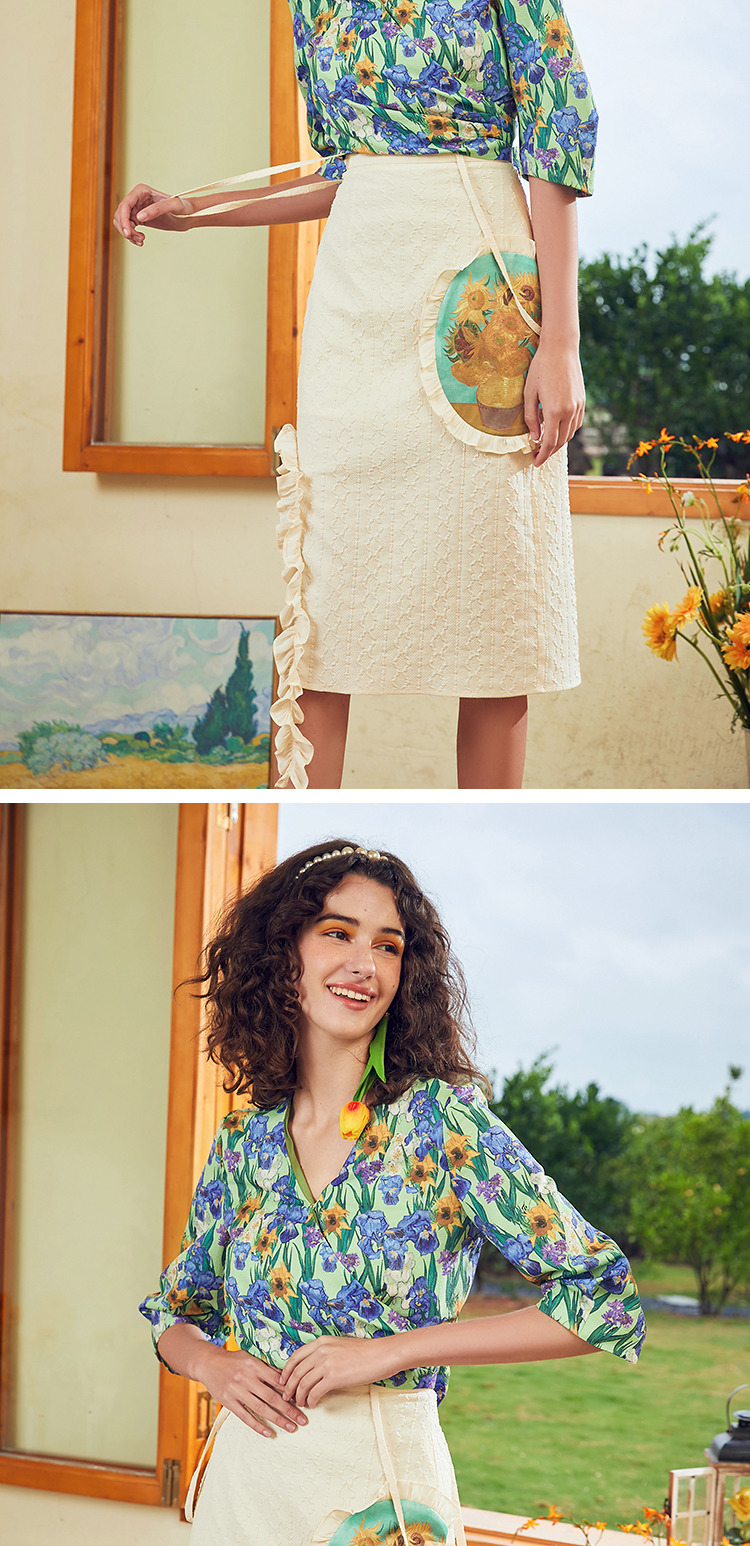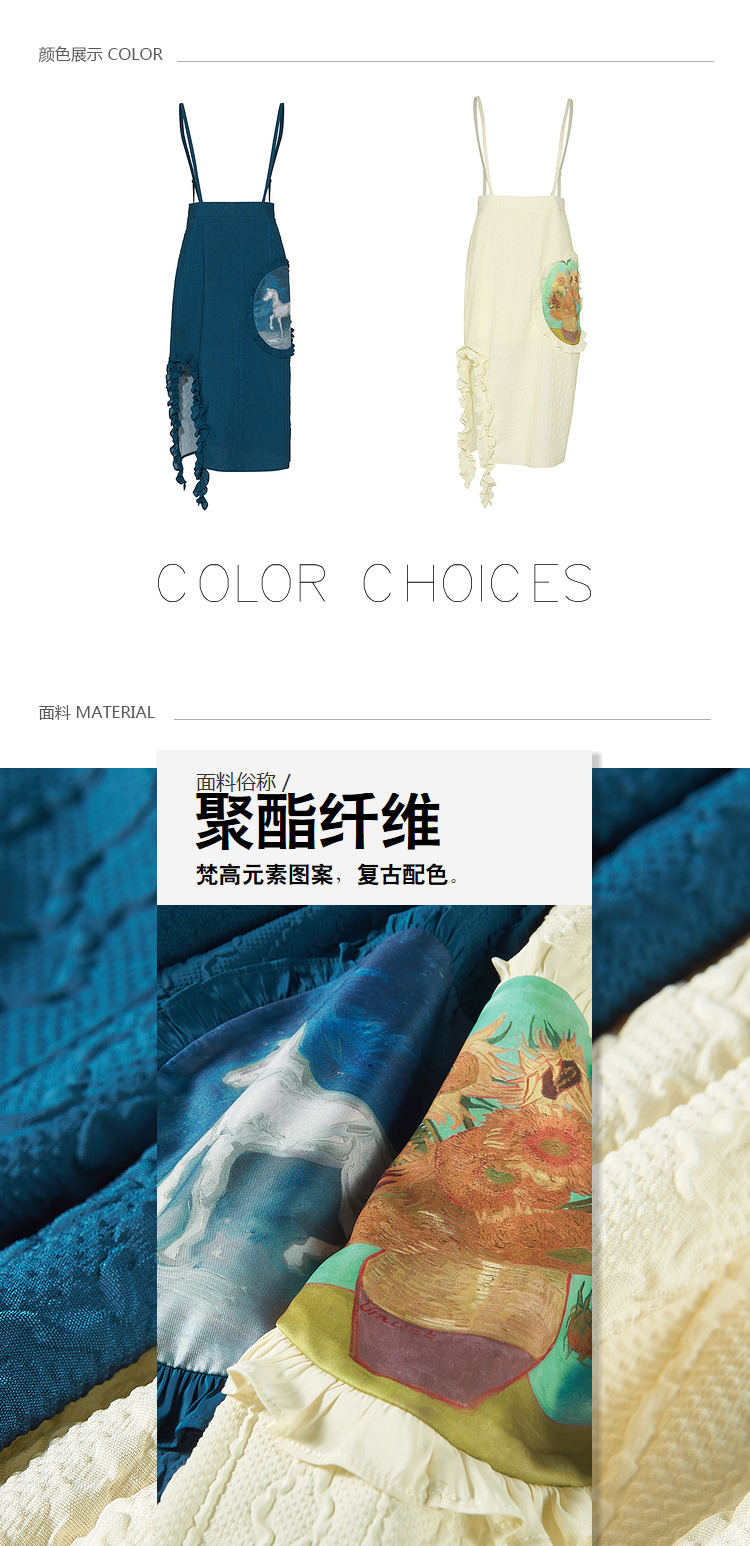 半身裙 两三事梵高系列亲自征/战夏季新款印花贴布绣木耳边背带半身裙