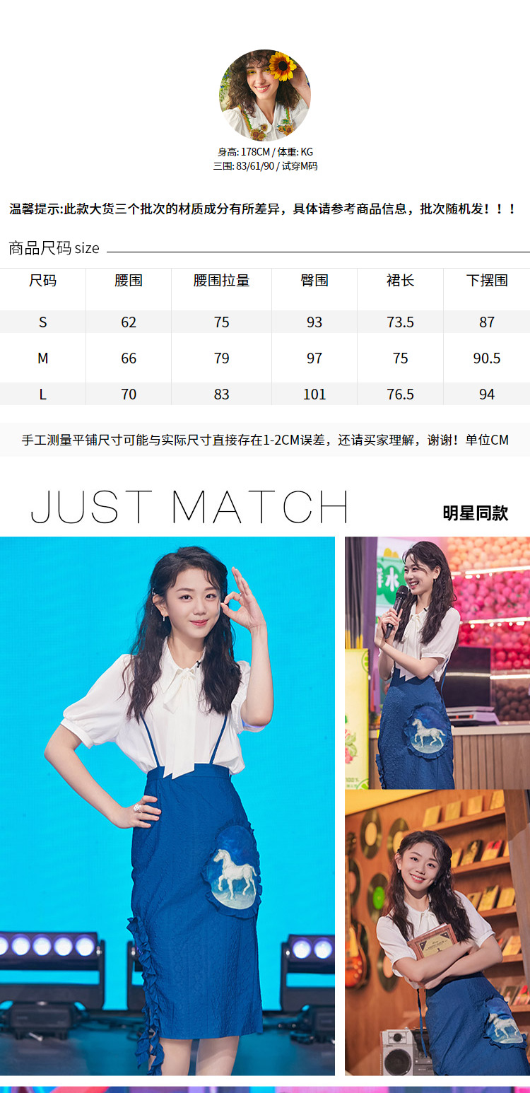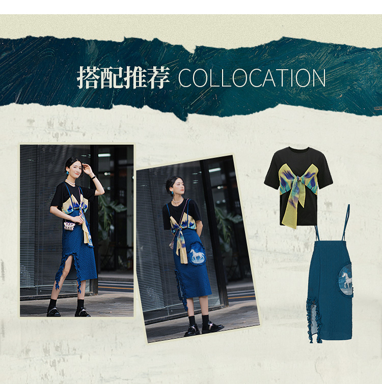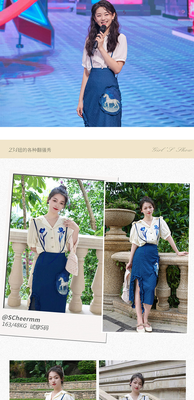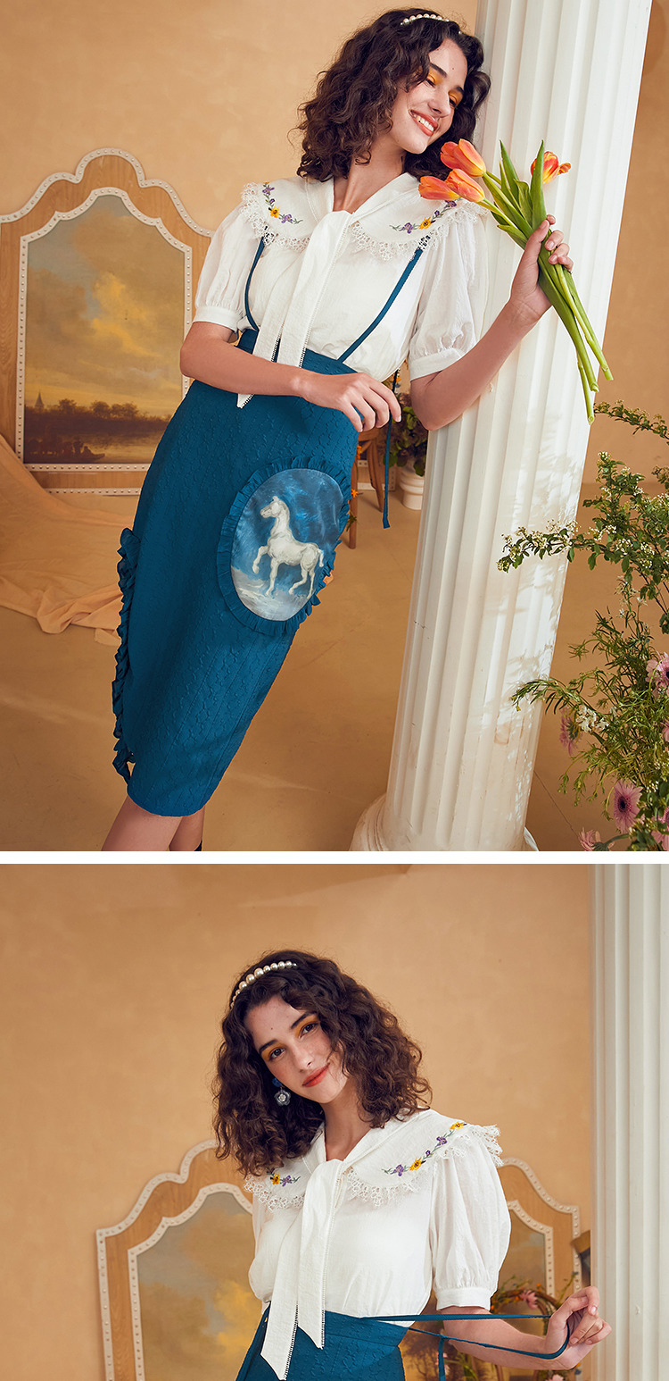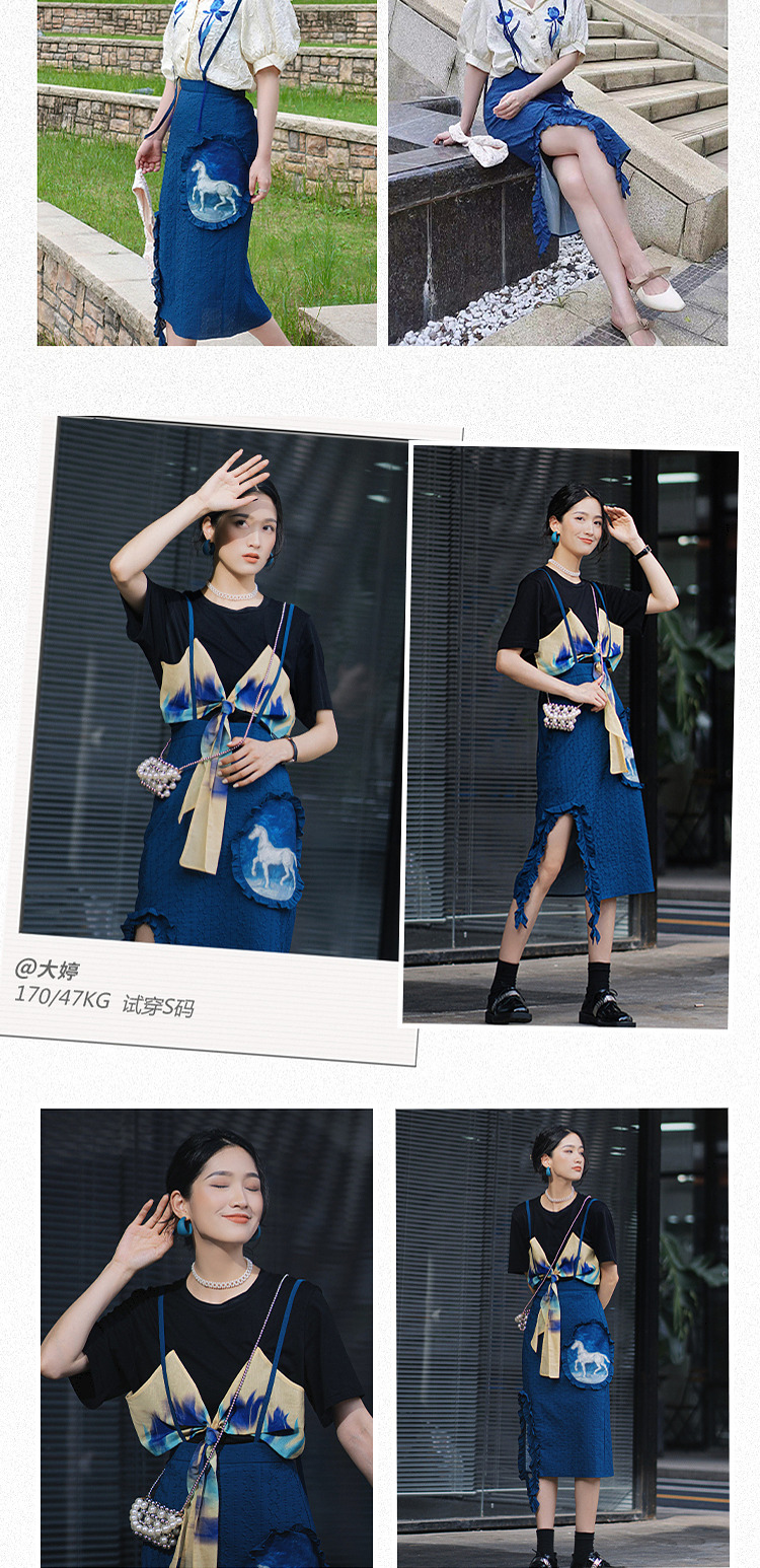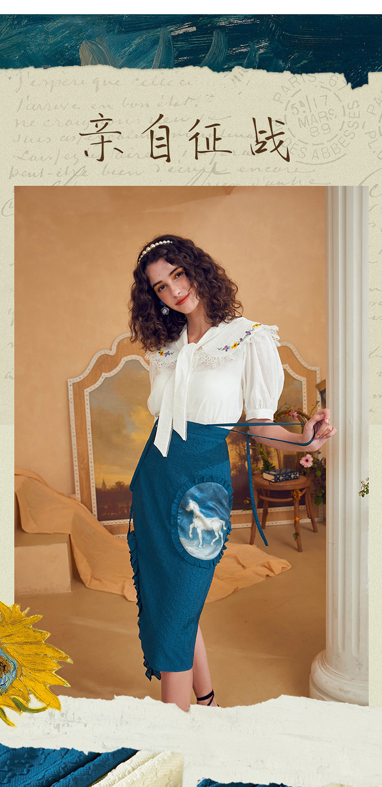 半身裙 两三事梵高系列亲自征/战夏季新款印花贴布绣木耳边背带半身裙