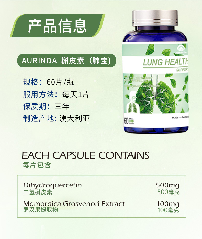 [AURINDA]澳琳达槲皮素60片/瓶二氢复合护肺部养保健品罗汉果