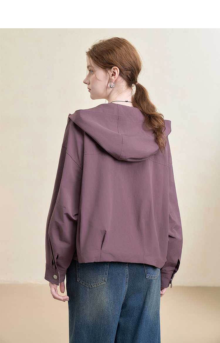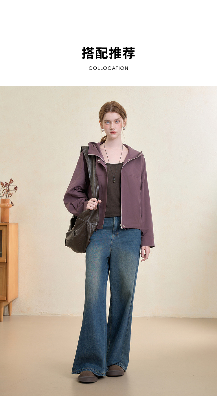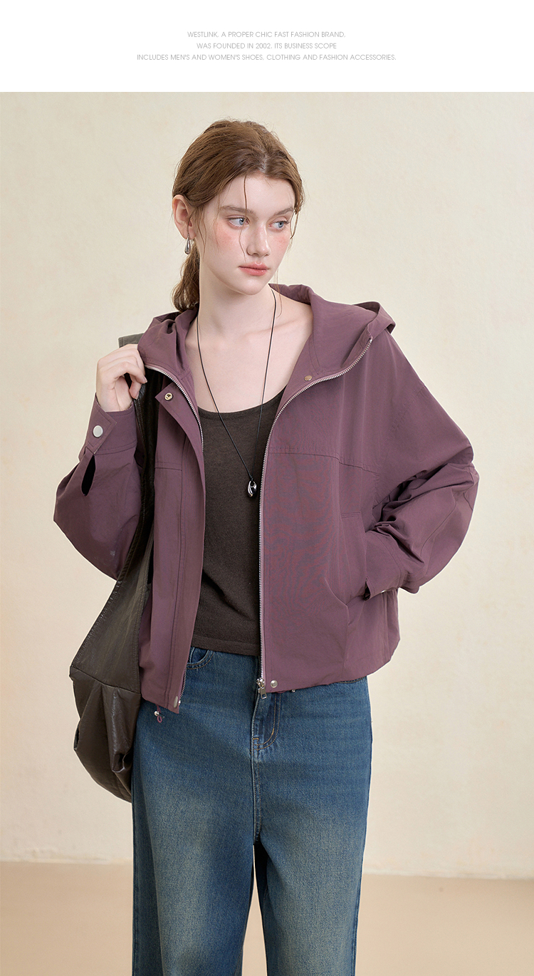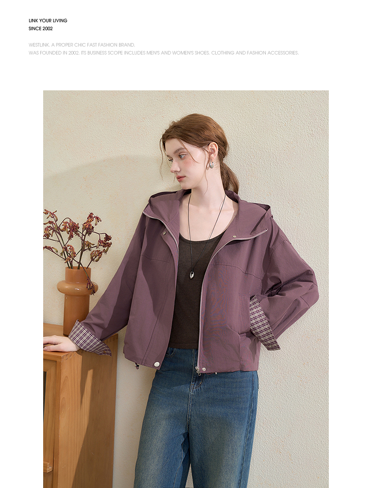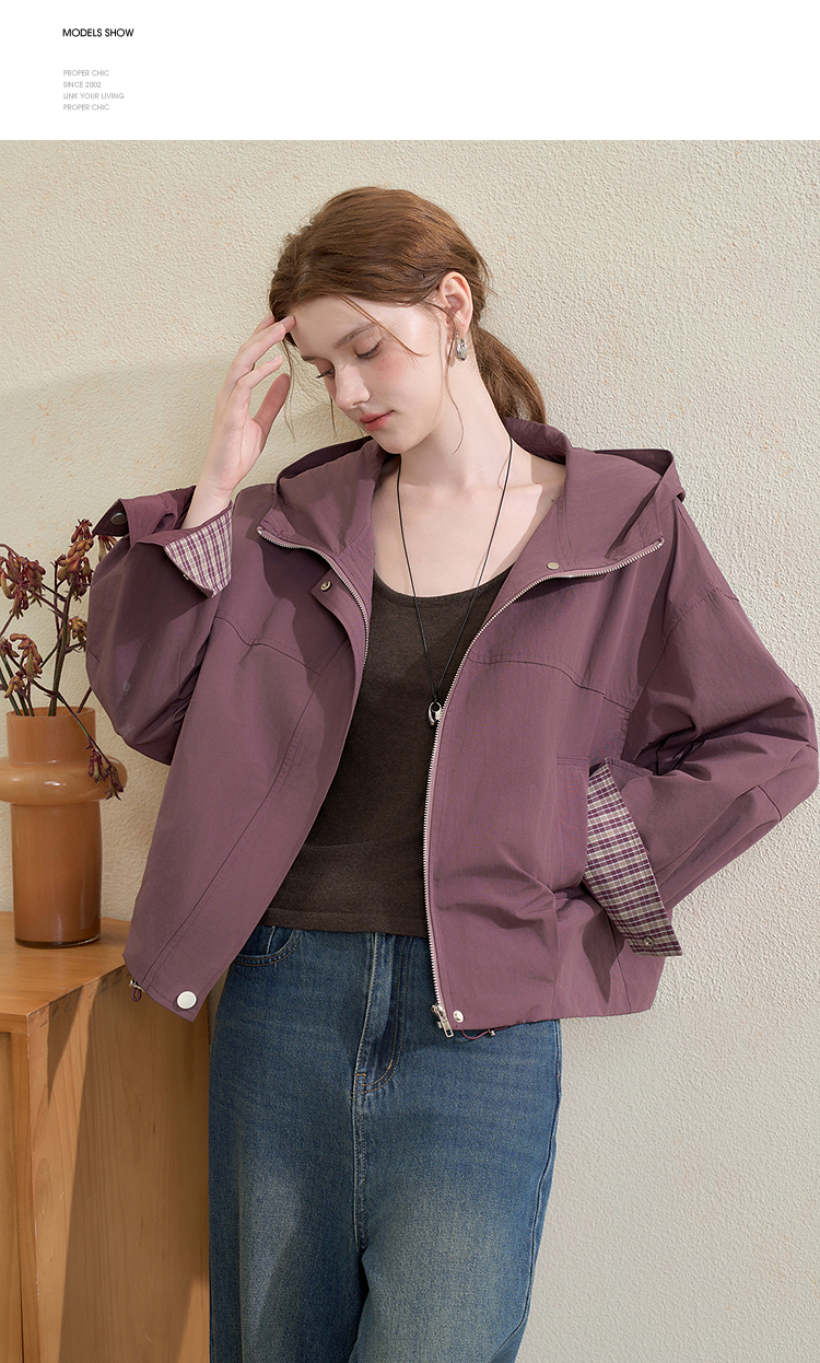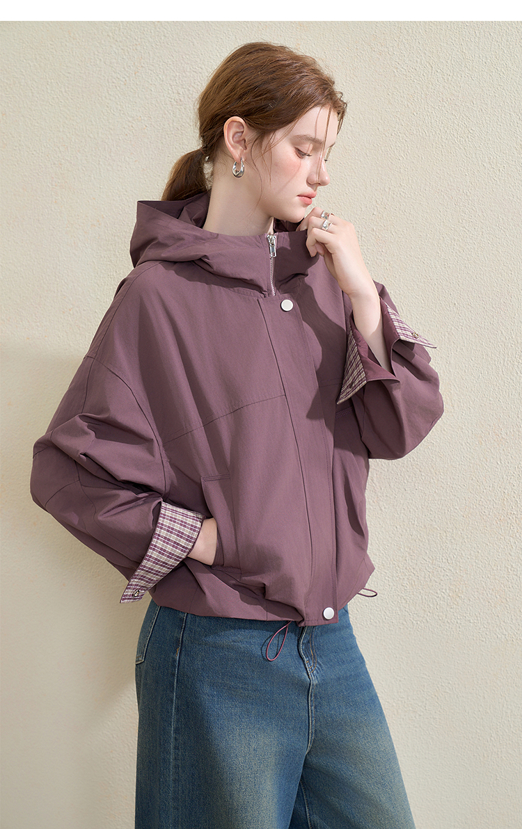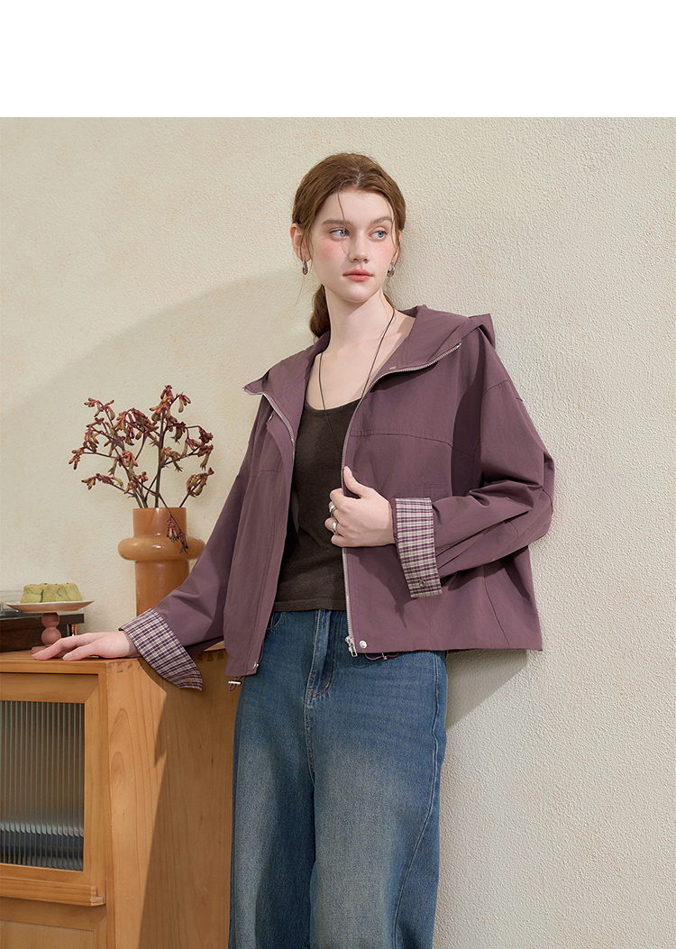 西遇韩系格纹拼接连帽外套女秋季宽松显瘦休闲百搭短款上衣V3151248