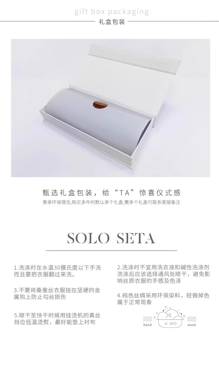 - soloseta专注于真丝织物,灵感源自意大利语,中文含义为“只做真丝”的意思。让睡衣变时尚,居家和外出瞬间切换,使其更具有出街,度假,参加宴会等功能。