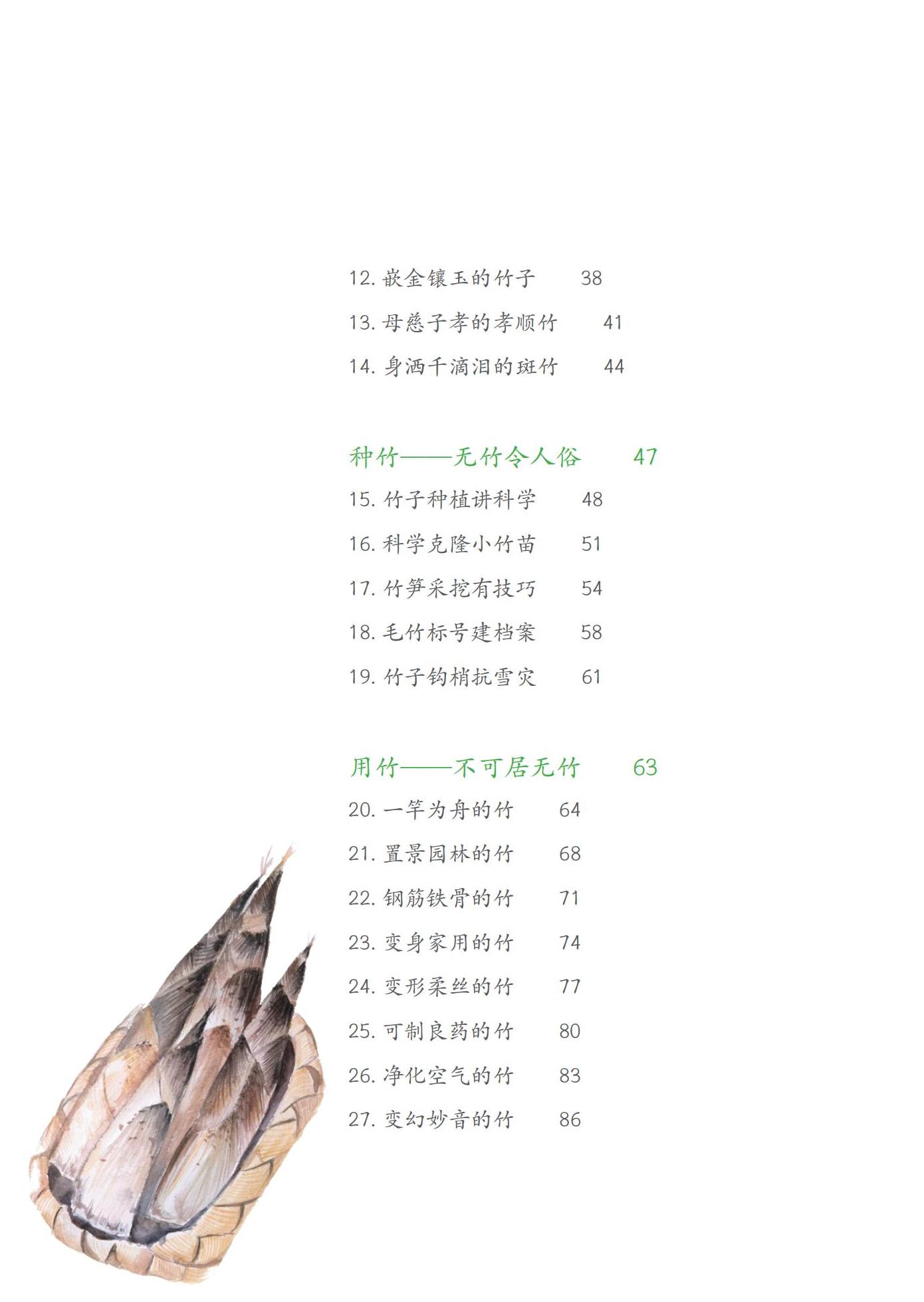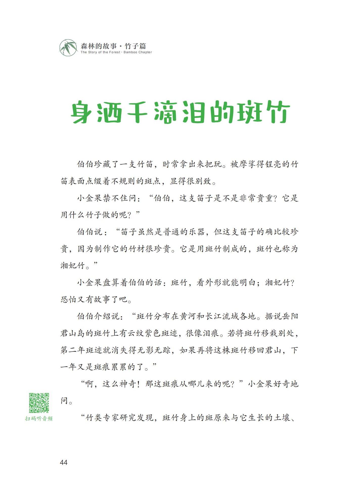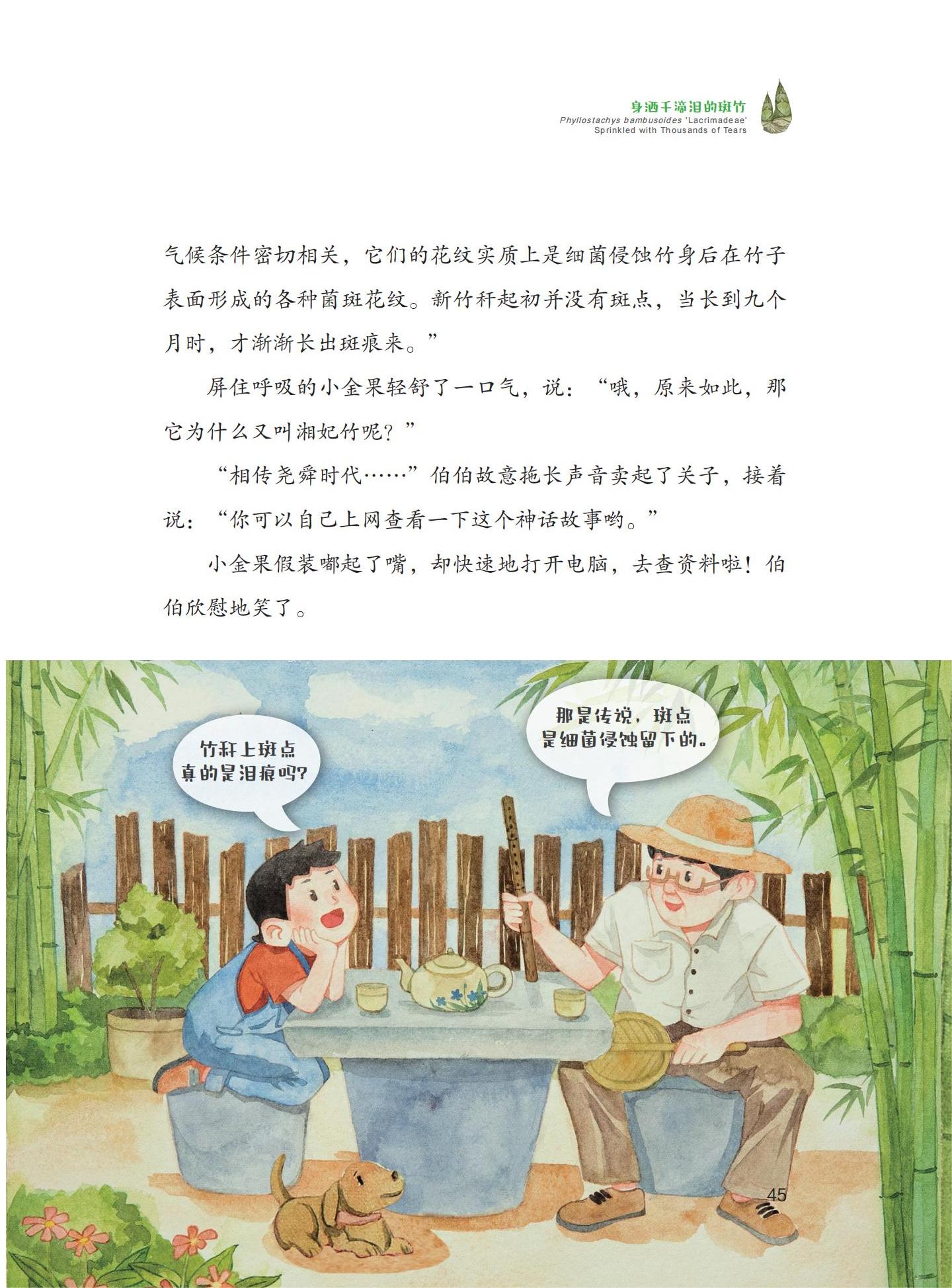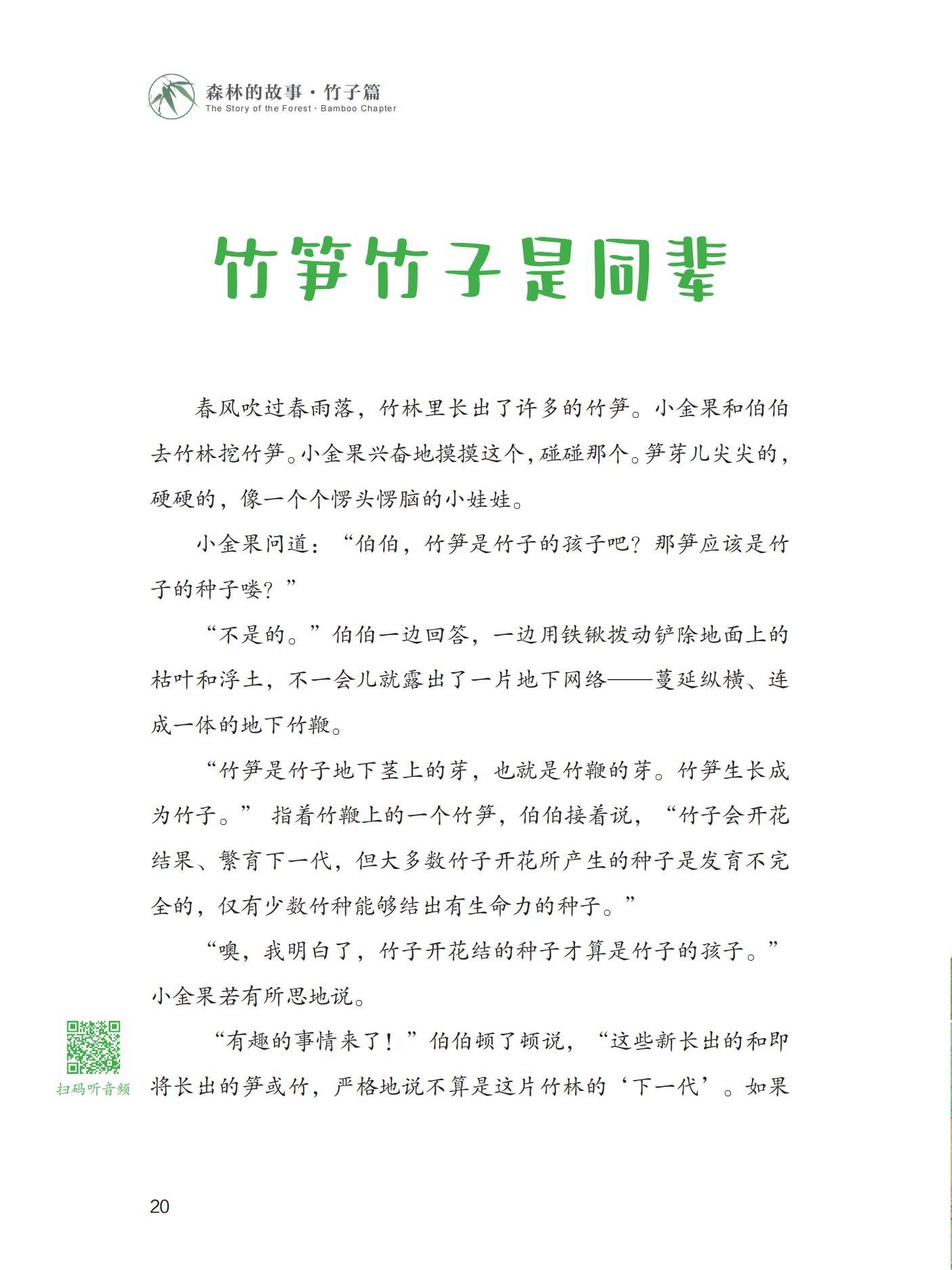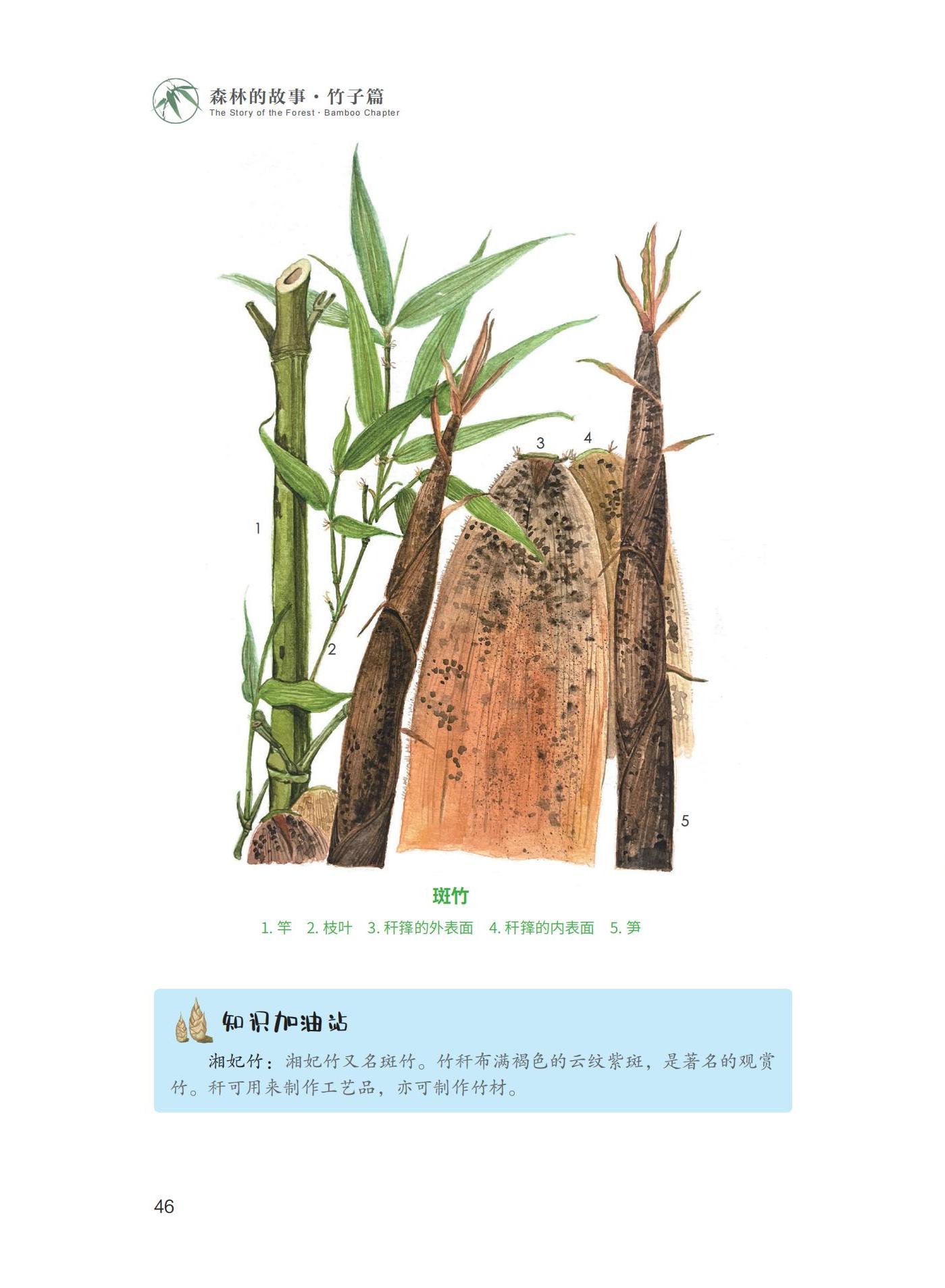 《森林的故事·竹子篇》一书,以竹类科学研究成果为基础,以少儿为科普对象,分为“观竹——胸中有成竹”“赏竹——青青四季同”“种竹——无竹令人俗”“用竹——不可居无竹”“爱竹——情寄幽篁间”“护竹——大熊猫与竹”六个篇章,围绕竹子的形态生理、品种类型、生产经营、加工利用、传统文化和永续发展等方面的专业知识,通过科学家伯伯与孩童小金果在生活中的观察记录和学习中的所思所想,采取故事的表现形式,用通俗易懂的儿童语言,生动、有效、全方位地传播竹子知识。