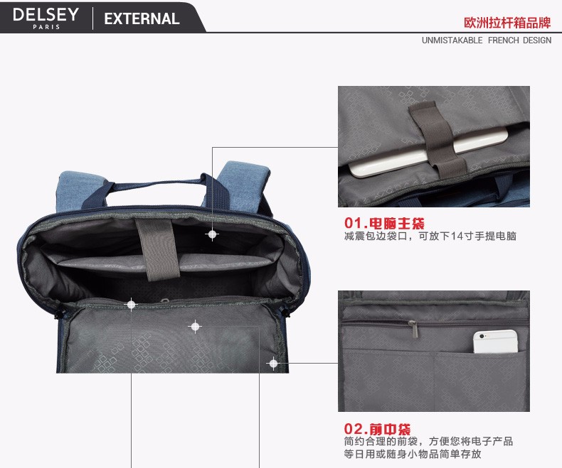 Delsey/戴乐世 双肩包 男女休闲背包 学生双肩书包 蓝色