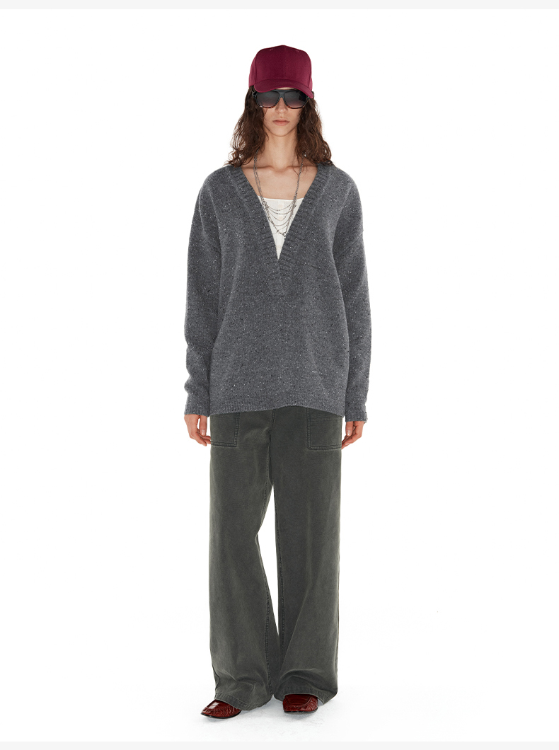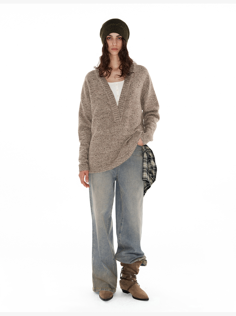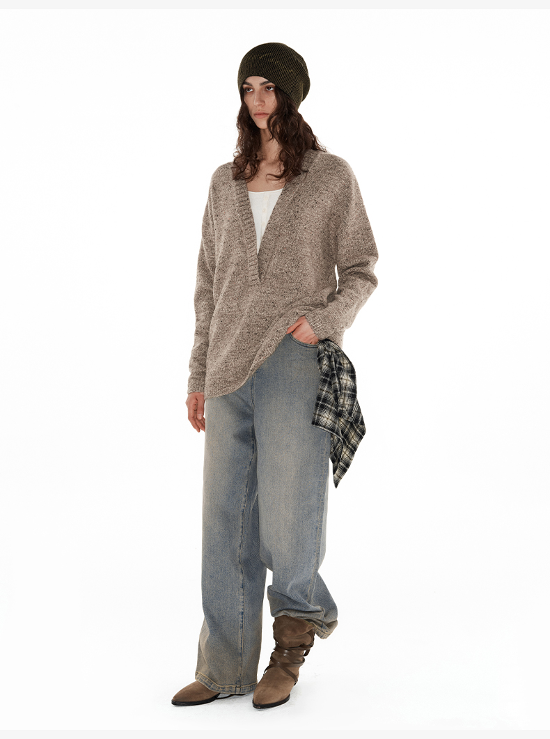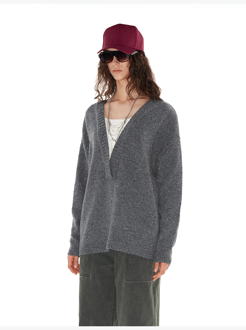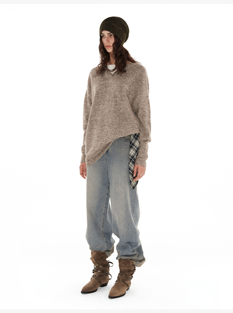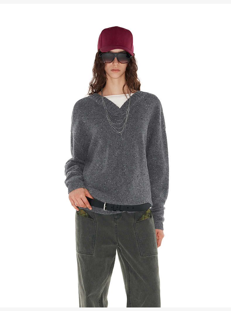 NUTH 深V领两穿宽松毛衣拼接假两件设计套头慵懒针织毛衣女