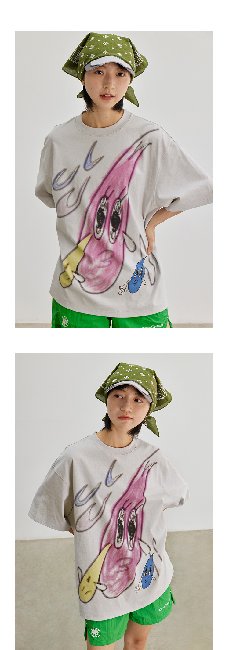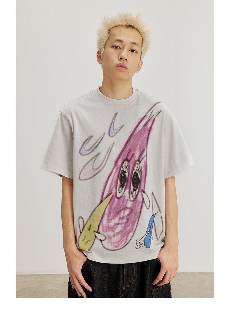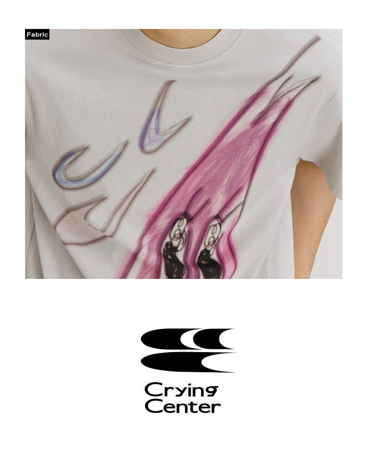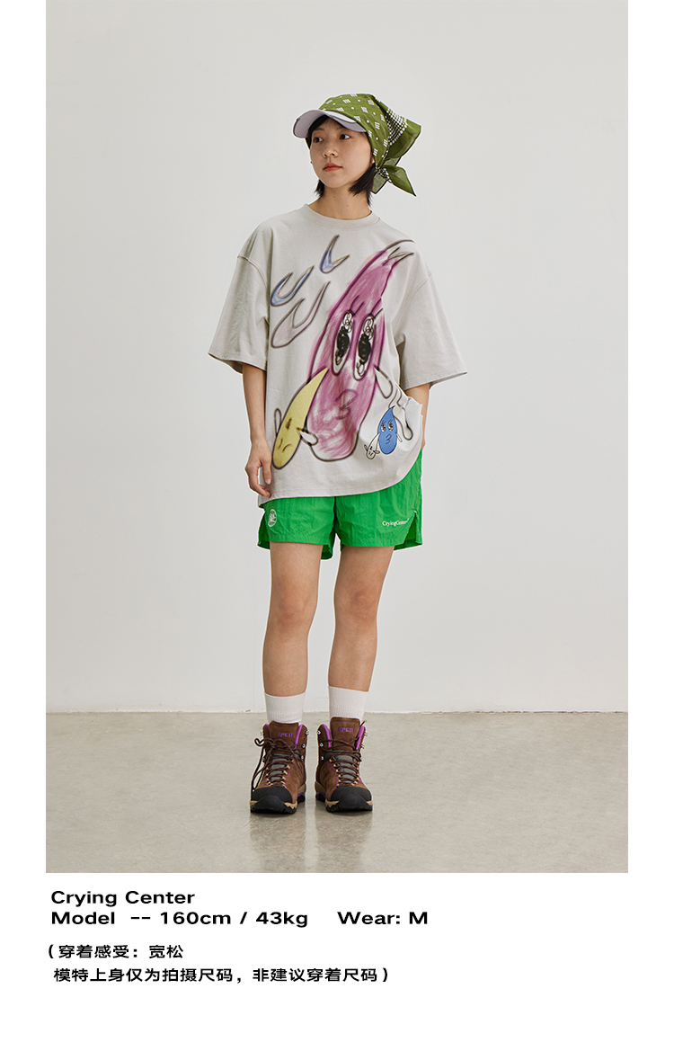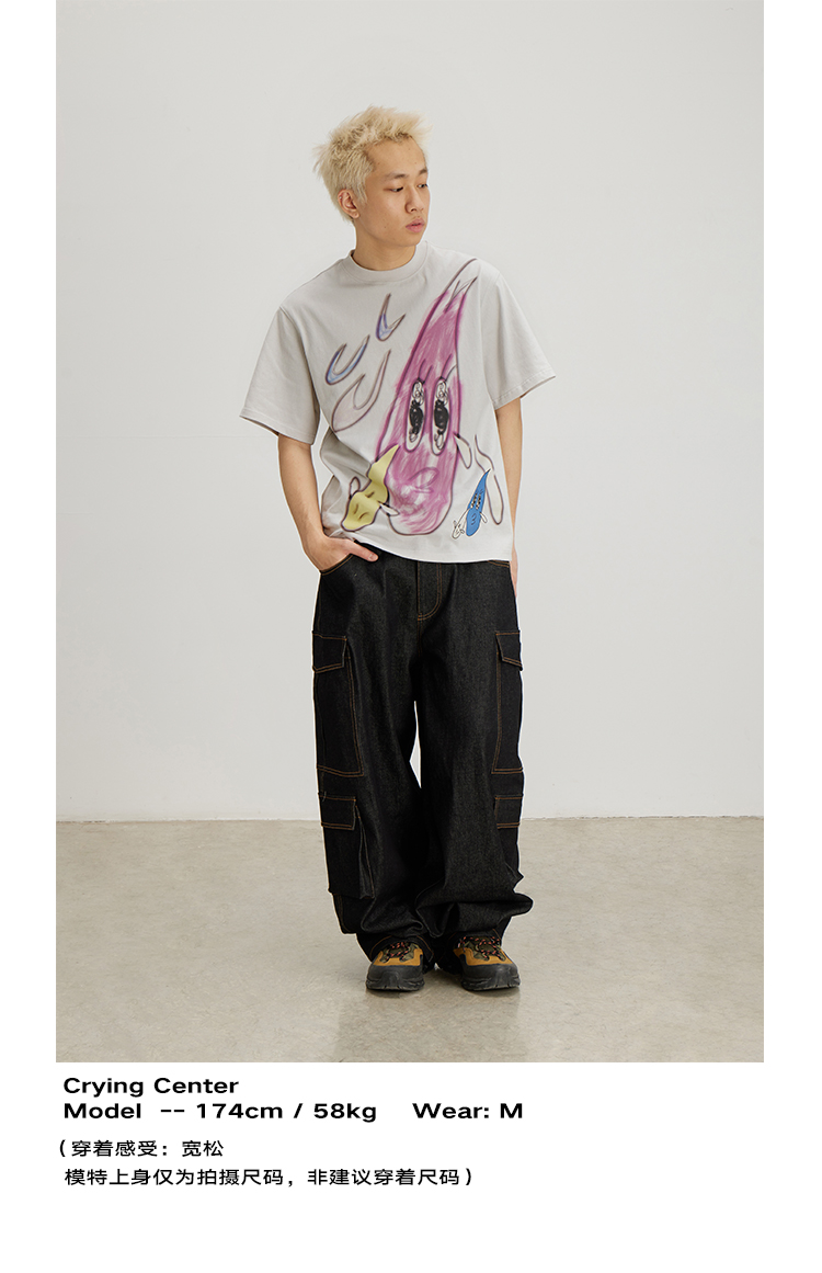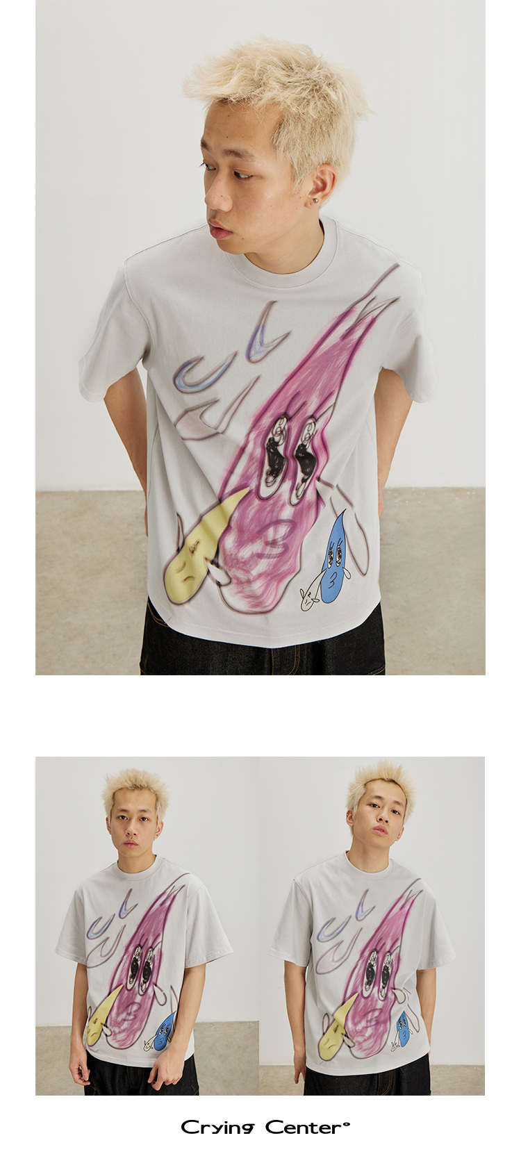 CryingCenter手绘大眼泪卡通街头TEE宽松纯棉浅灰嘻哈风情侣短袖