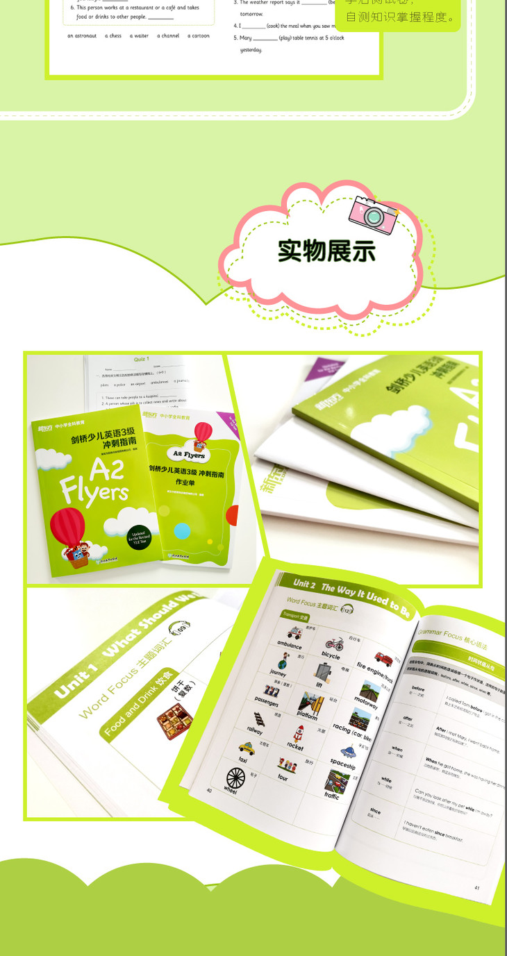 《剑桥少儿英语3级 冲刺指南》专门针对剑桥YLE A2 Flyers考试设计,包含冲刺指南、作业单和小测验,内容囊括考纲词汇、核心语法、题型解析等,帮助考生顺利夺满盾!