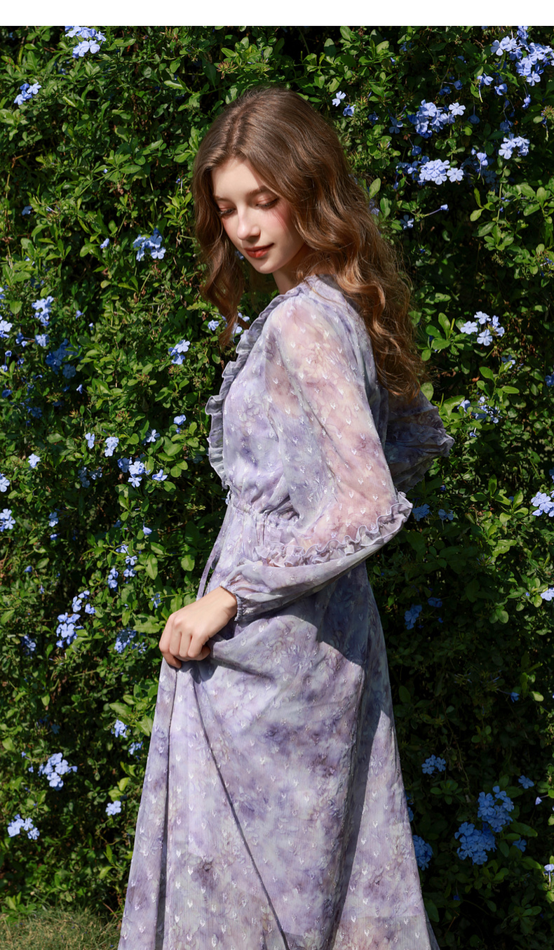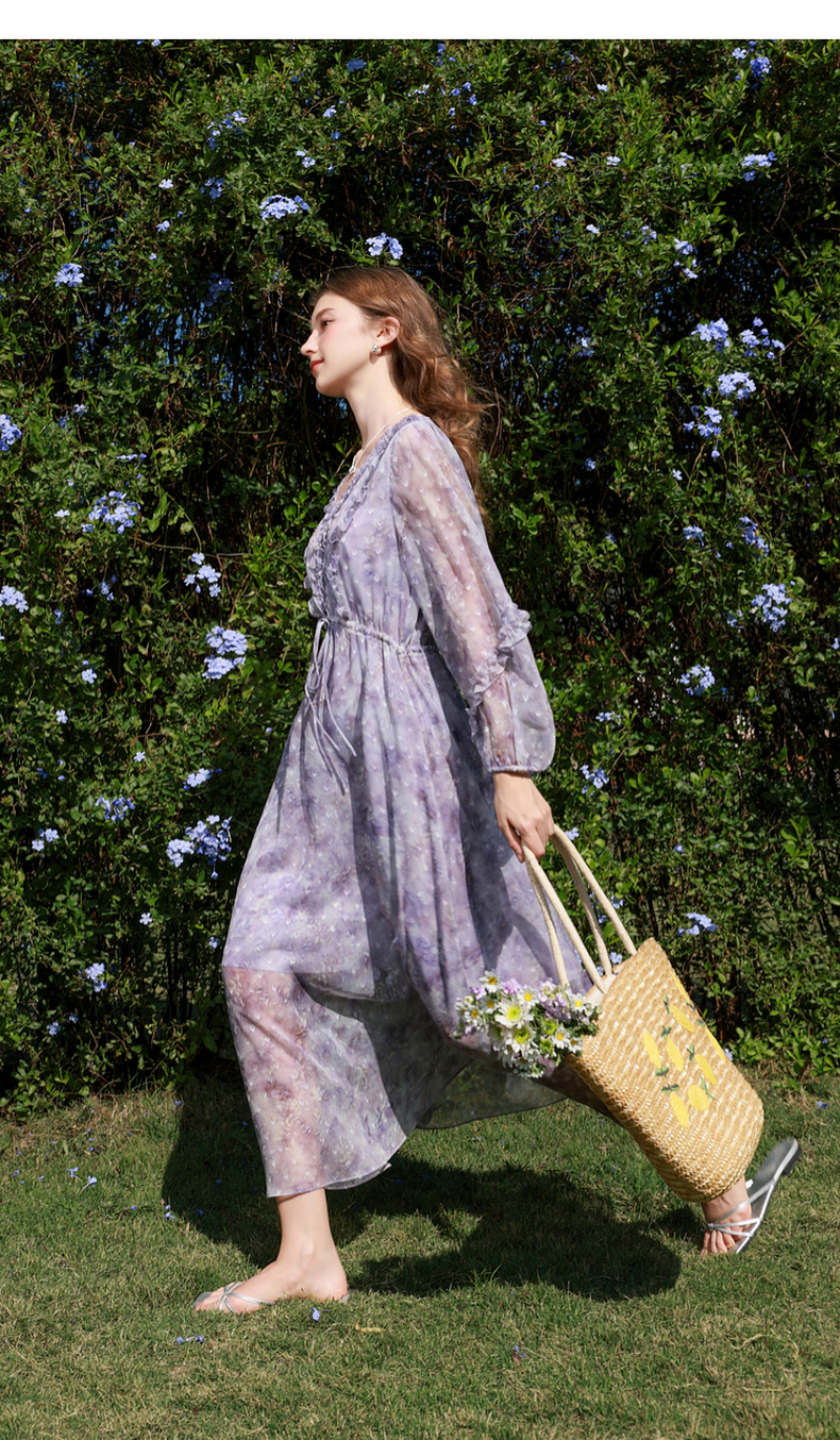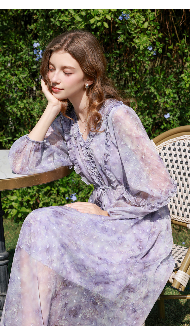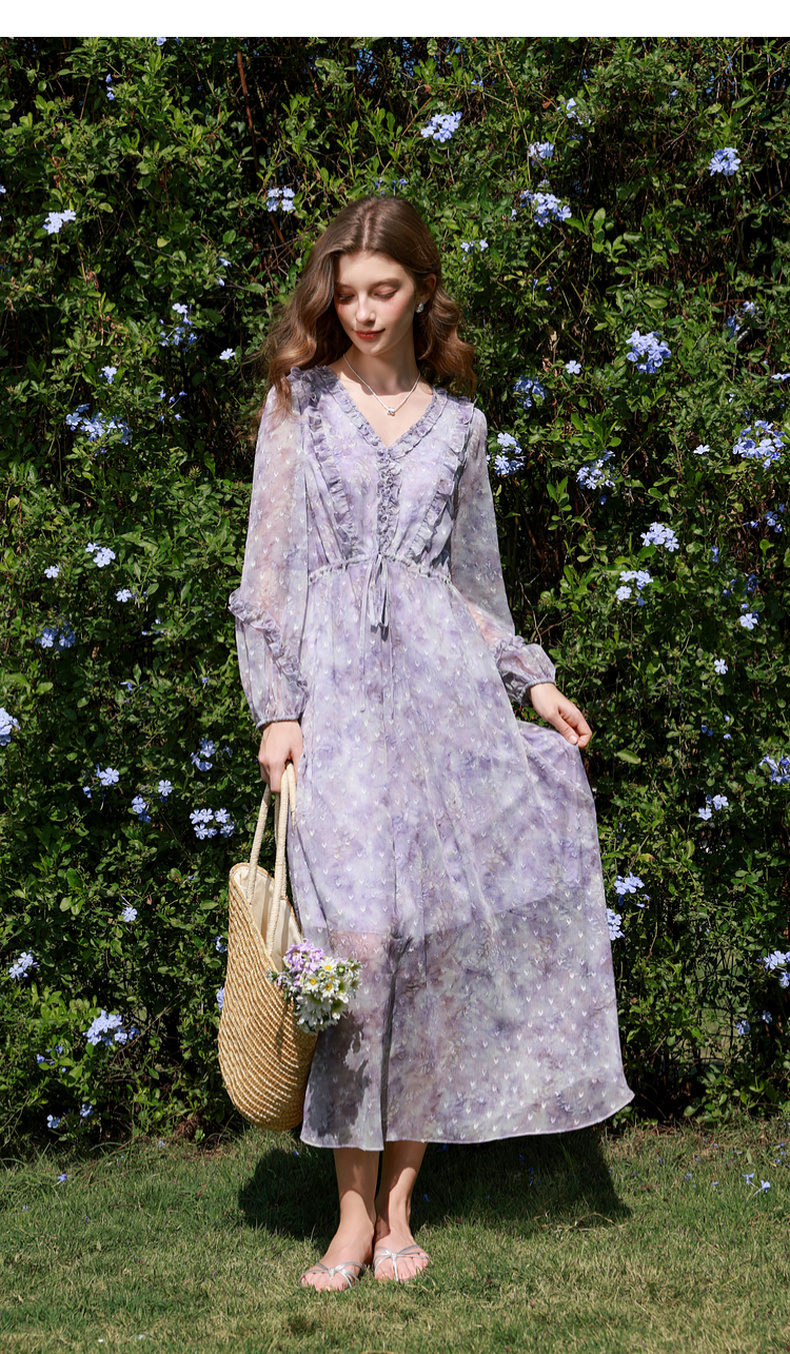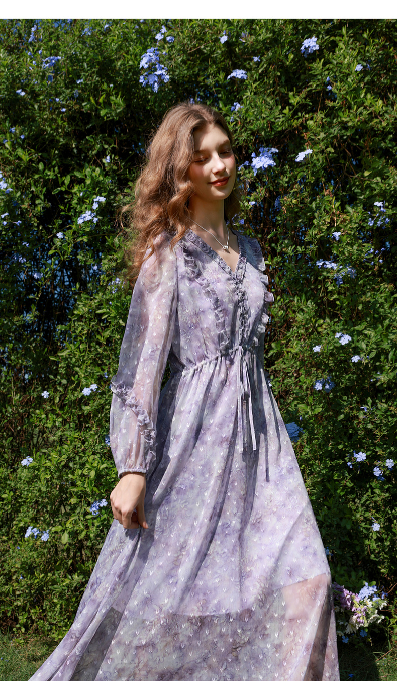 三彩2026春季新款木耳边V领印花连衣裙长袖系带收腰A字裙长裙M