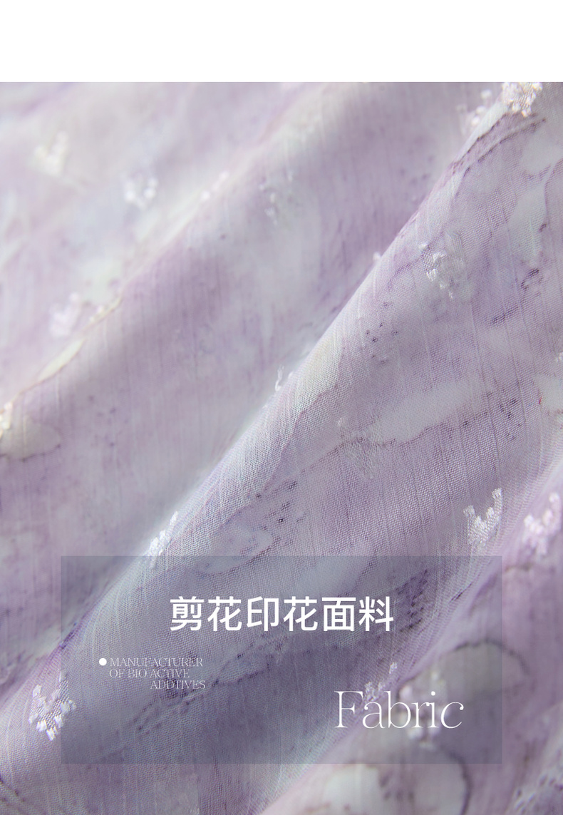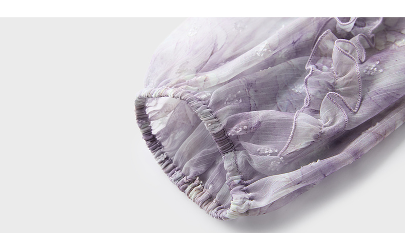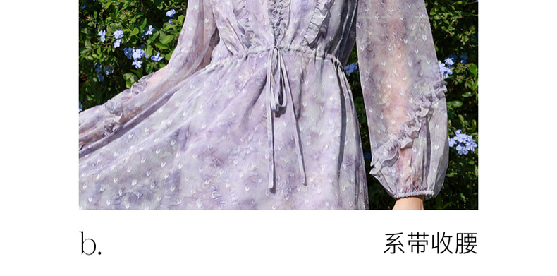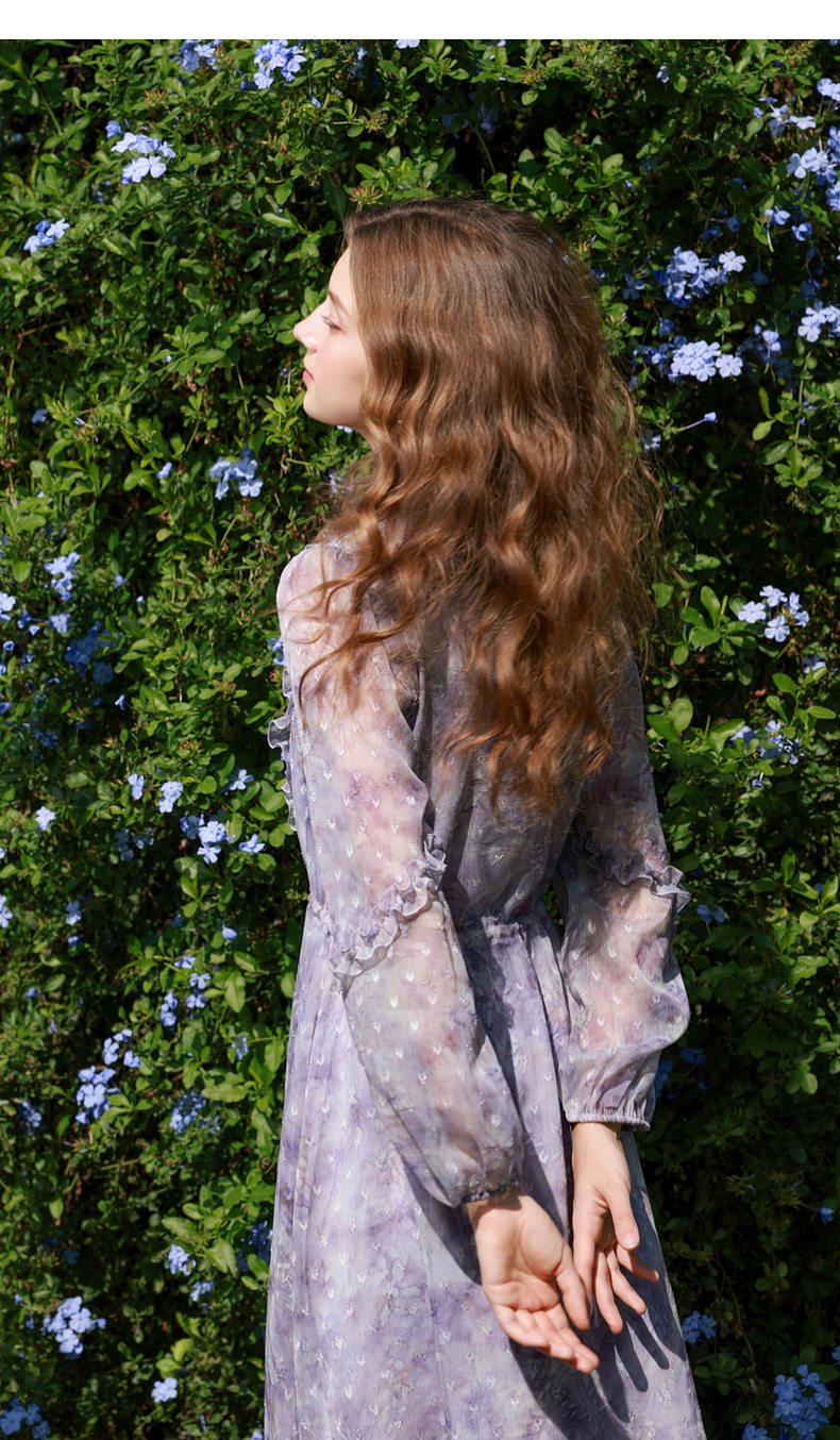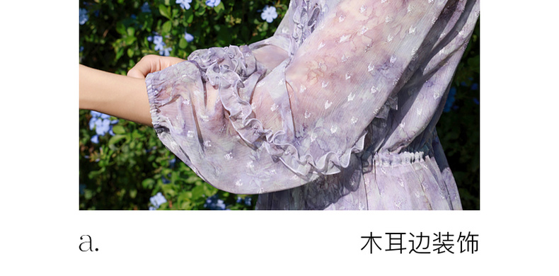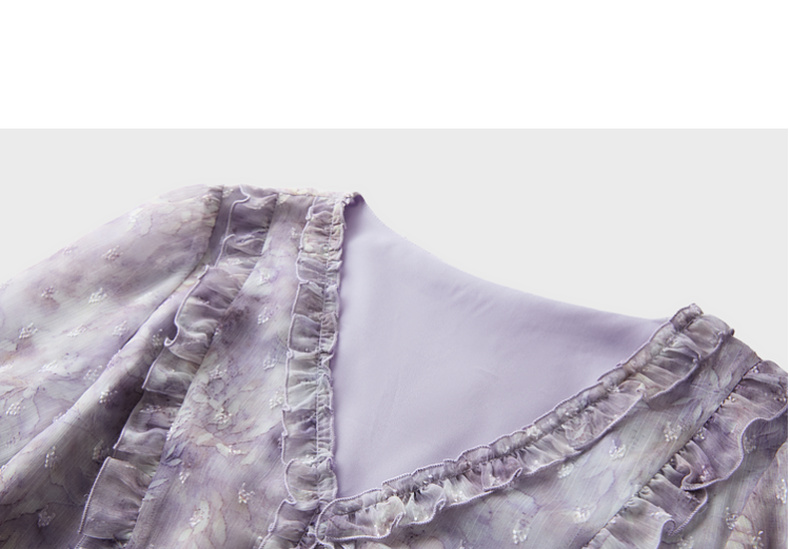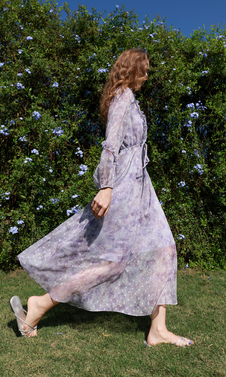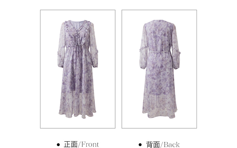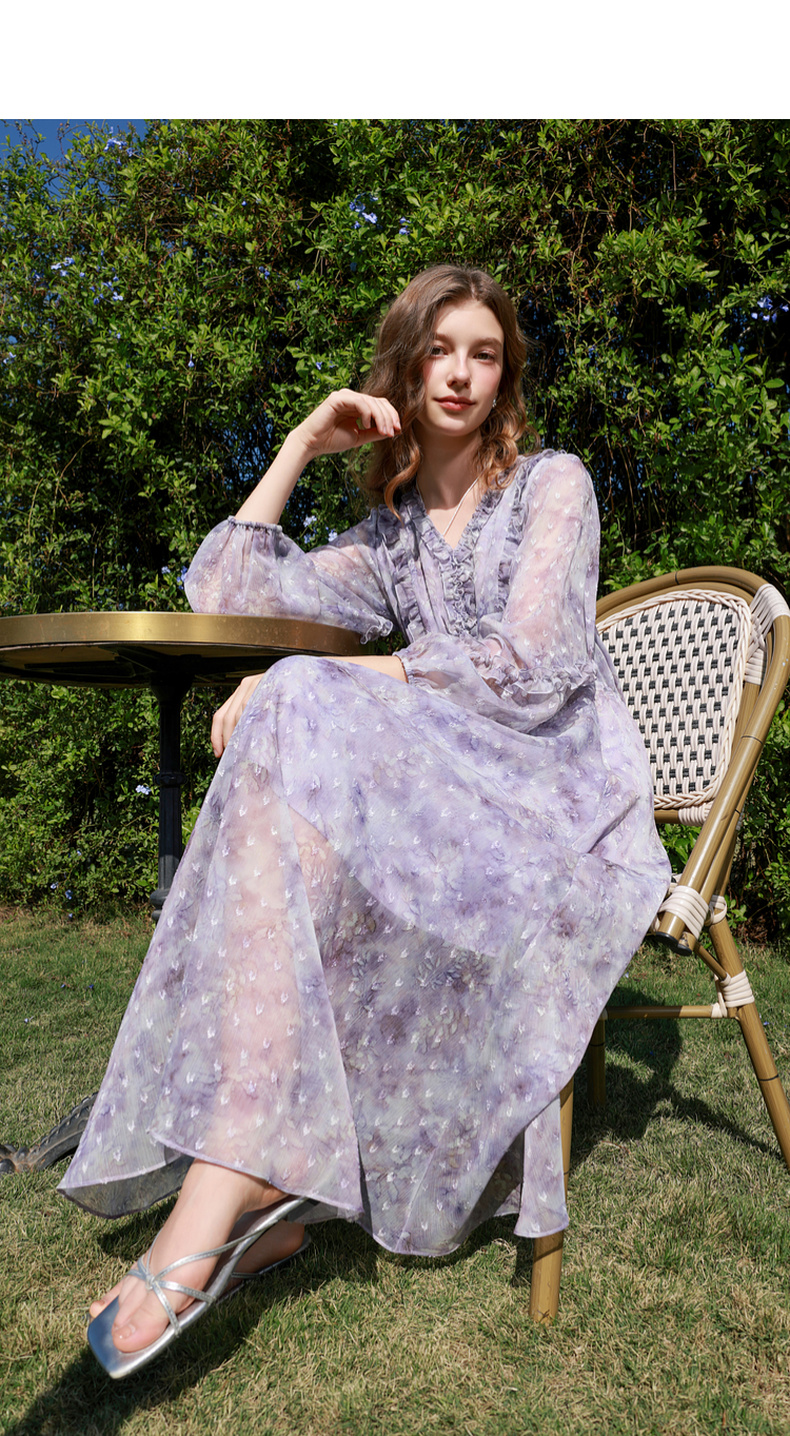 三彩2026春季新款木耳边V领印花连衣裙长袖系带收腰A字裙长裙M