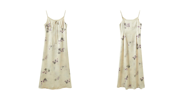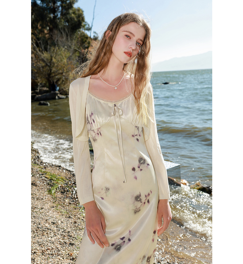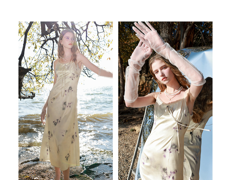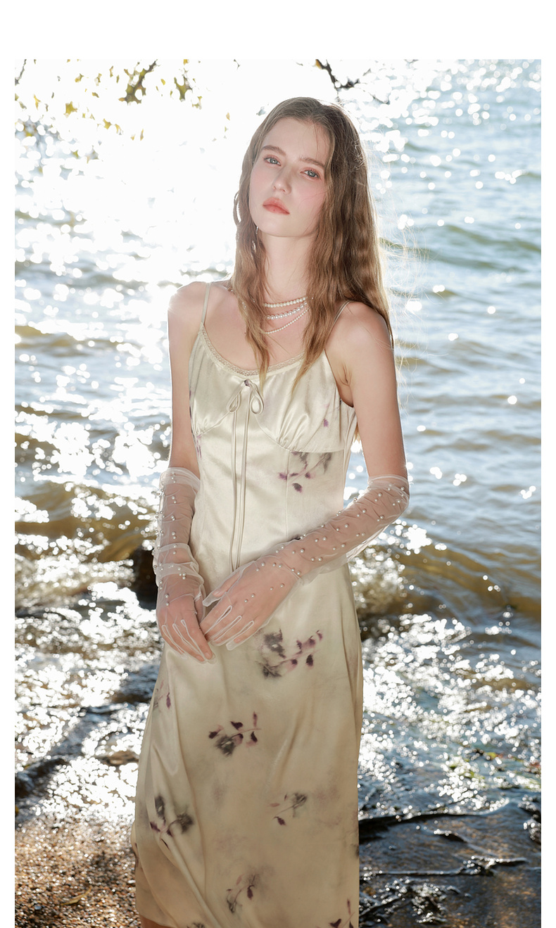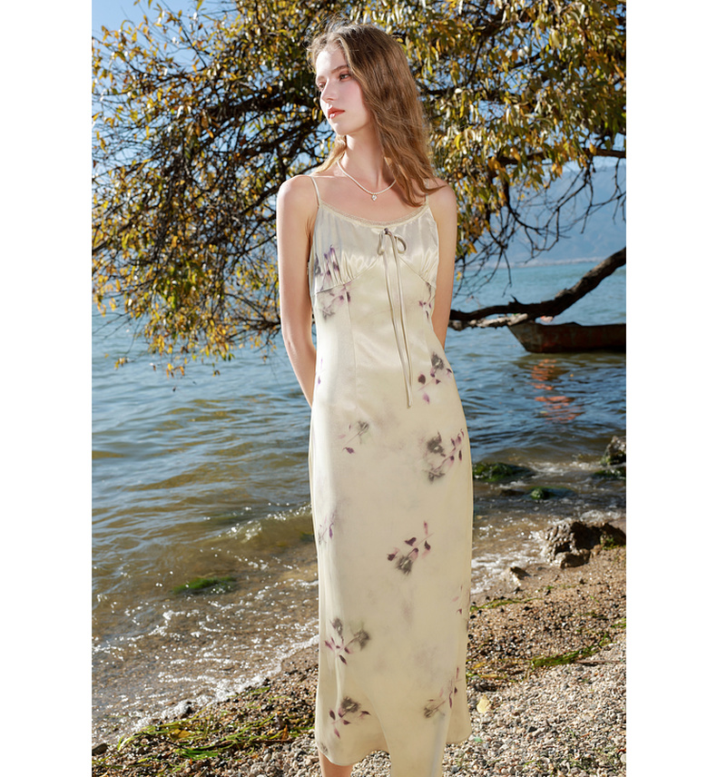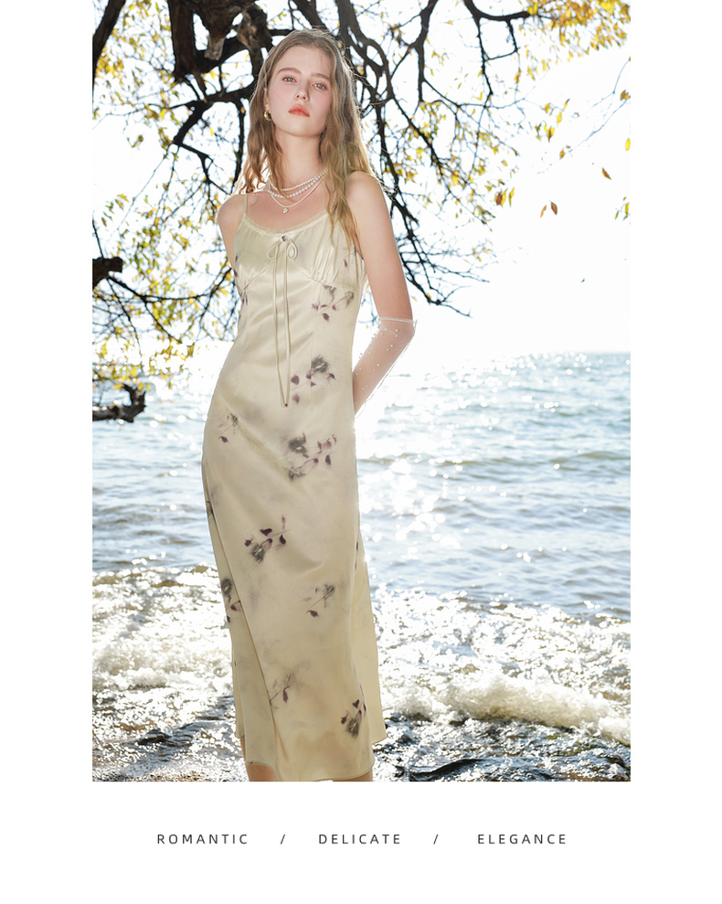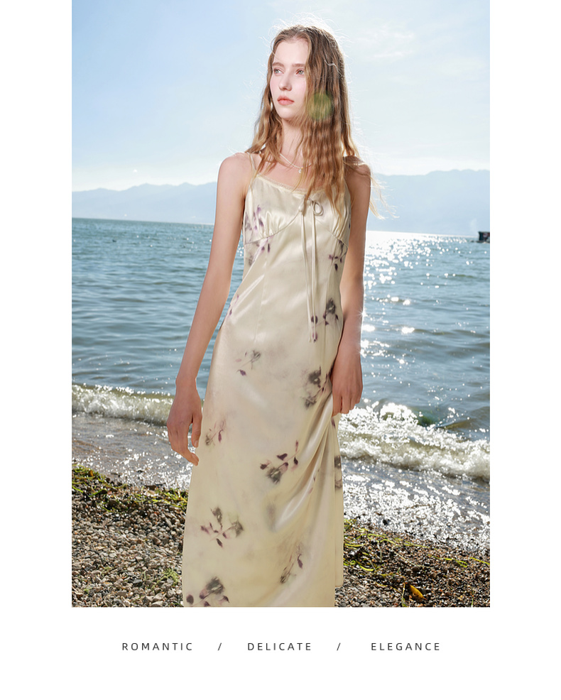 三彩2025春季新款蕾丝花边圆领吊带裙印花连衣裙法式浪漫M