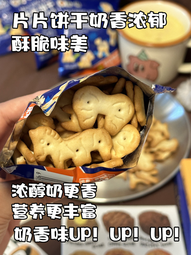 片片饼干奶香浓郁,酥脆味美 入口香浓,越嚼越香。 每一口都是好味道~ 奶香味UP!UP!UP!